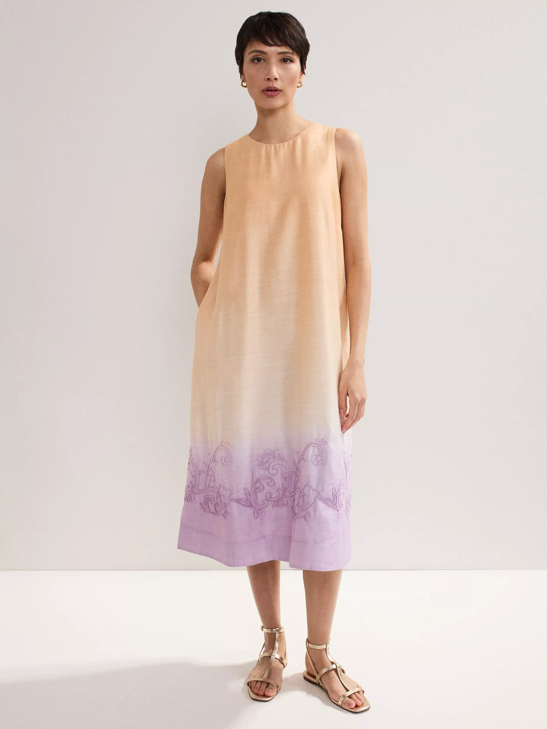 Meet the Elida dress. The beautiful ombre design is the perfect subtle pop of colour, finished with embroidered detailing at the hem for a contemporary update. Styled with your favourite sandals, the relaxed trapeze shape makes it perfect for warmer weather or your next holiday.