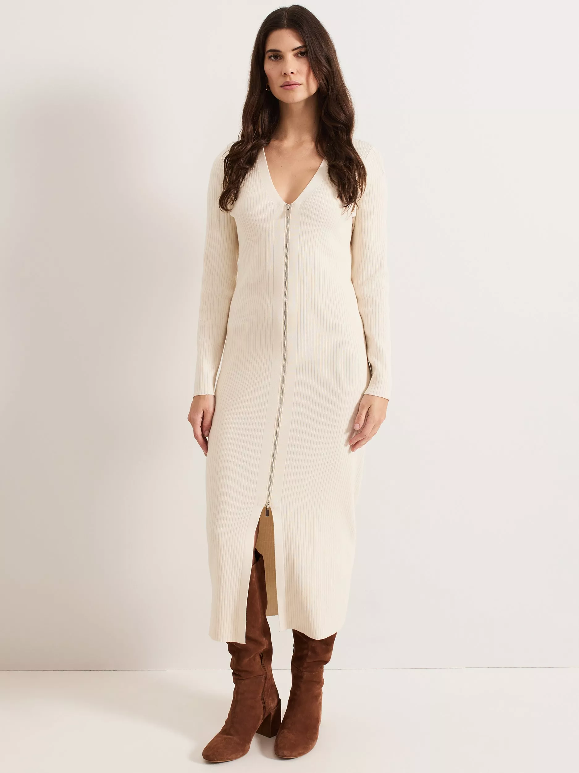 Every wardrobe needs a white midi dress. This softly ribbed knit skims your body to enhance your natural figure and is finished with a contemporary silver zip. The feminine V-neckline and understated front slit add allure for a timeless style that pairs perfectly with your favourite boots.