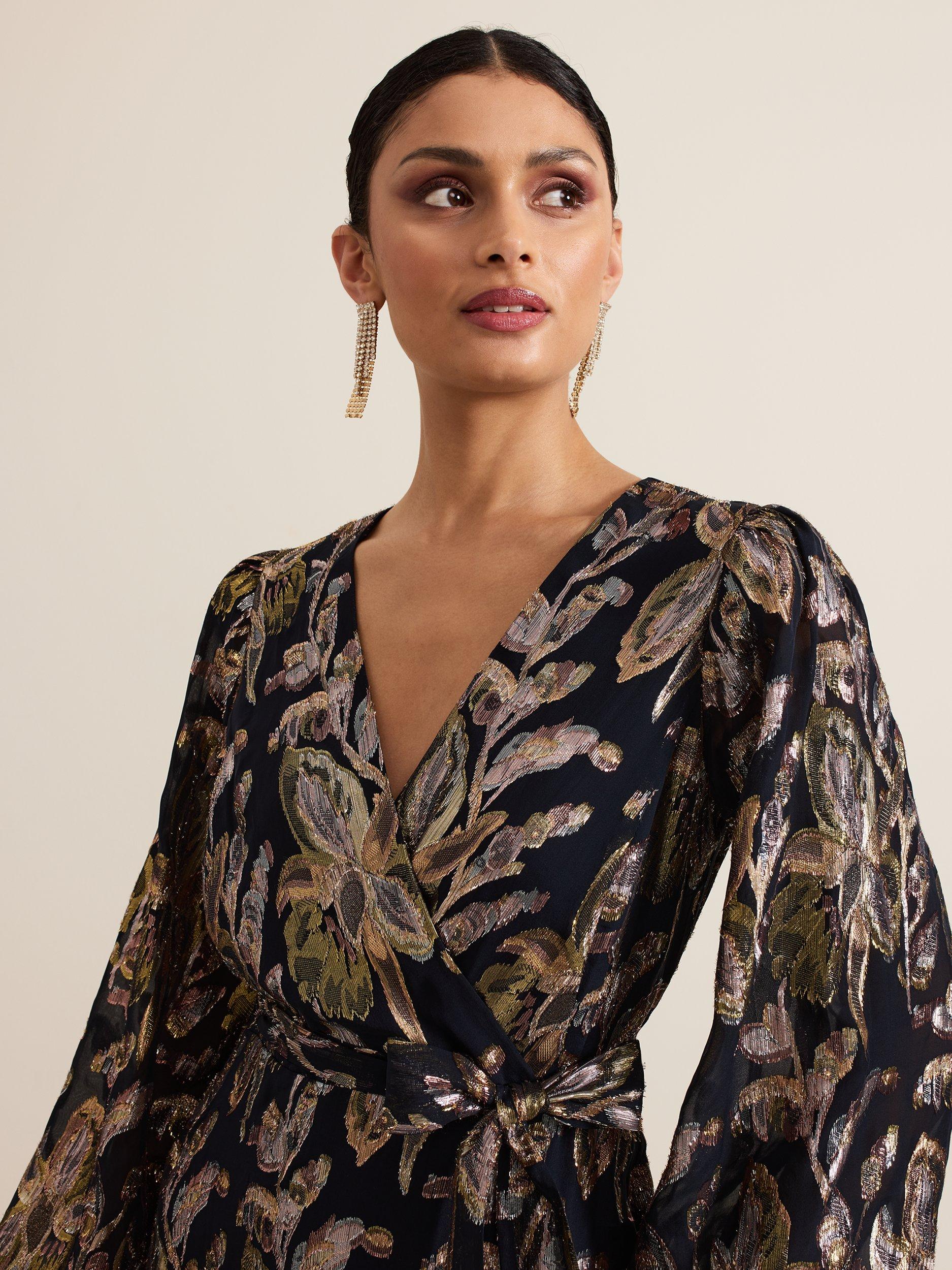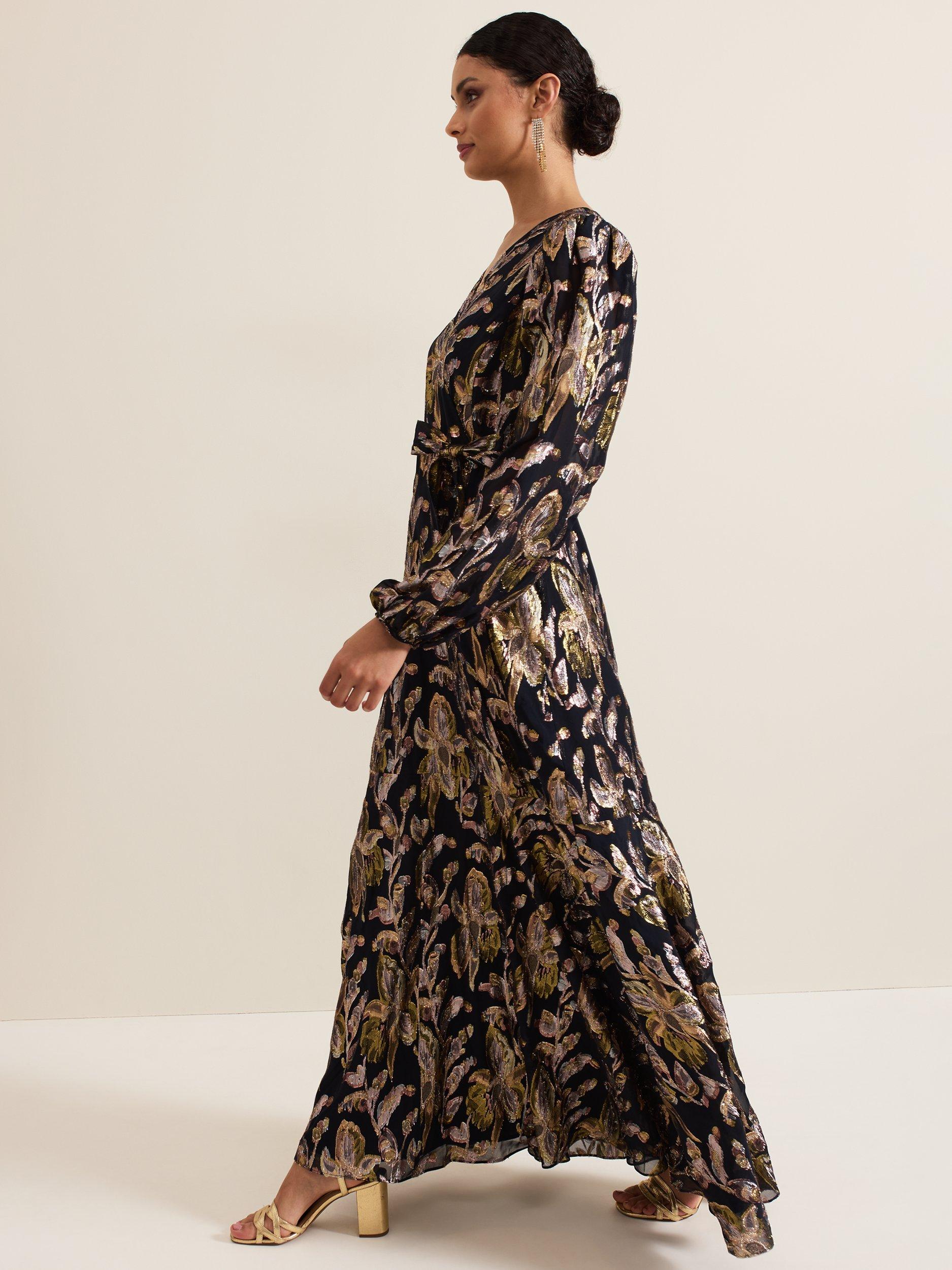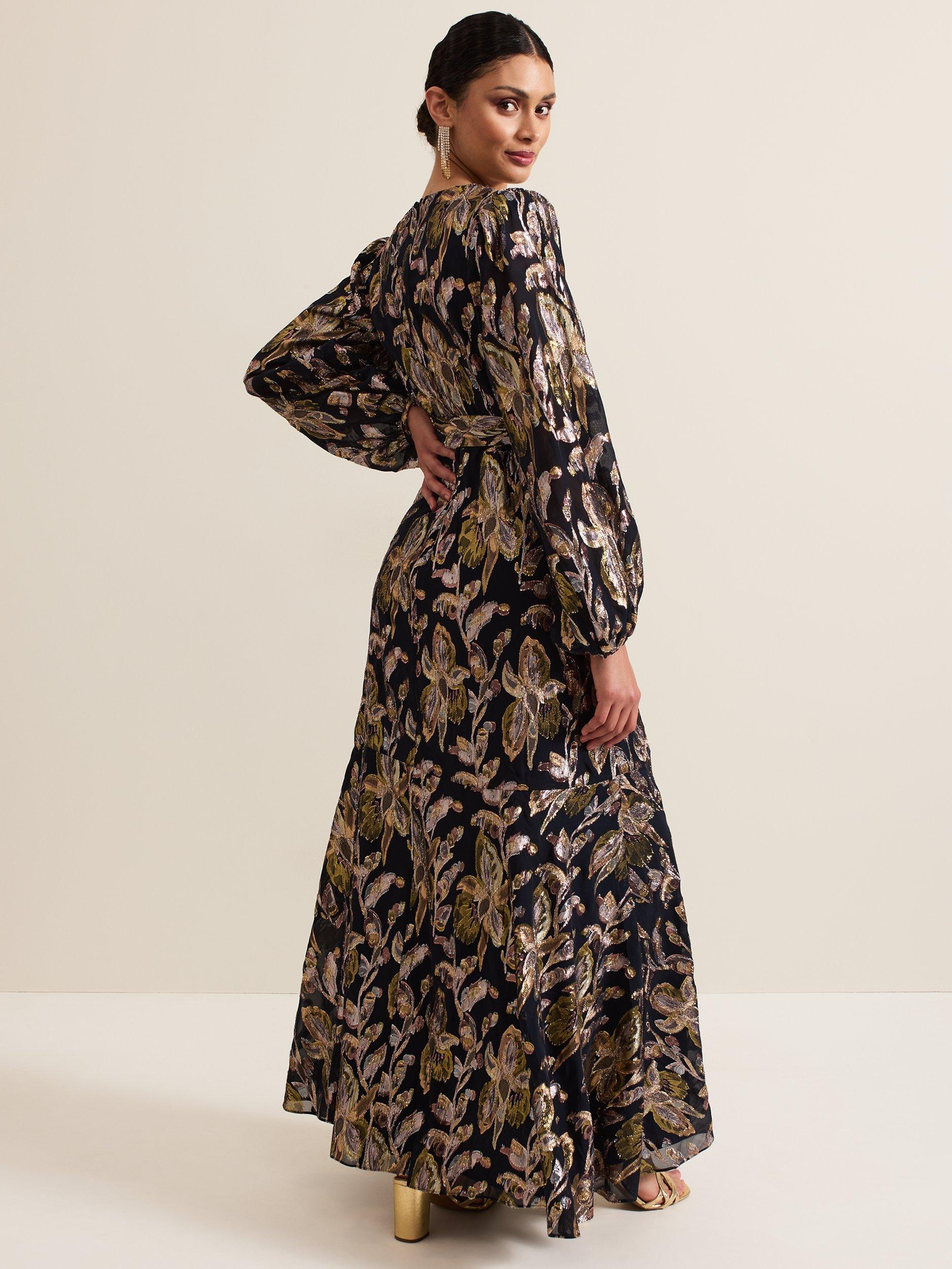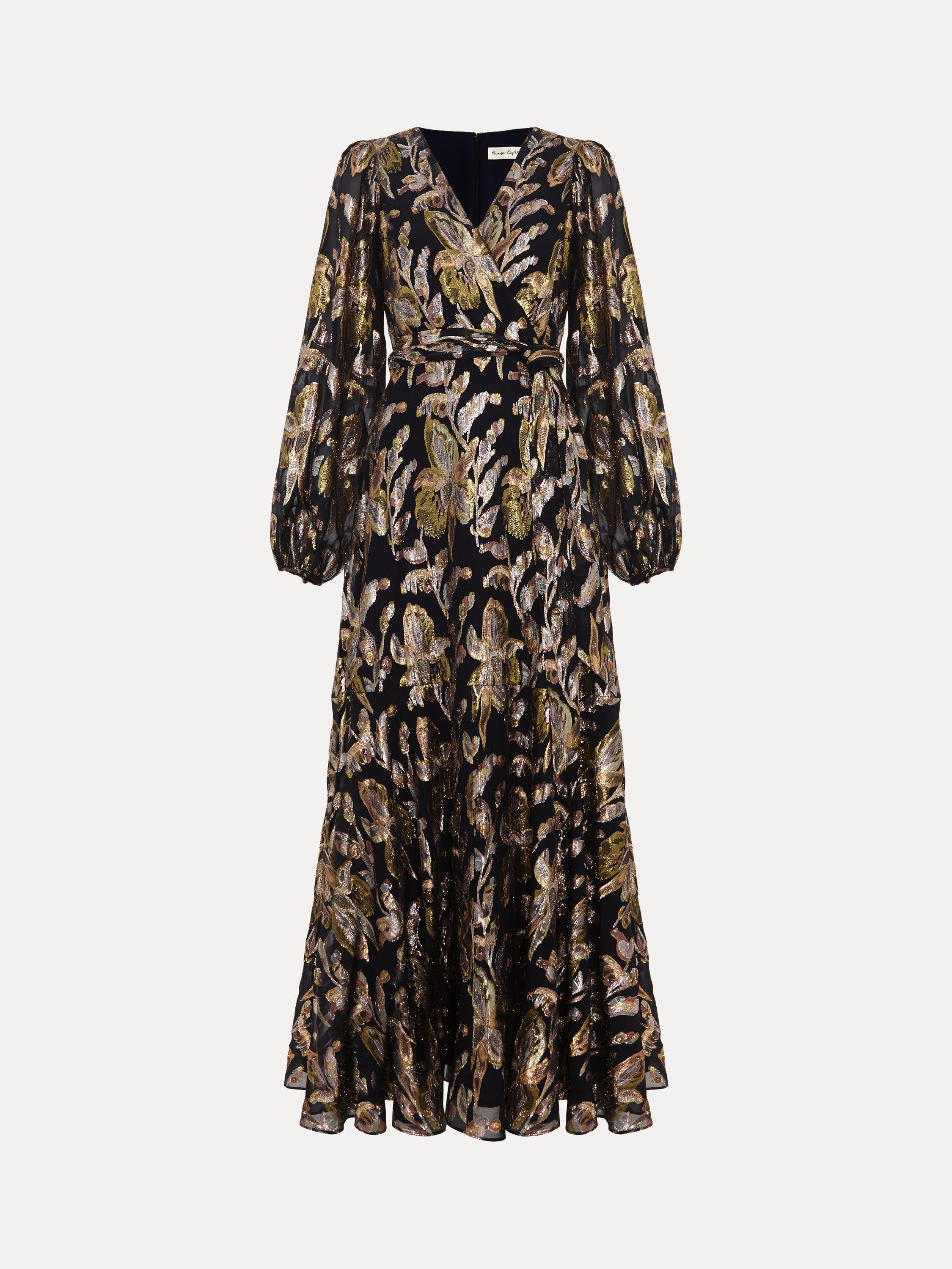 Cut from a premium silk blend, the Ellio dress is designed in a leaf pattern with metallic thread detailing, falling to a full maxi length. Featuring long semi-sheer blouson sleeves and a matching tie waist belt it is the perfect feminine style to pair with gold accessories for your next event.