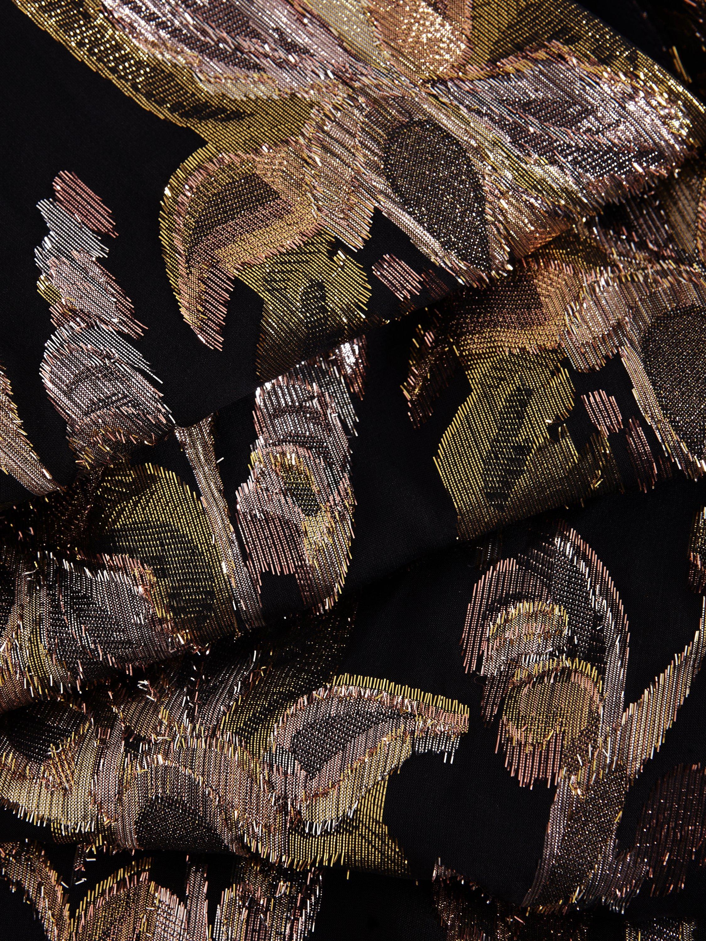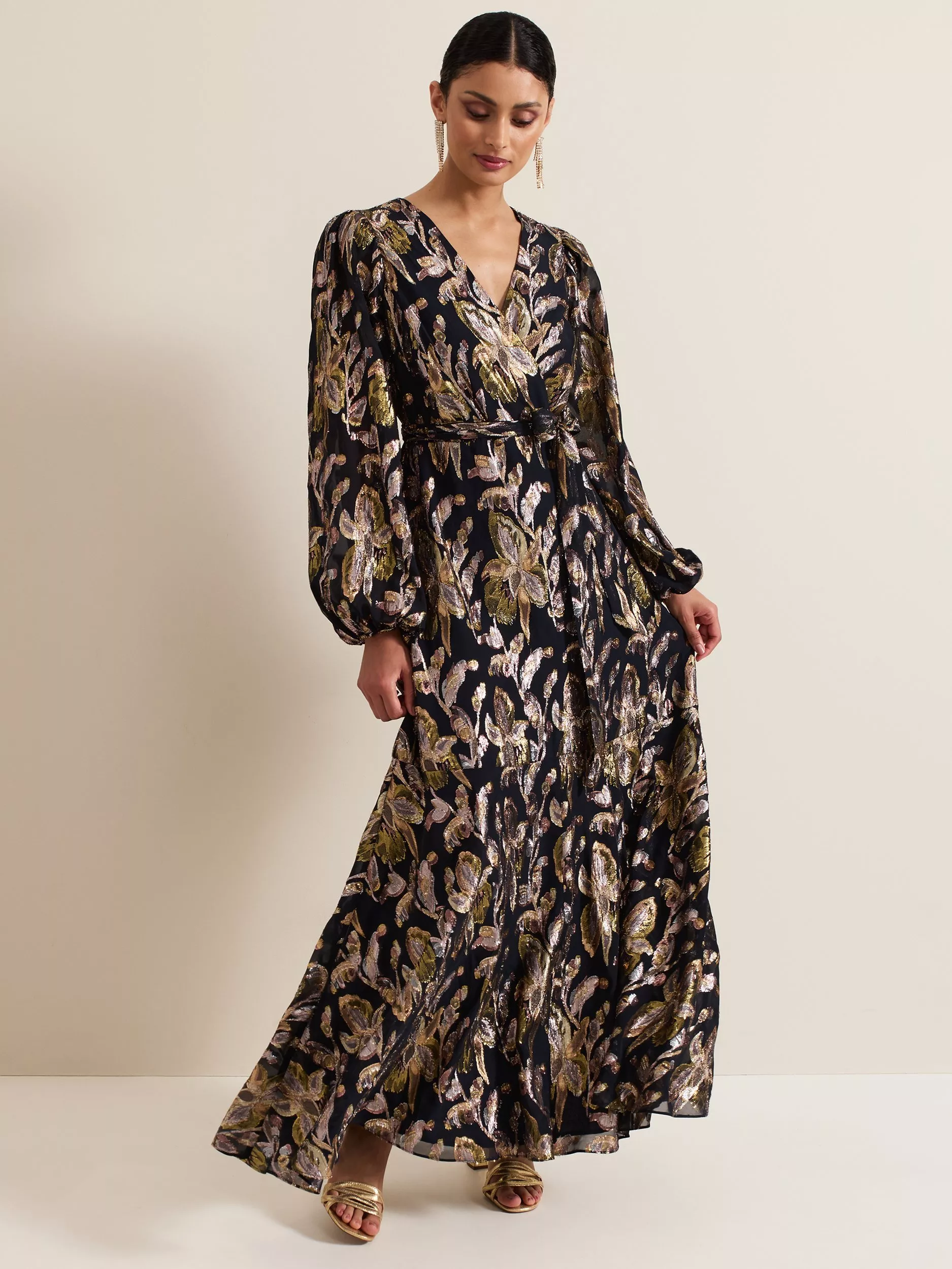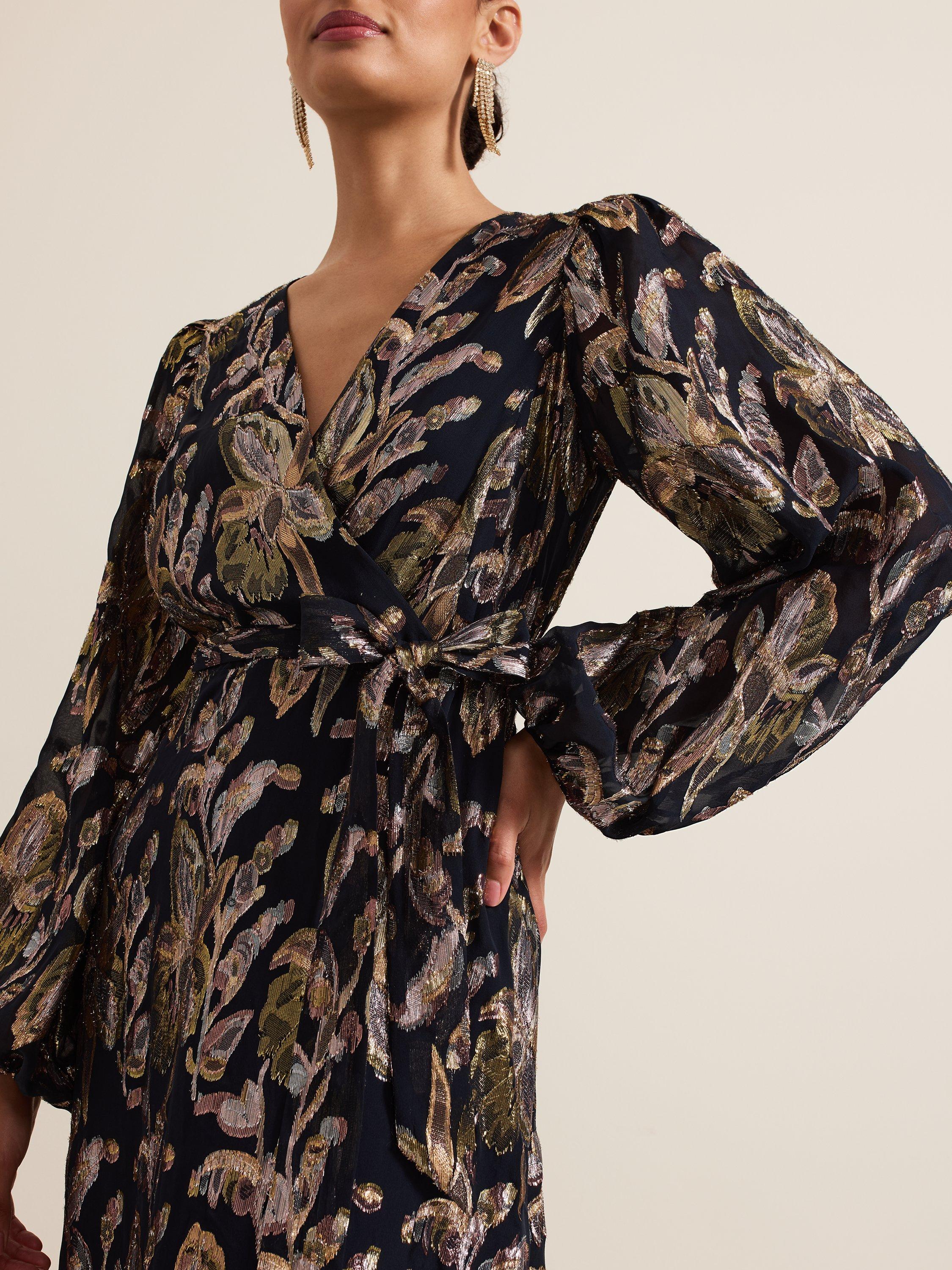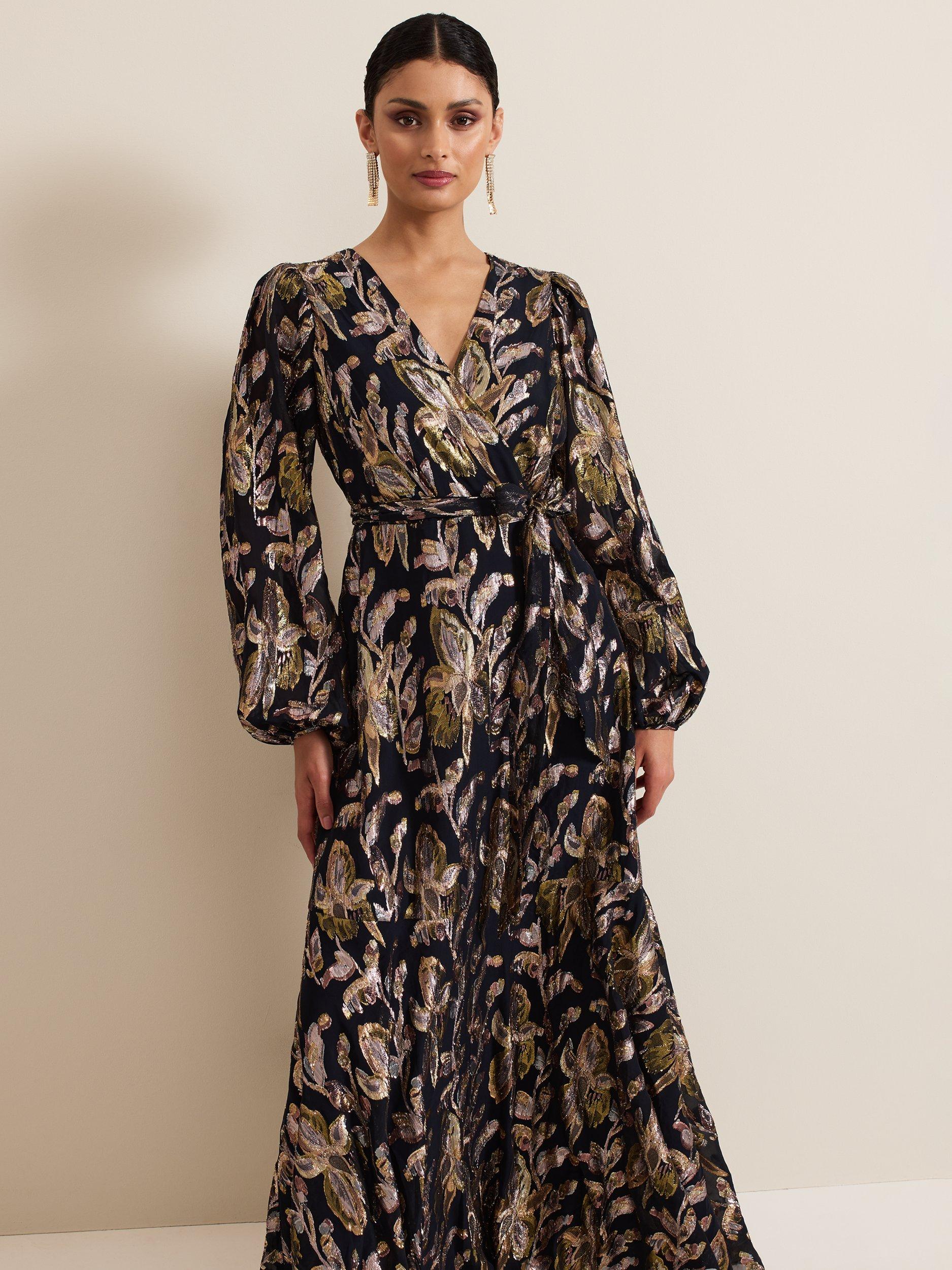 Cut from a premium silk blend, the Ellio dress is designed in a leaf pattern with metallic thread detailing, falling to a full maxi length. Featuring long semi-sheer blouson sleeves and a matching tie waist belt it is the perfect feminine style to pair with gold accessories for your next event.