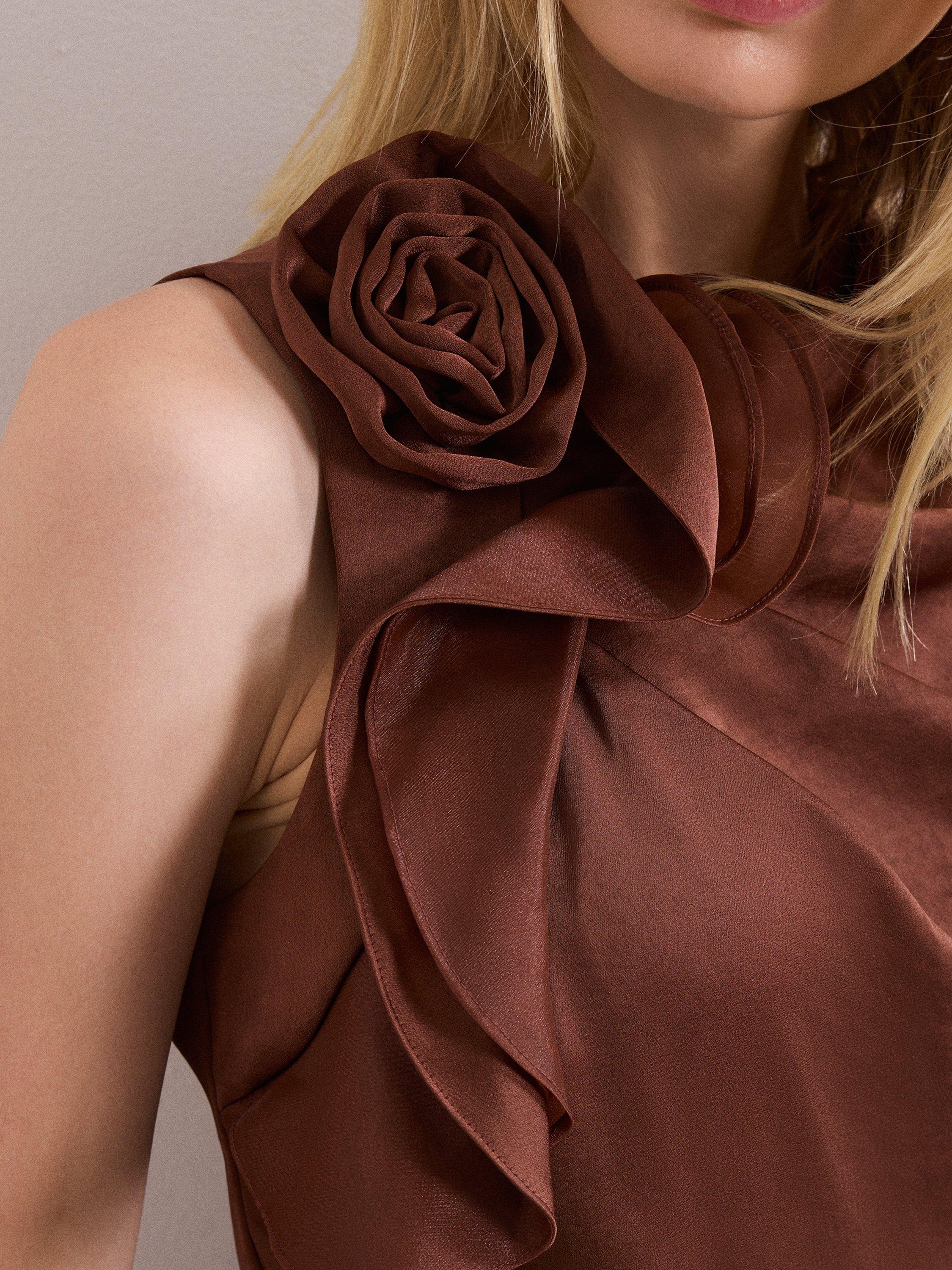 Step into any occasion with confidence. This sleeveless satin jumpsuit features a round neck and a 3D corsage detail, offering a comfortable fit and a modern look. Designed in a breezy wide-leg, it suits evening events or wedding celebrations alike.