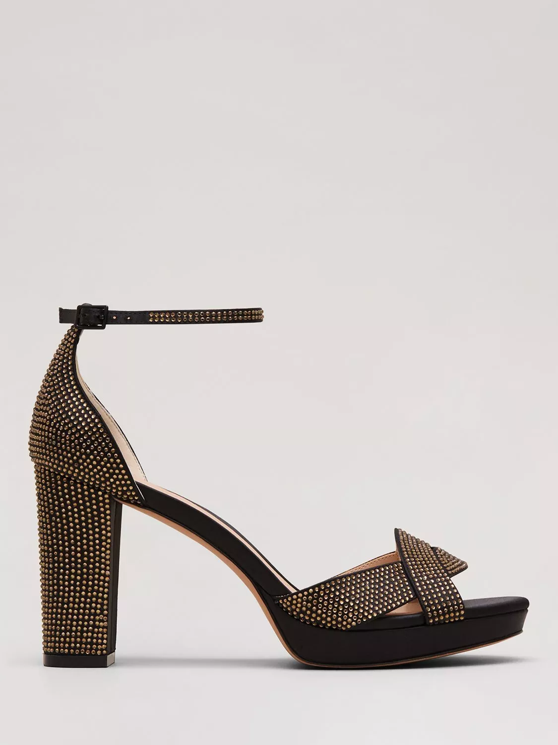 Designed with an open crossover toe and gold embellished stud detailing, these Phase Eight heels feature a block heel and buckle fastening at the ankle to ensure both comfort and style. Pair with a gold embellished tote for a coordinated look.