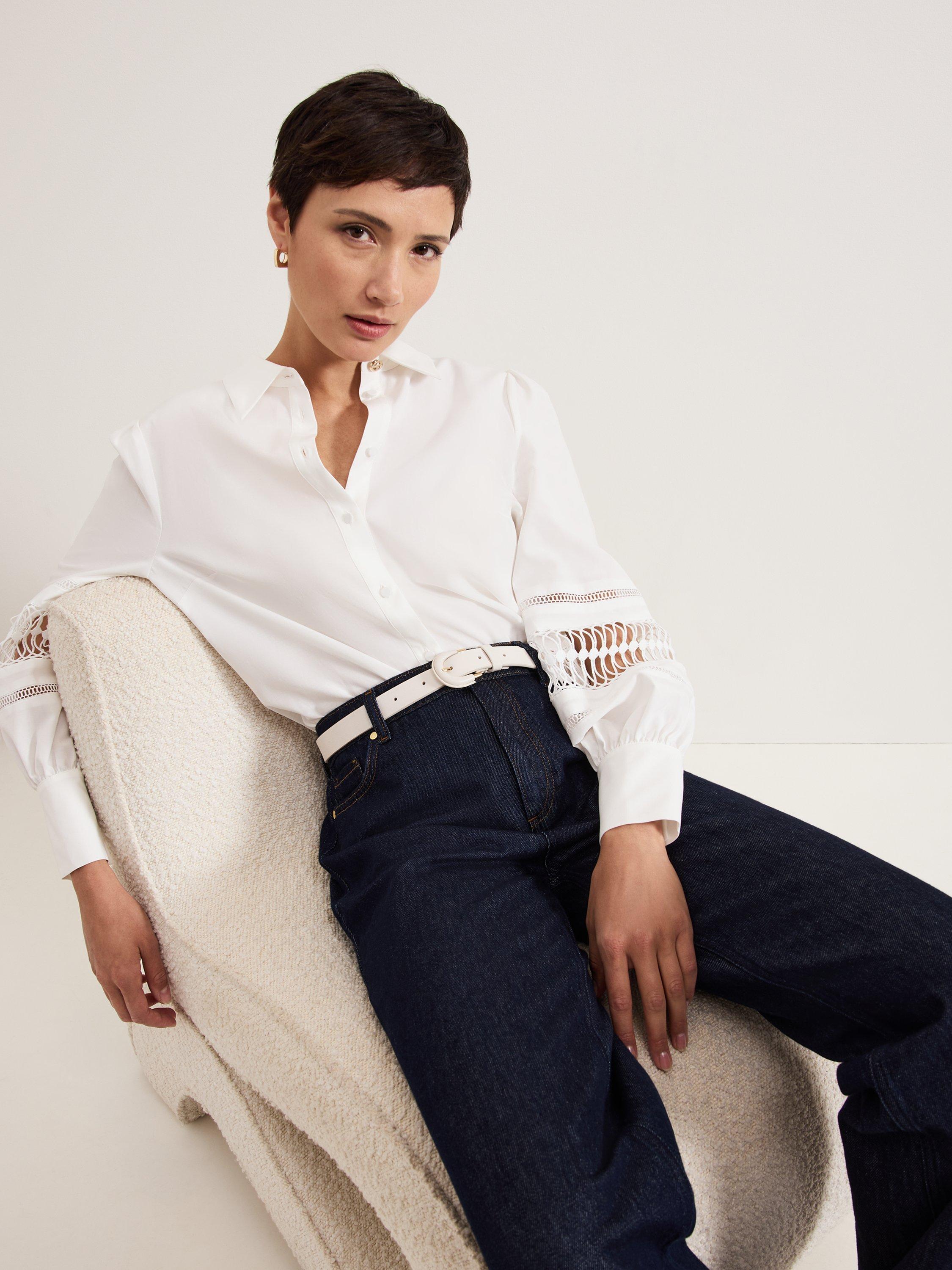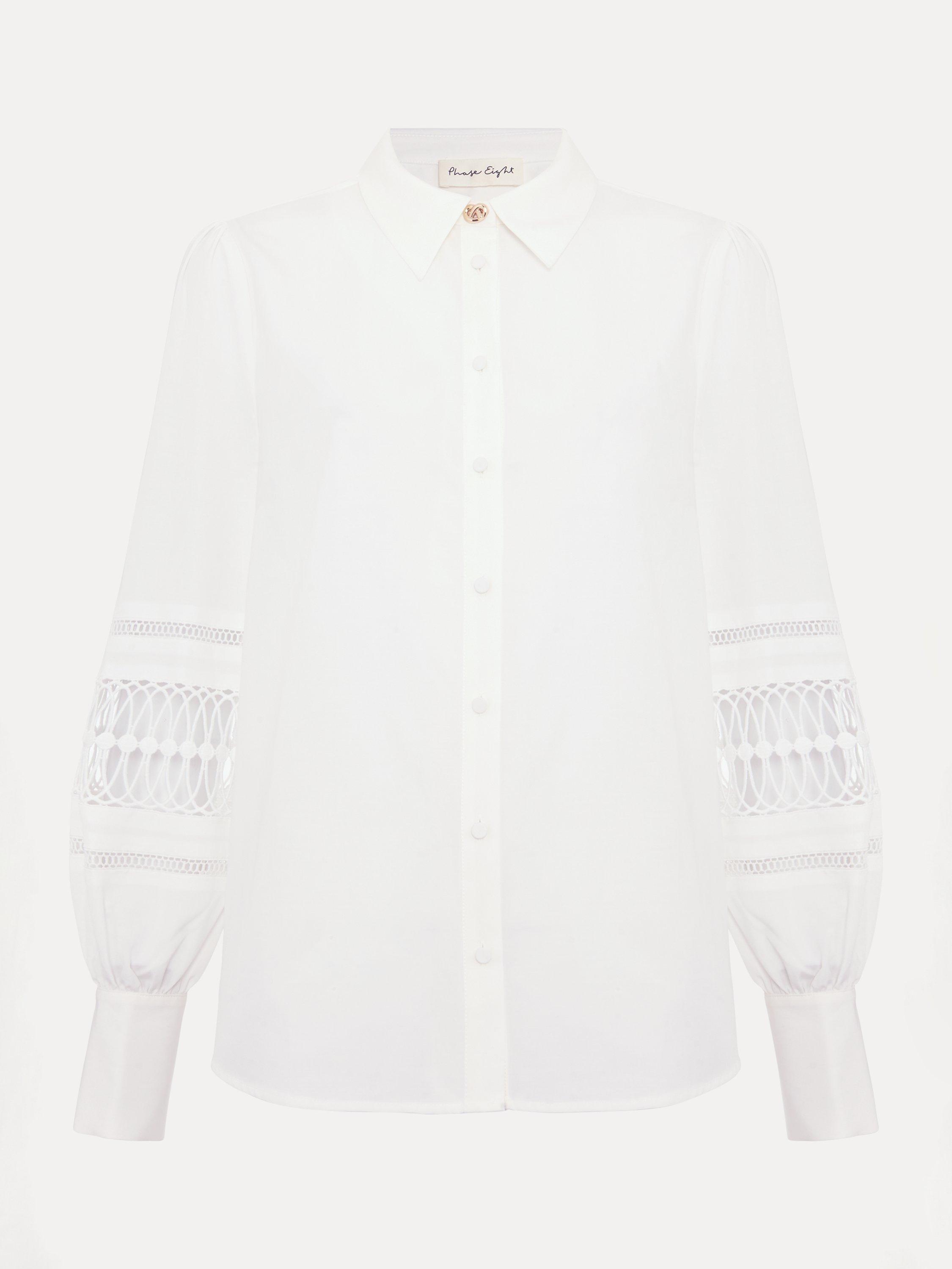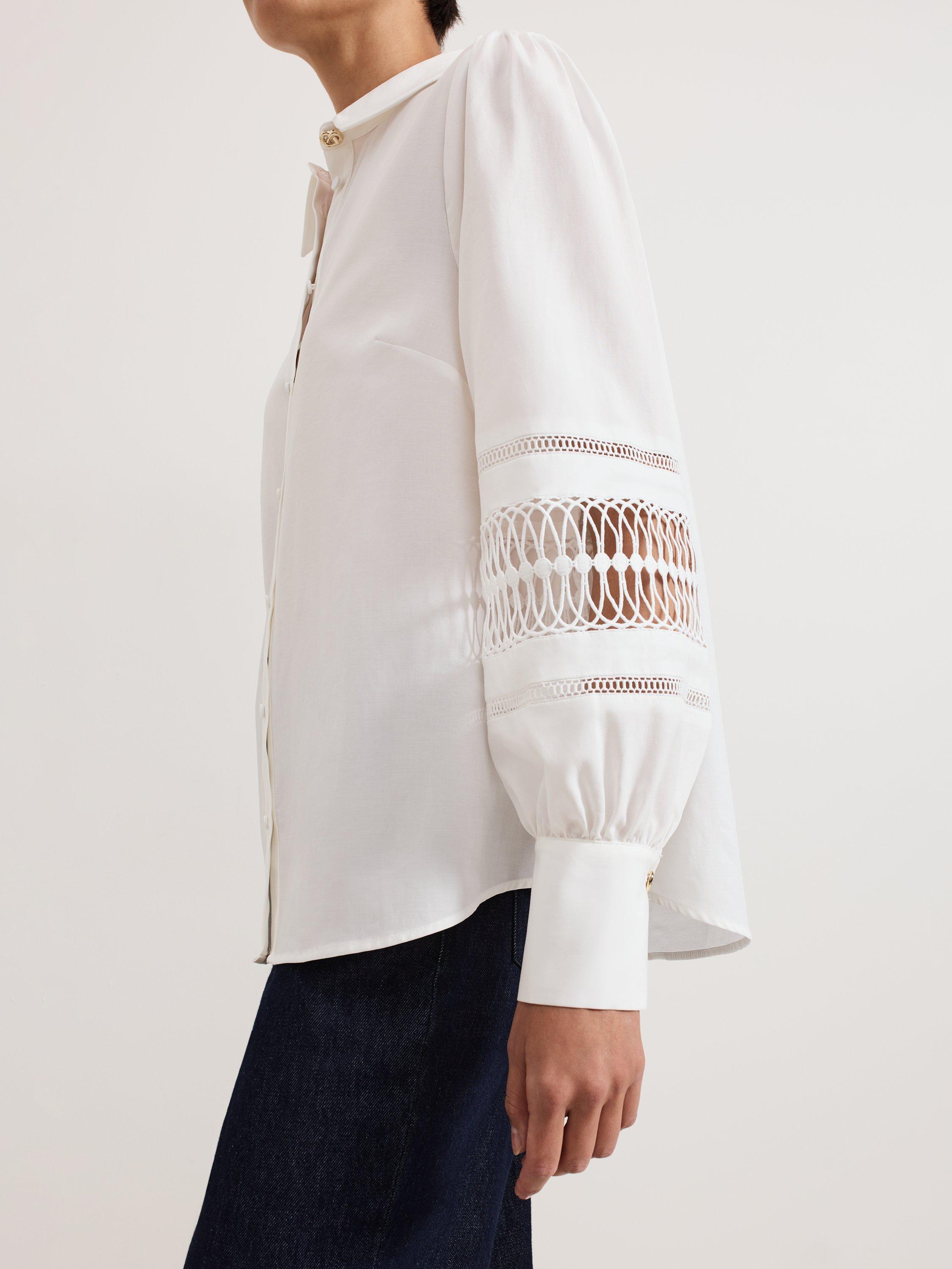 Slotting into your work-to-weekend wardrobe, the Emmelima shirt is finished with a gold knot detail at the classic collar. Cinched cuffs create a blouson sleeve effect, elevated by intricate broderie detailing. Style with your favourite jeans or trousers and heels for a contemporary evening look.