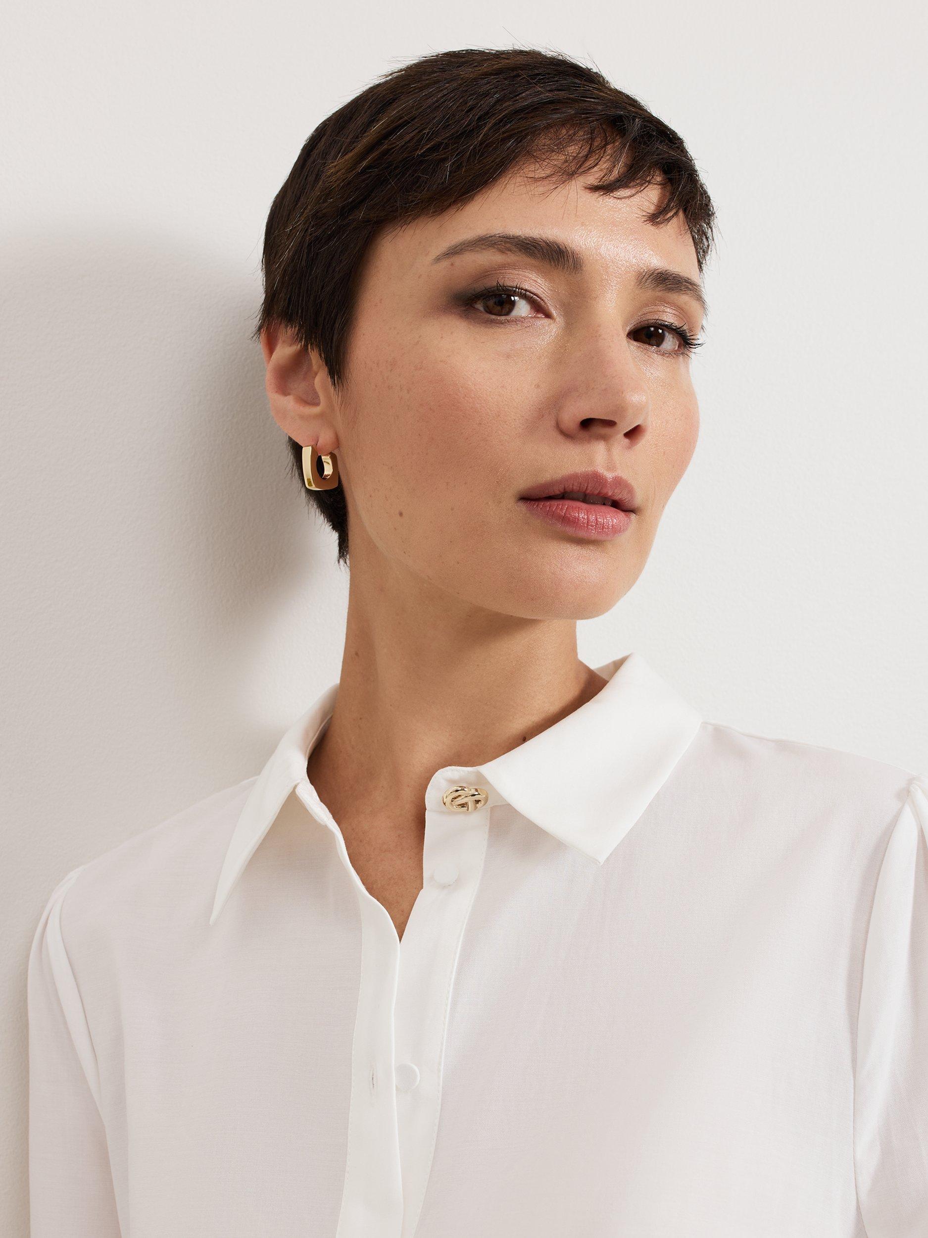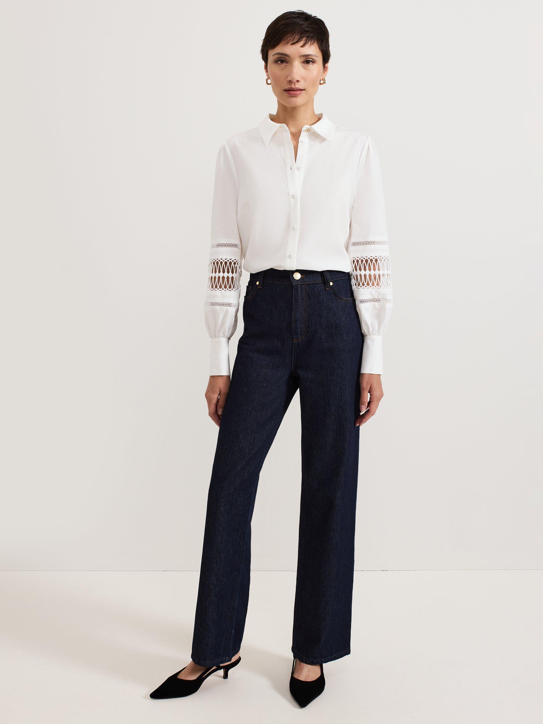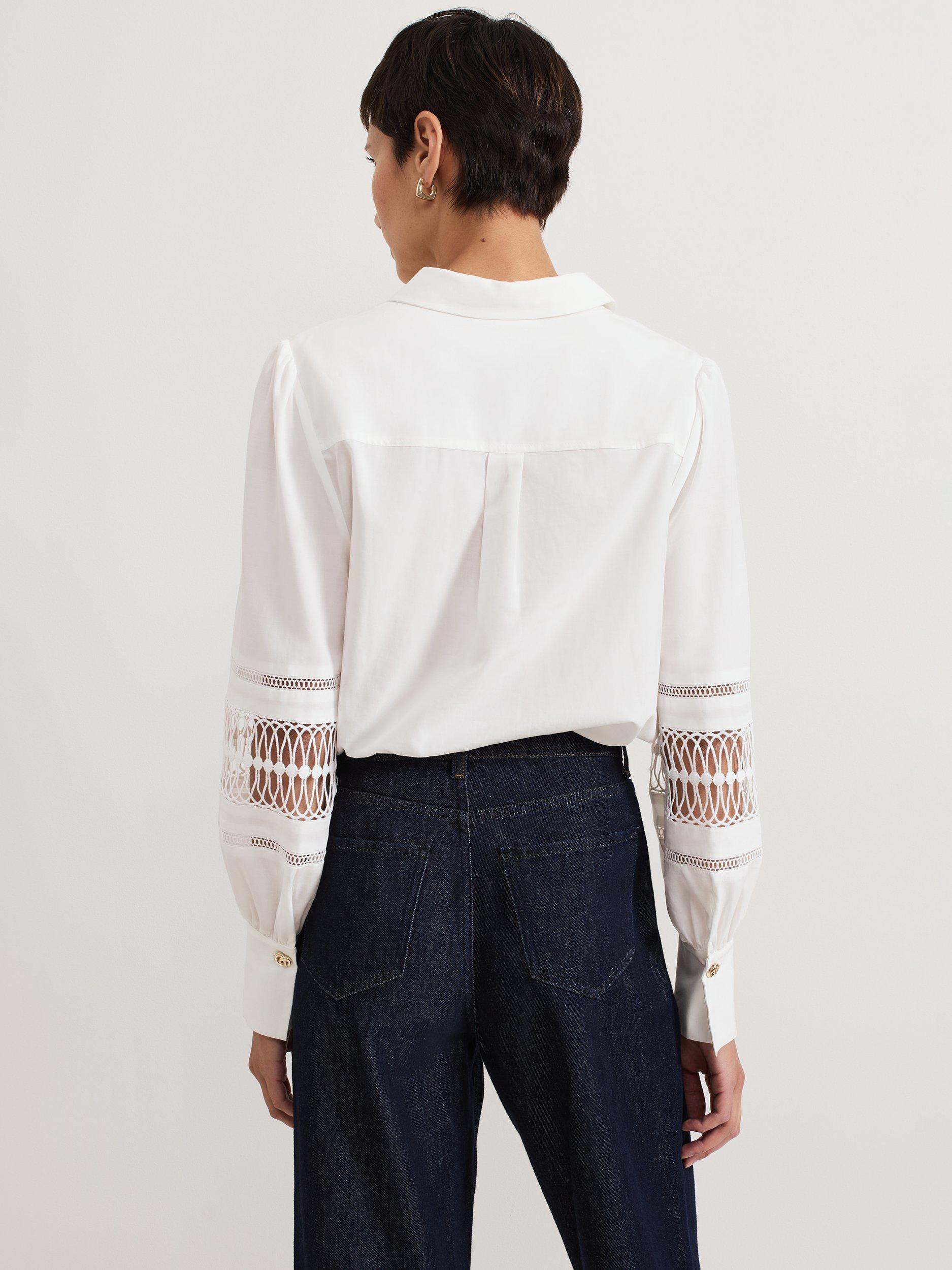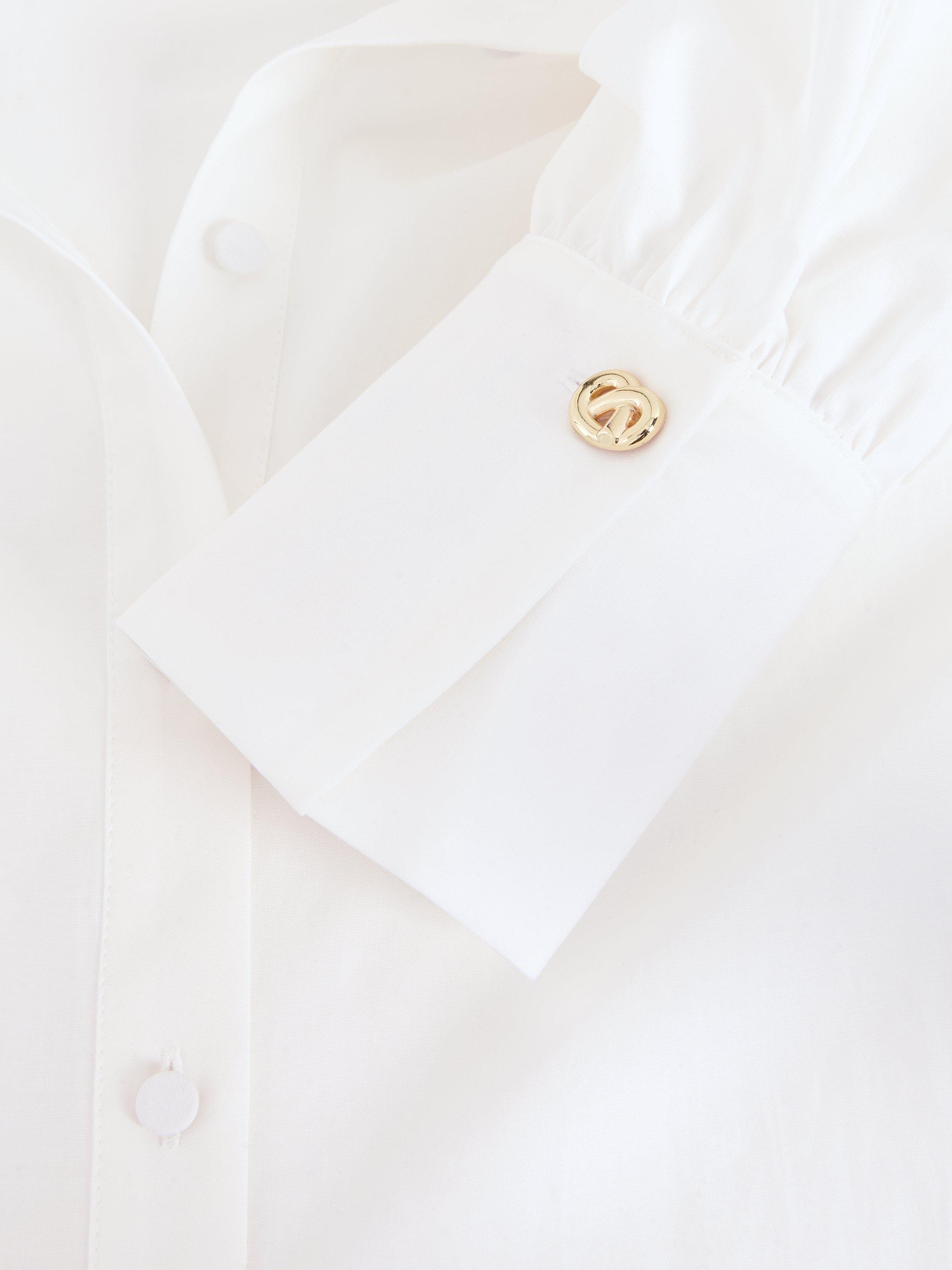 Slotting into your work-to-weekend wardrobe, the Emmelima shirt is finished with a gold knot detail at the classic collar. Cinched cuffs create a blouson sleeve effect, elevated by intricate broderie detailing. Style with your favourite jeans or trousers and heels for a contemporary evening look.