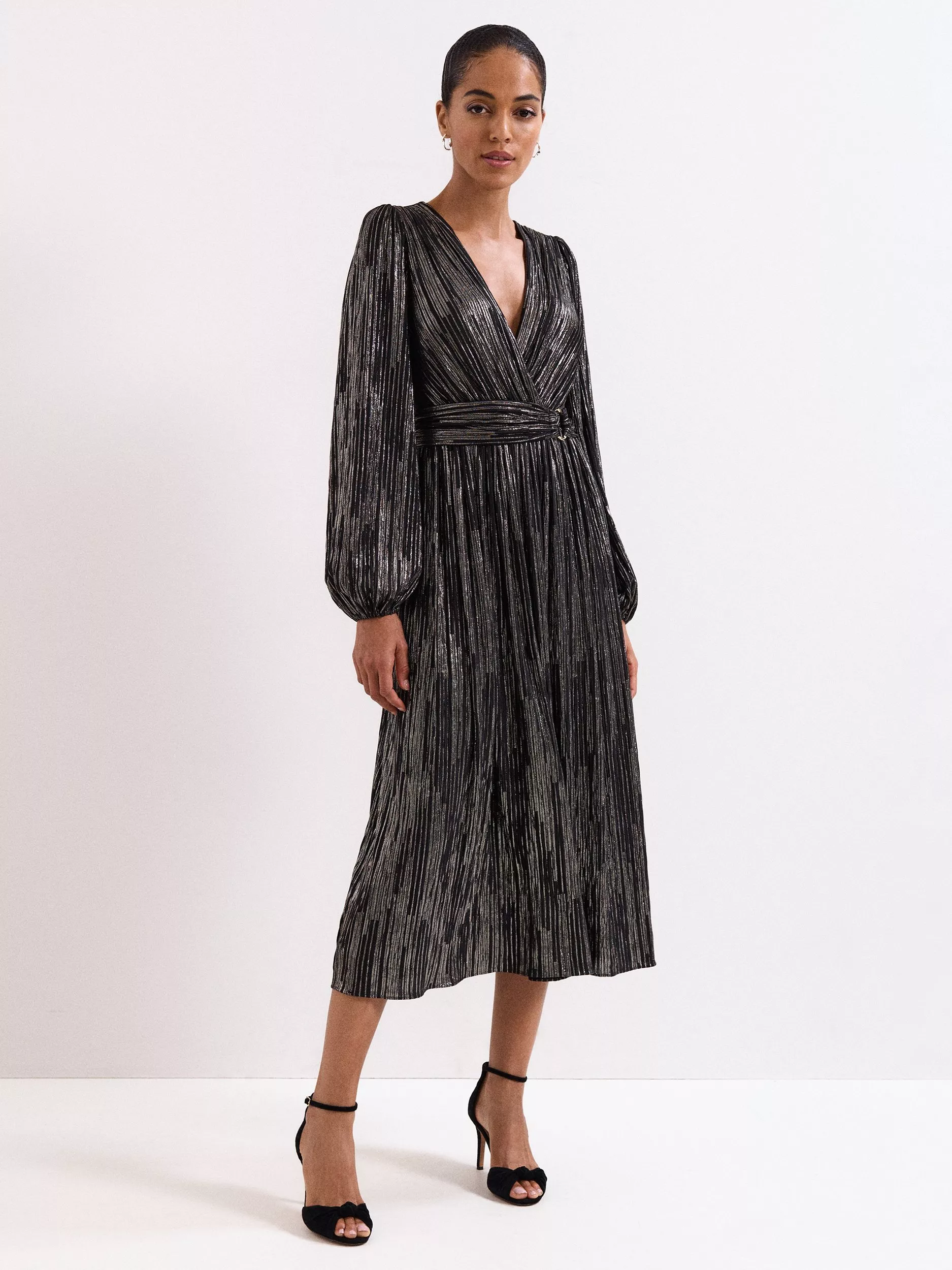 Meet your new favourite event dress. The true stand-out feature is the eye-catching metallic striped fabric that transforms this style into a unique but contemporary piece you’ll reach for again and again. Designed in a feminine faux wrap silhouette, this dress features a classic V-neckline, blouson sleeves and matching tie waist. Style with matching shoes and clutch to finish the look.