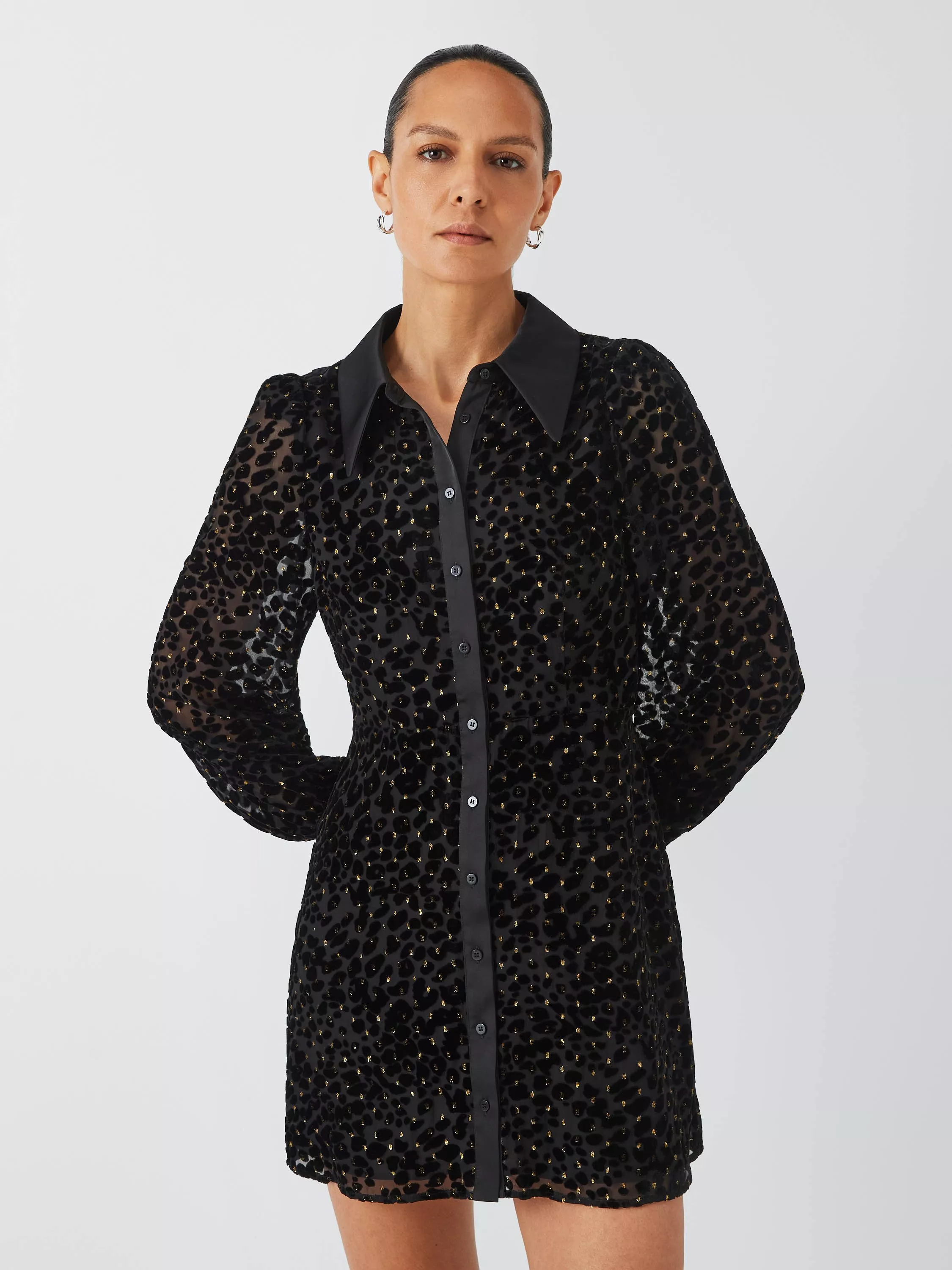 Designed in shimmer detailing, the Esin dress is cut to a classic shirt silhouette with a contrasting satin collar and long semi-sheer blouson sleeves.