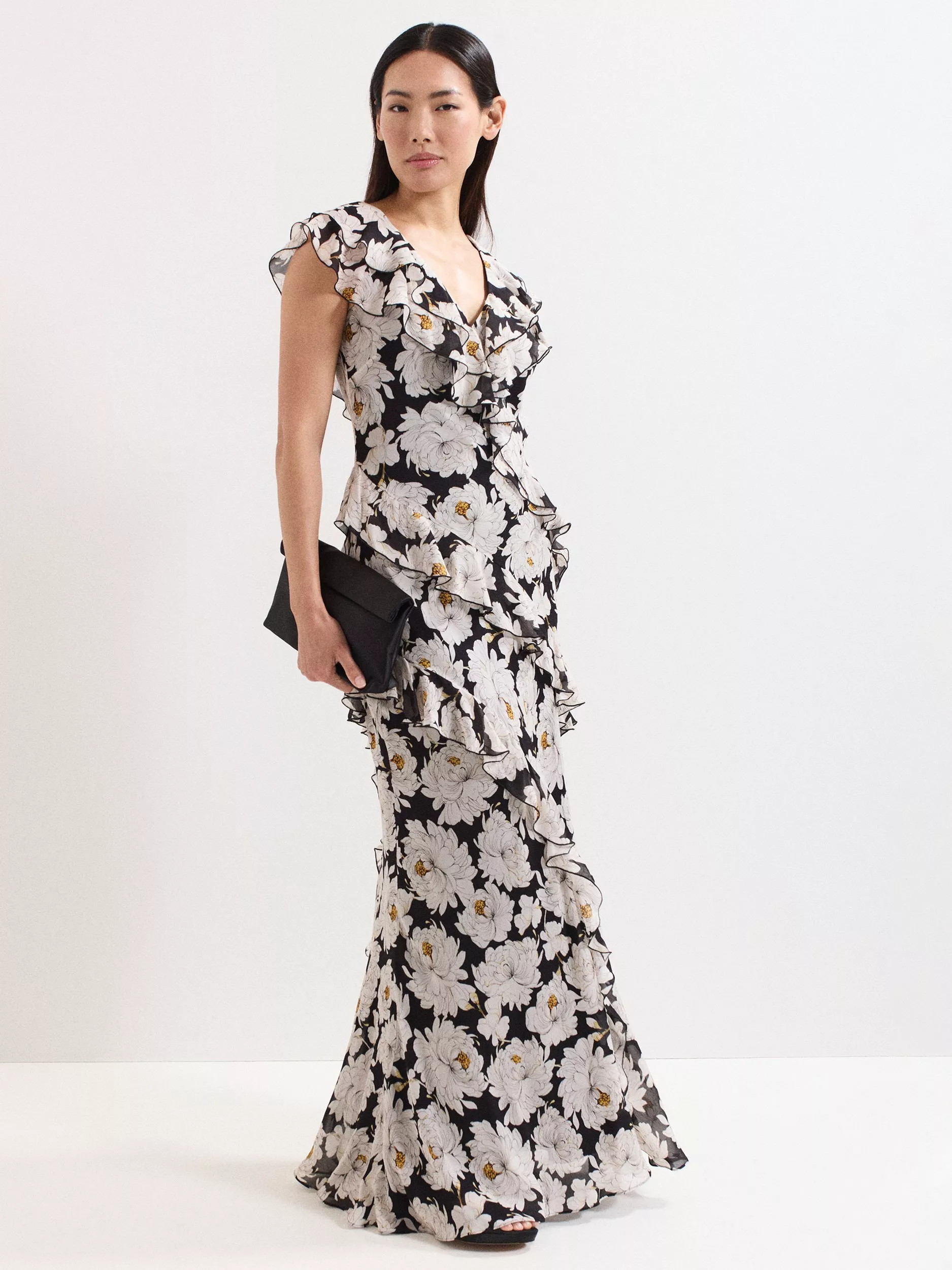 Make a statement in the Eva maxi dress. With a monochrome floral design and cascading ruffles, it flows to a full maxi silhouette that moves beautifully with you. Style with heels and a matching clutch for every special occasion in your calendar.