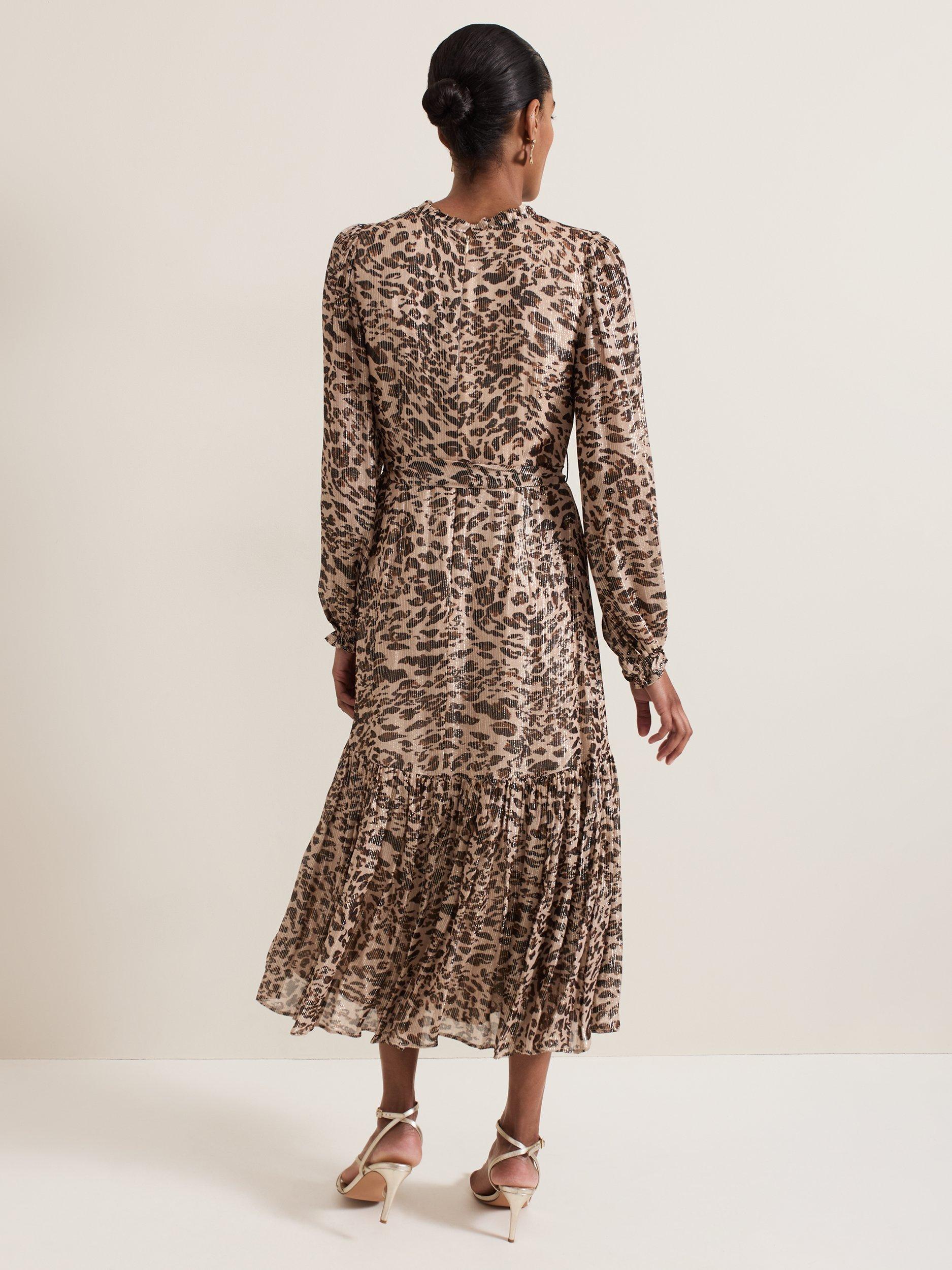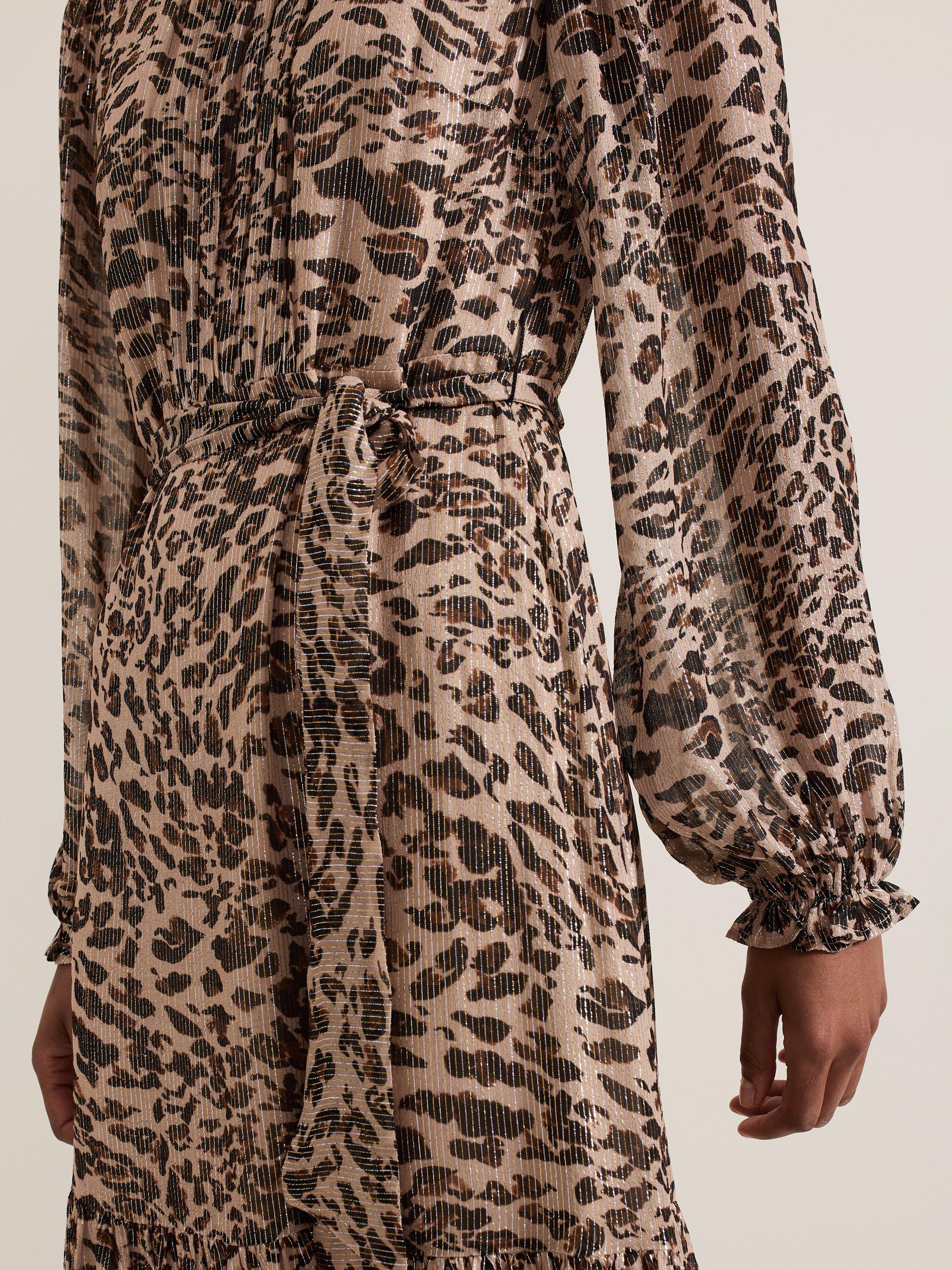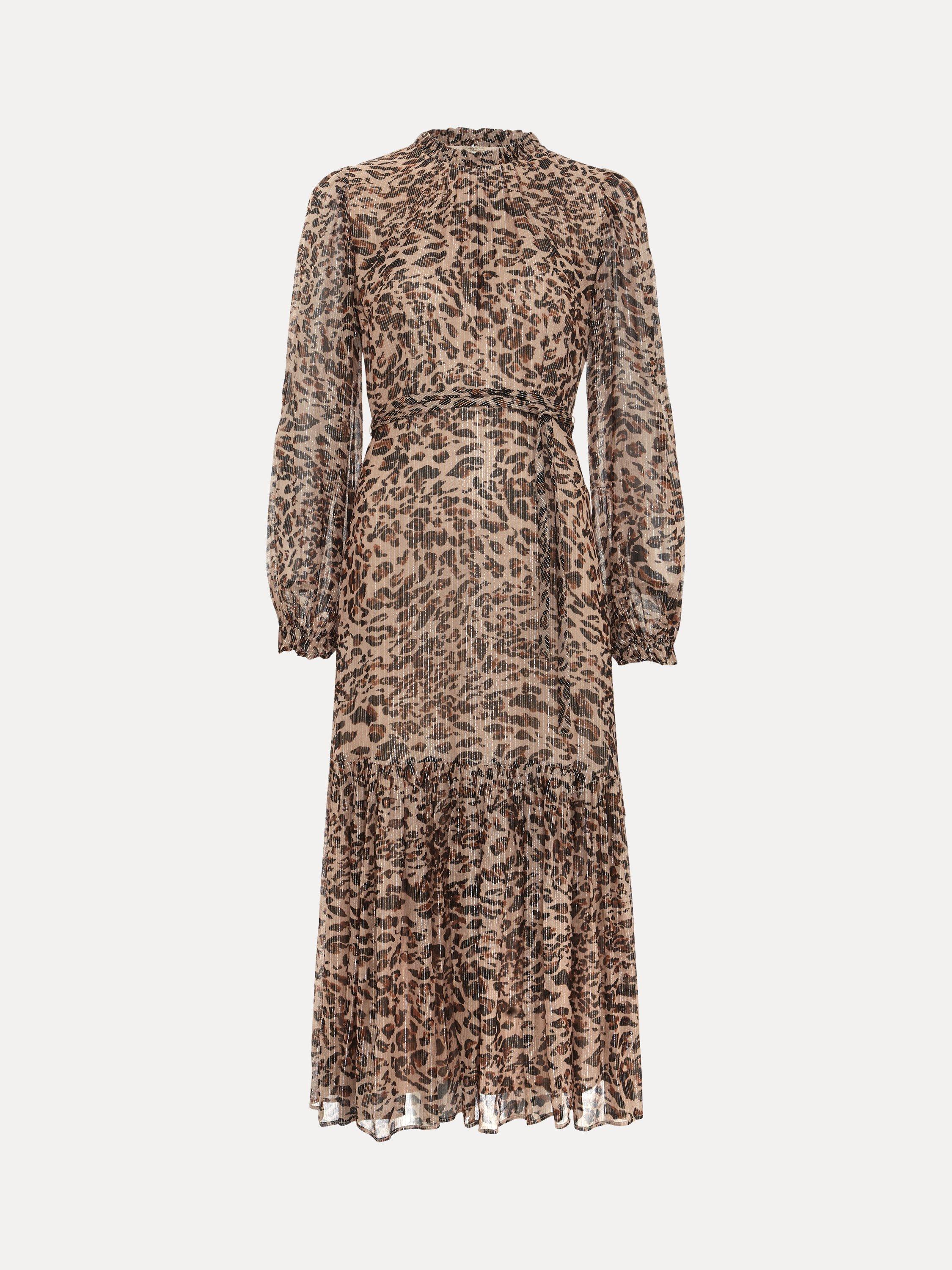 Designed in always on trend leopard print, the Eve dress features delicate pleating, long blouson sleeves and a tiered midi skirt with metallic thread detailing throughout. Style with your favourite black or gold accessories for a style you'll reach for again and again.