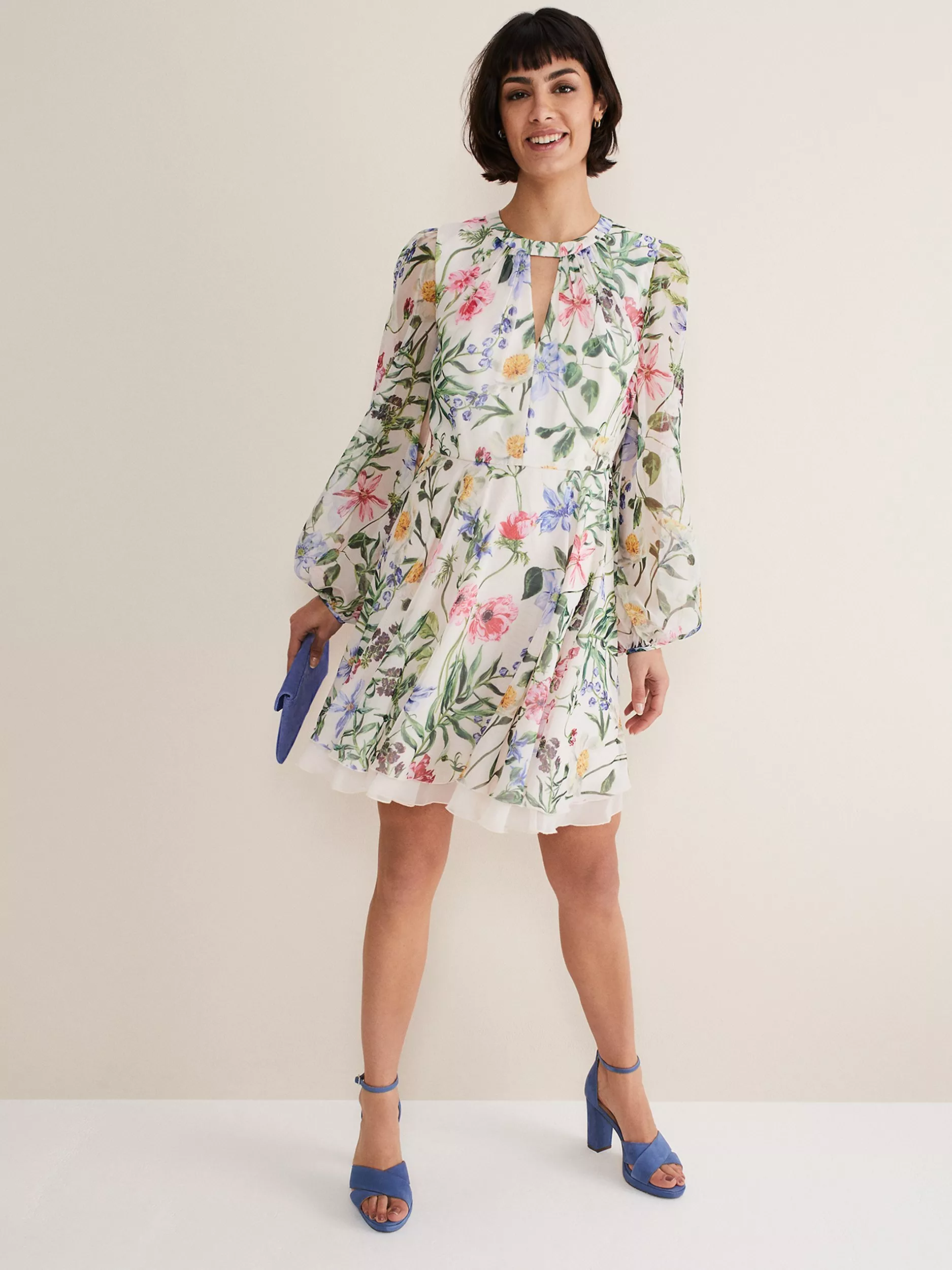Designed with a stunning hand-painted floral print, the Everleigh dress features a keyhole neckline long puffed sleeves and a double layered mini skirt. The perfect option for occasion dressing.