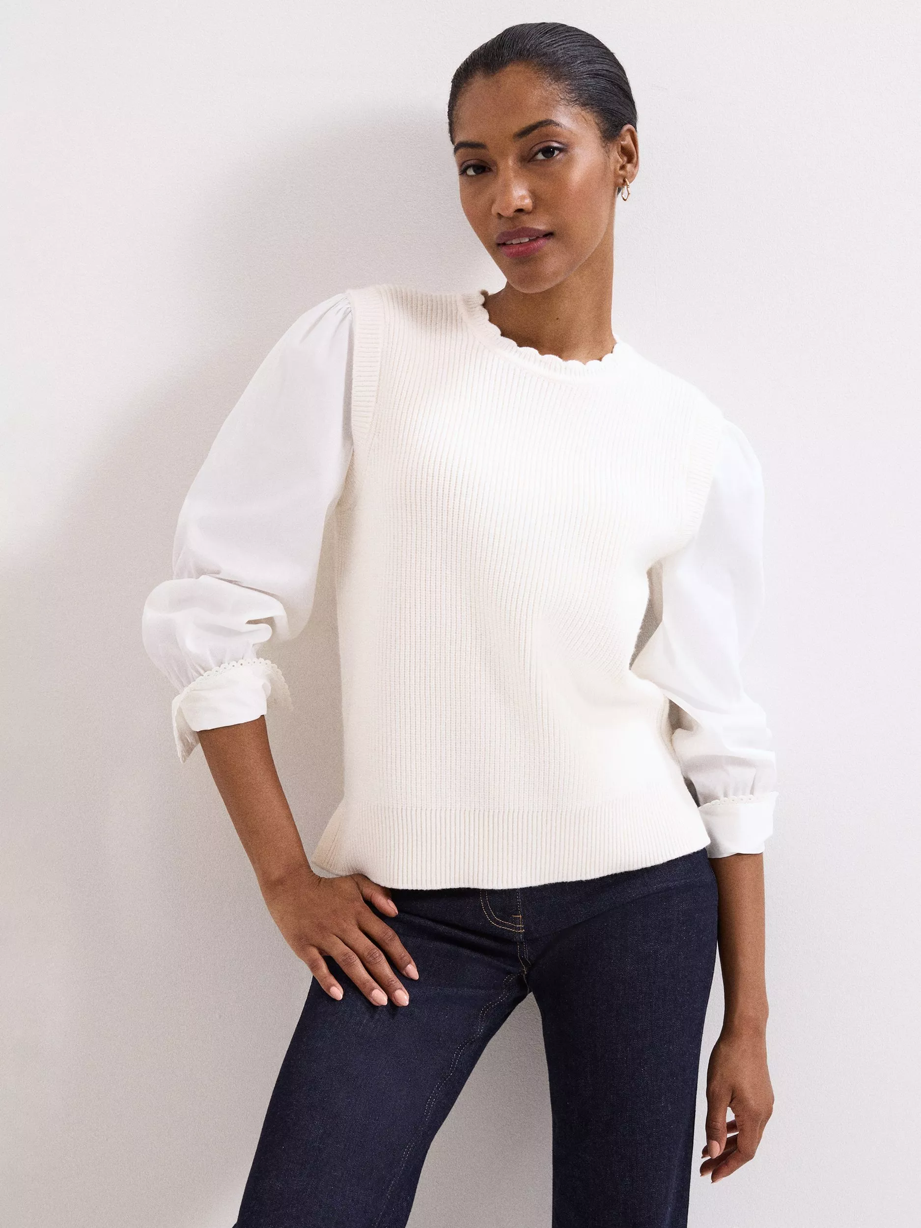 Your classic blouse and knitted tank in one easy-to-style piece. Featuring shirt sleeves with button details to the cuff, with a ribbed knit tank with feminine neckline detail. Style with your favourite jeans for a smart/casual aesthetic.