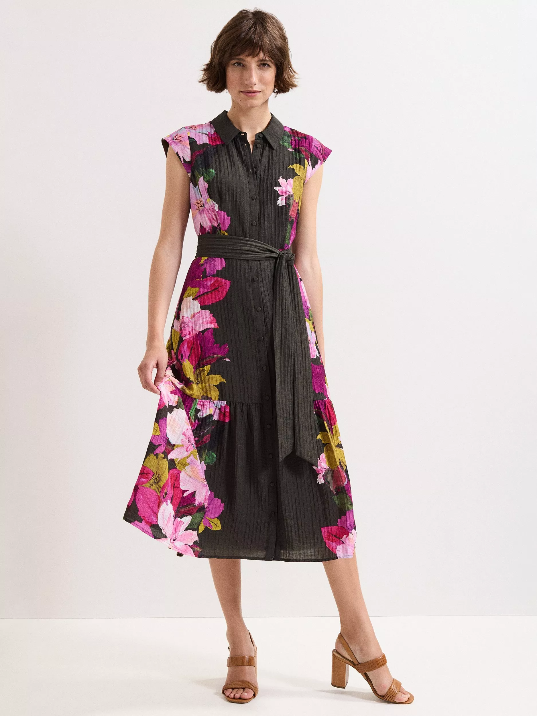 A truly versatile style, our Robyn dress will became a staple this season and beyond. The shirt silhouette is grounded in a deep olive shade, updated with a floral placement print and textured feel for a feminine edge.