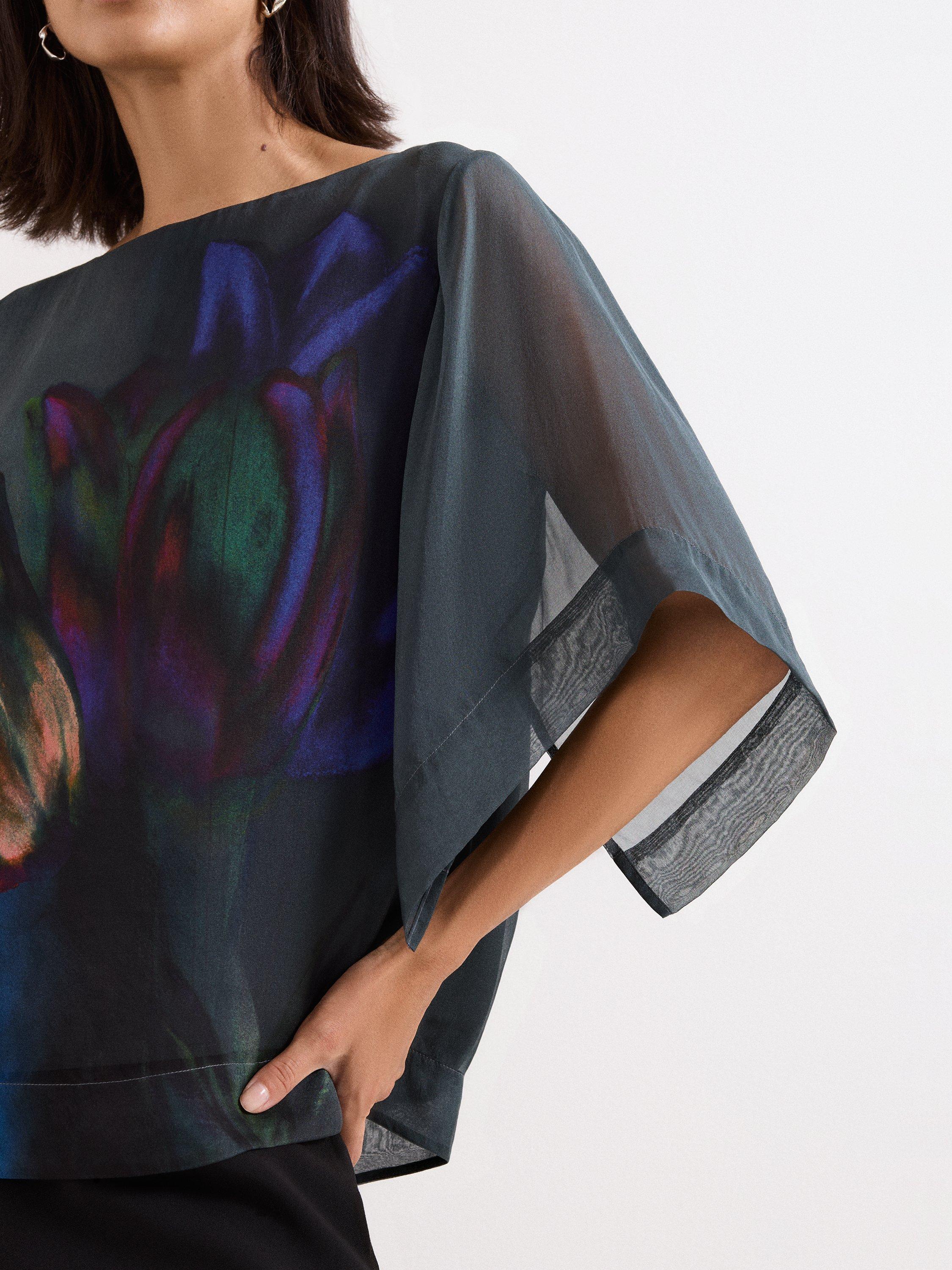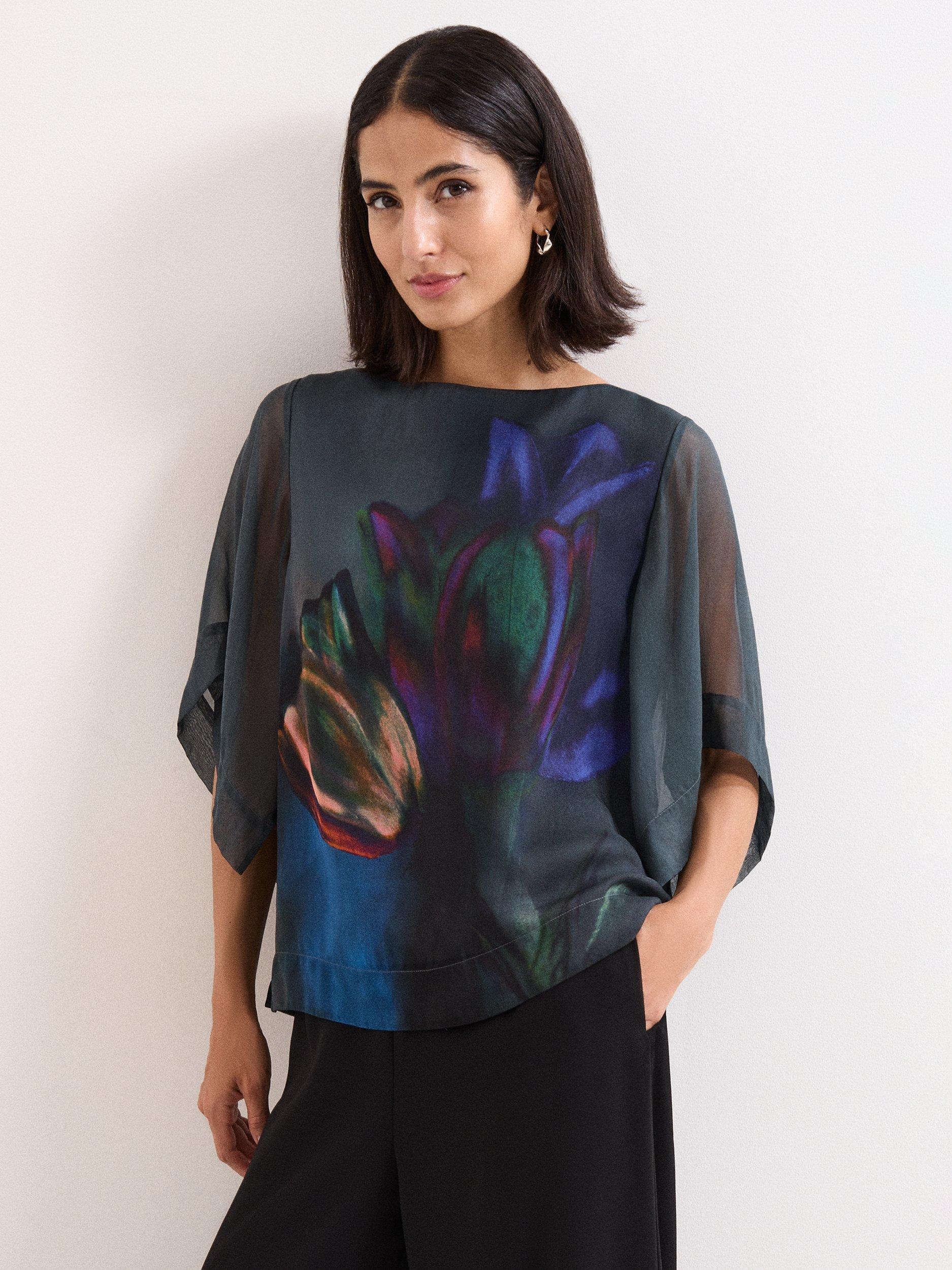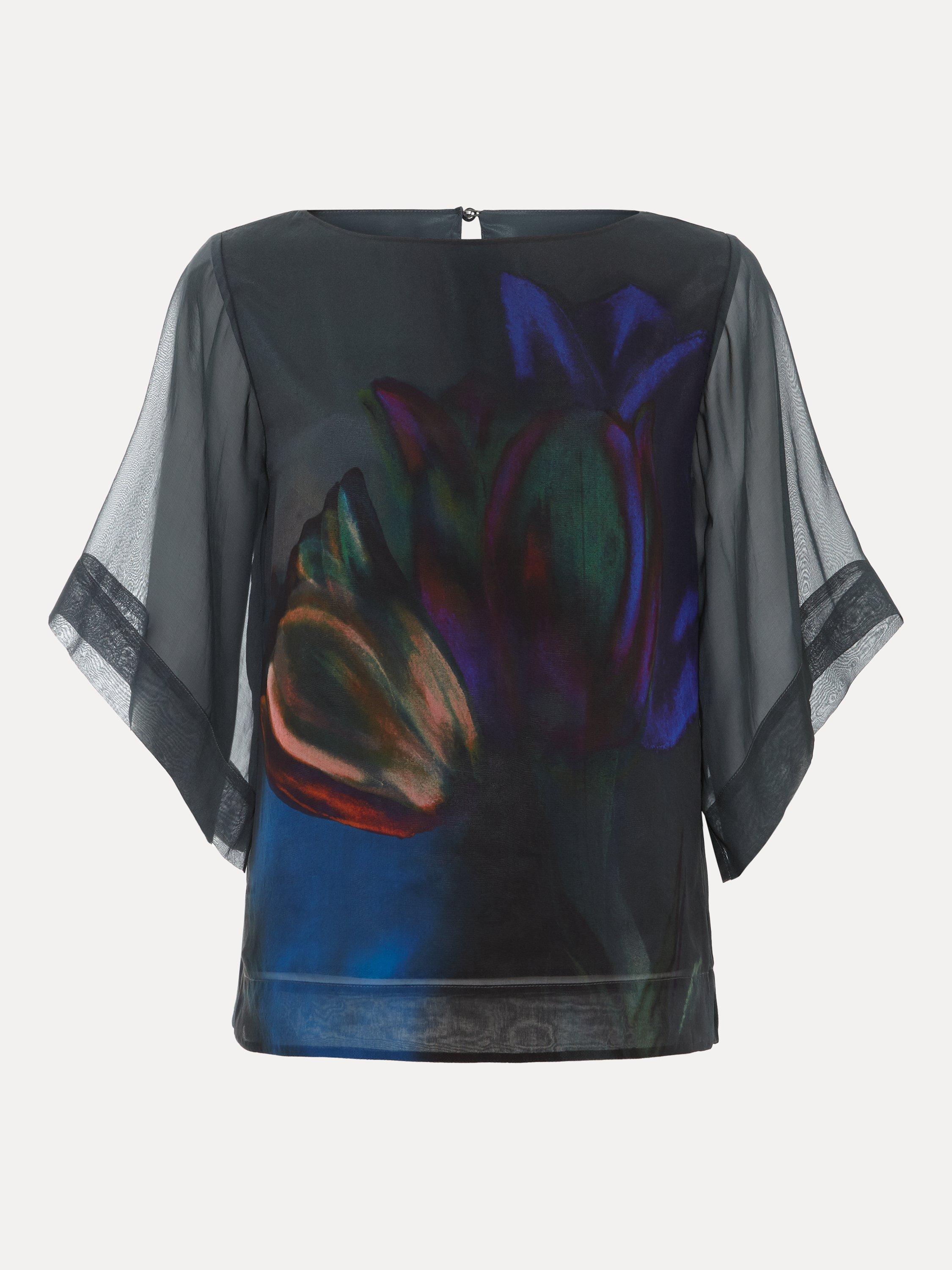Every wardrobe needs a luxurious, statement blouse. Made from 100% silk, this modern blouse features an expressive abstract floral design in rich shades.