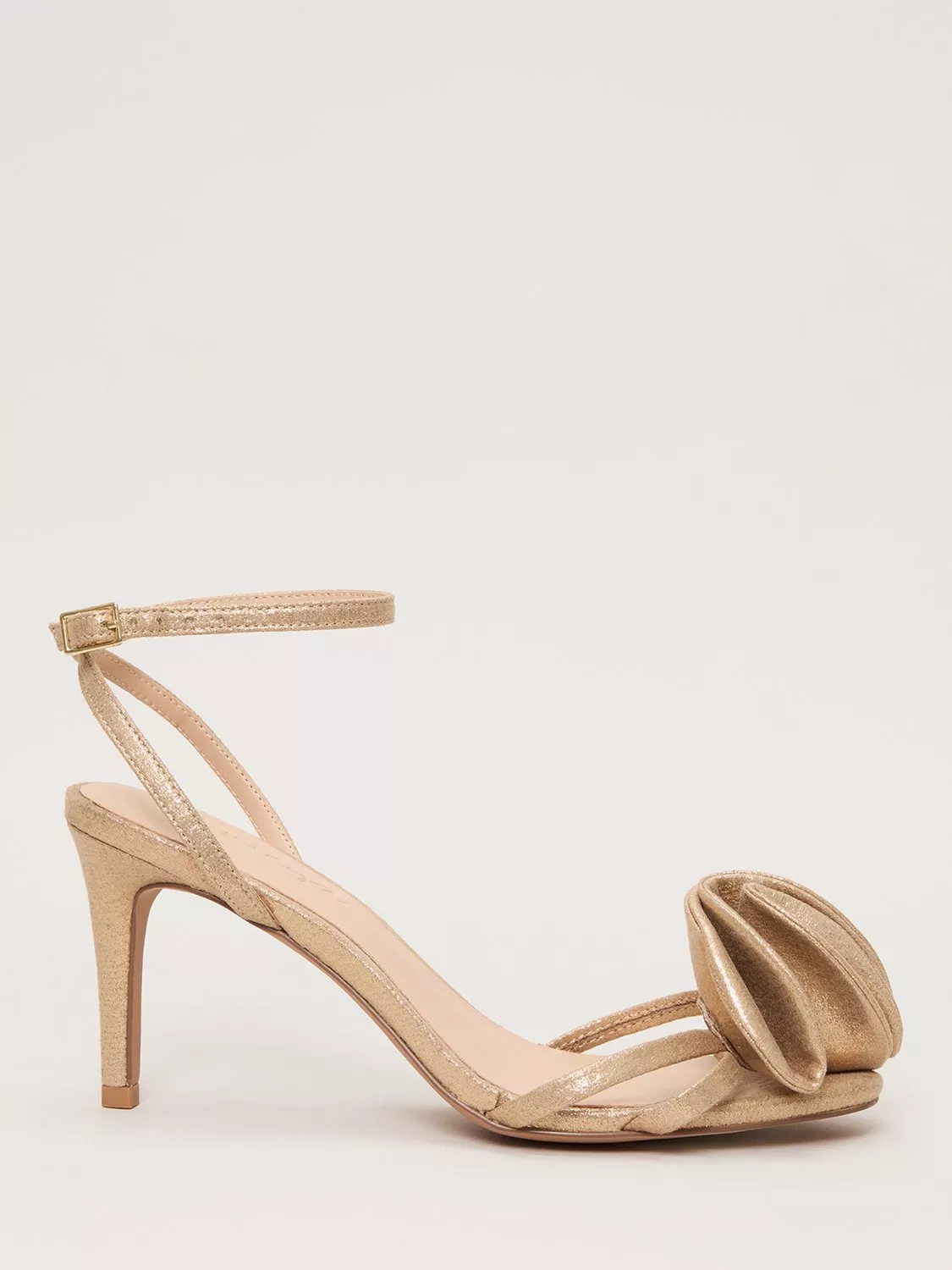 From Phase Eight, these gold heels will become a staple in your event wardrobe. Finished with a floral applique detail at the open toe, the heels fasten with a delicate ankle strap, perfect for dancing all night. Style with a matching box clutch for a coordinated occasion look.