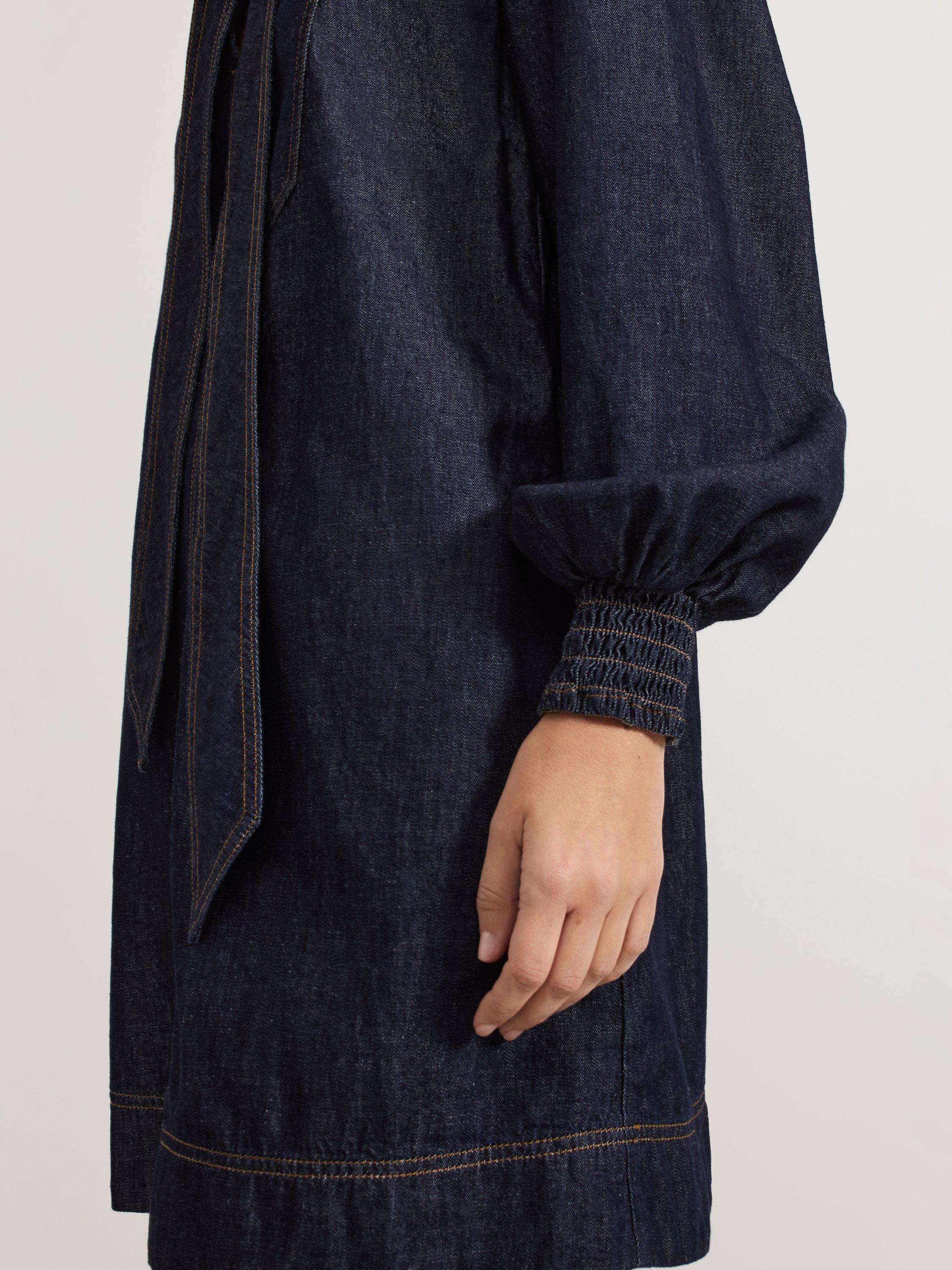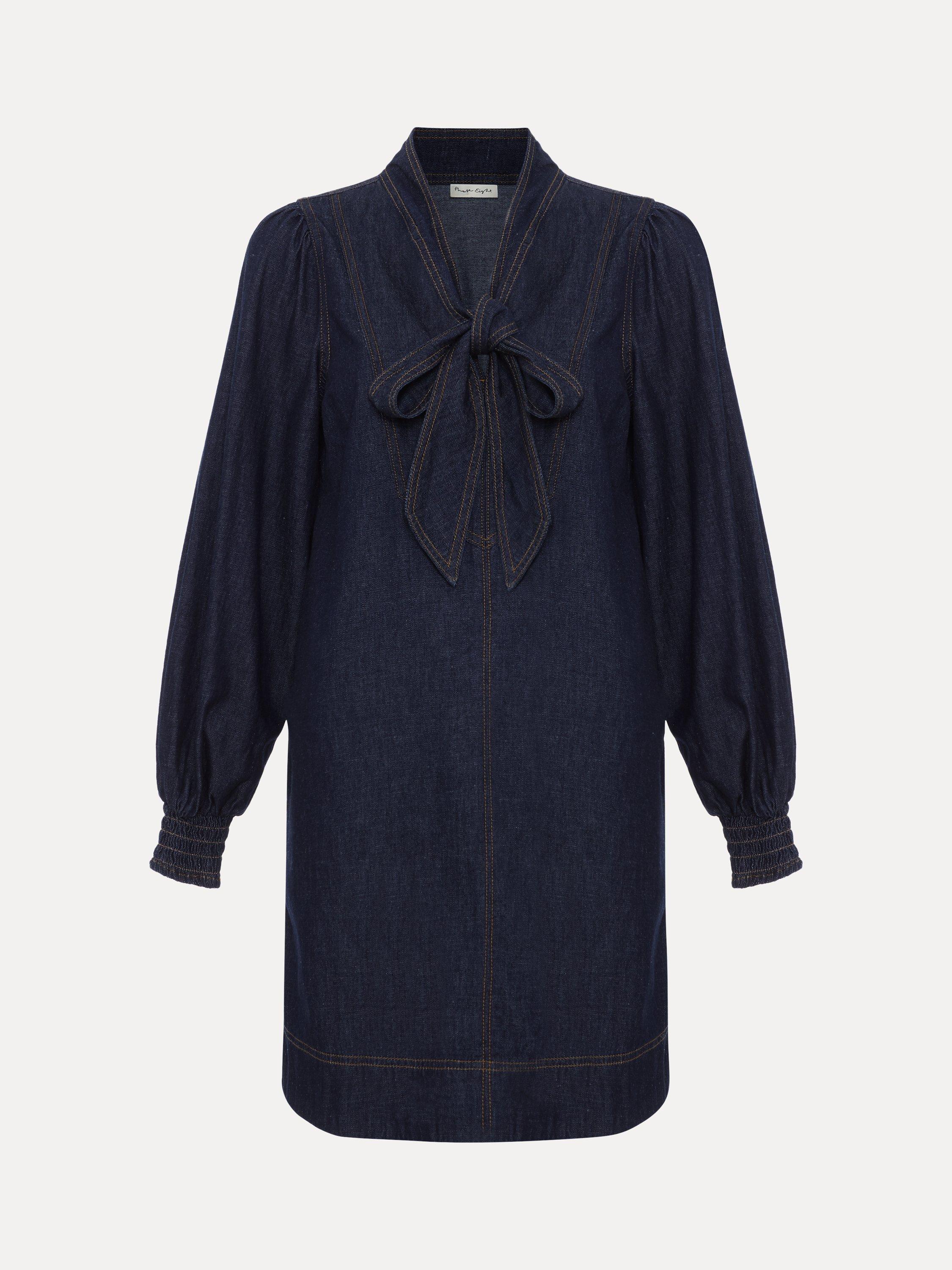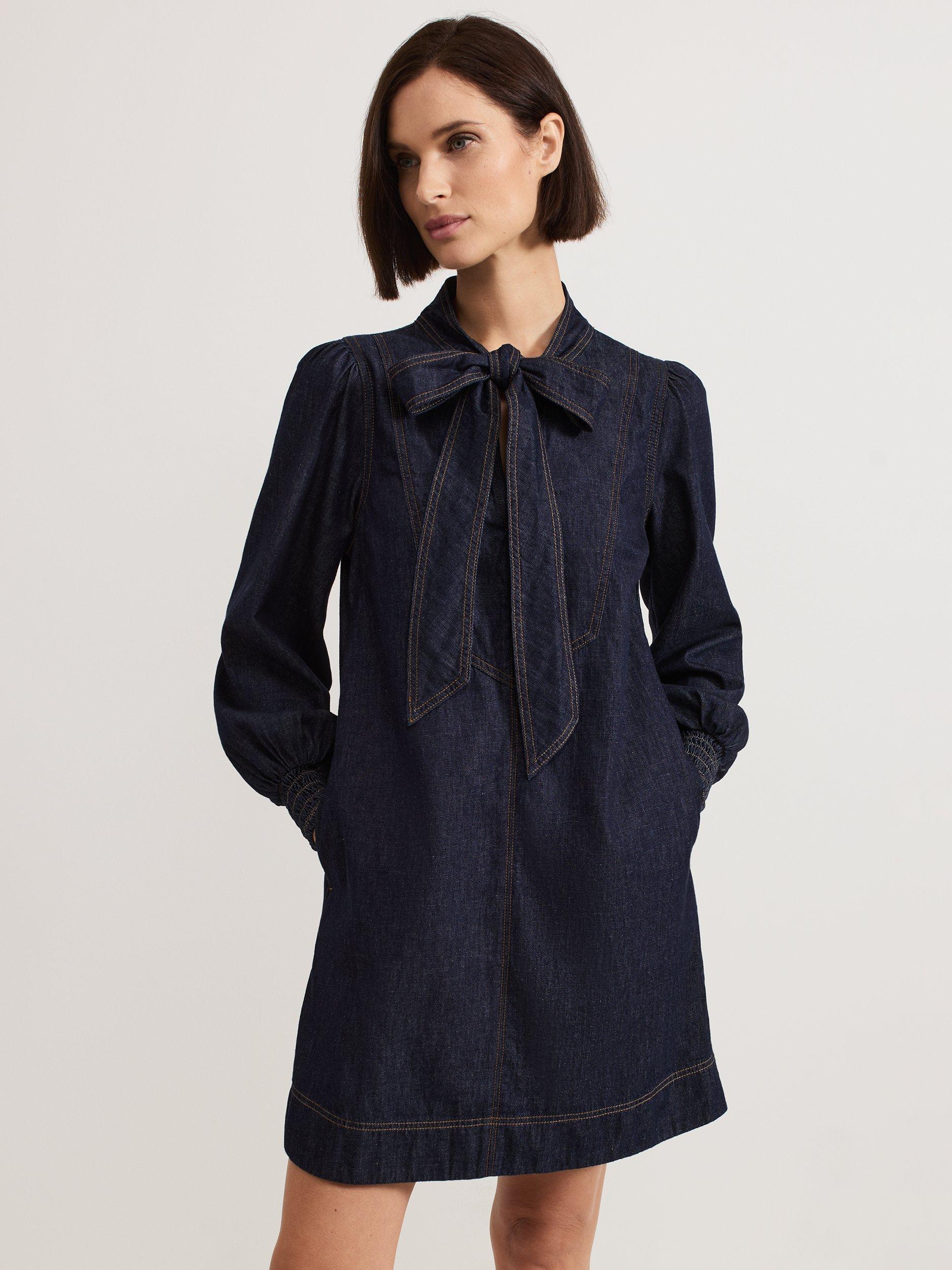 An alternative to usual denim styes, this A-line mini dress from Phase Eight is rendered from pure cotton-denim. With a statement tie neckline and full-length sleeves with shirred elasticated cuffs, this style features perfectly placed patch pockets to the front.