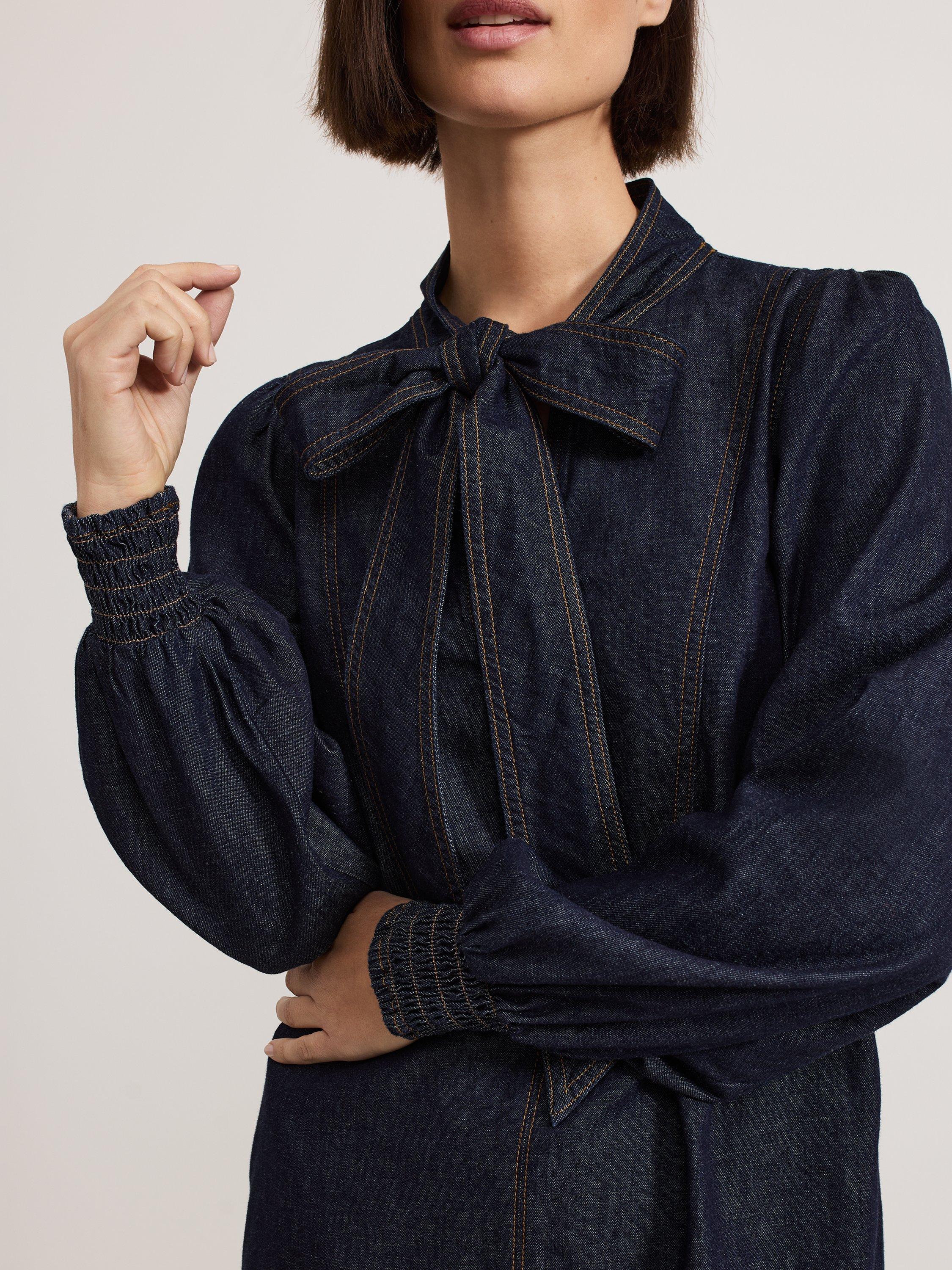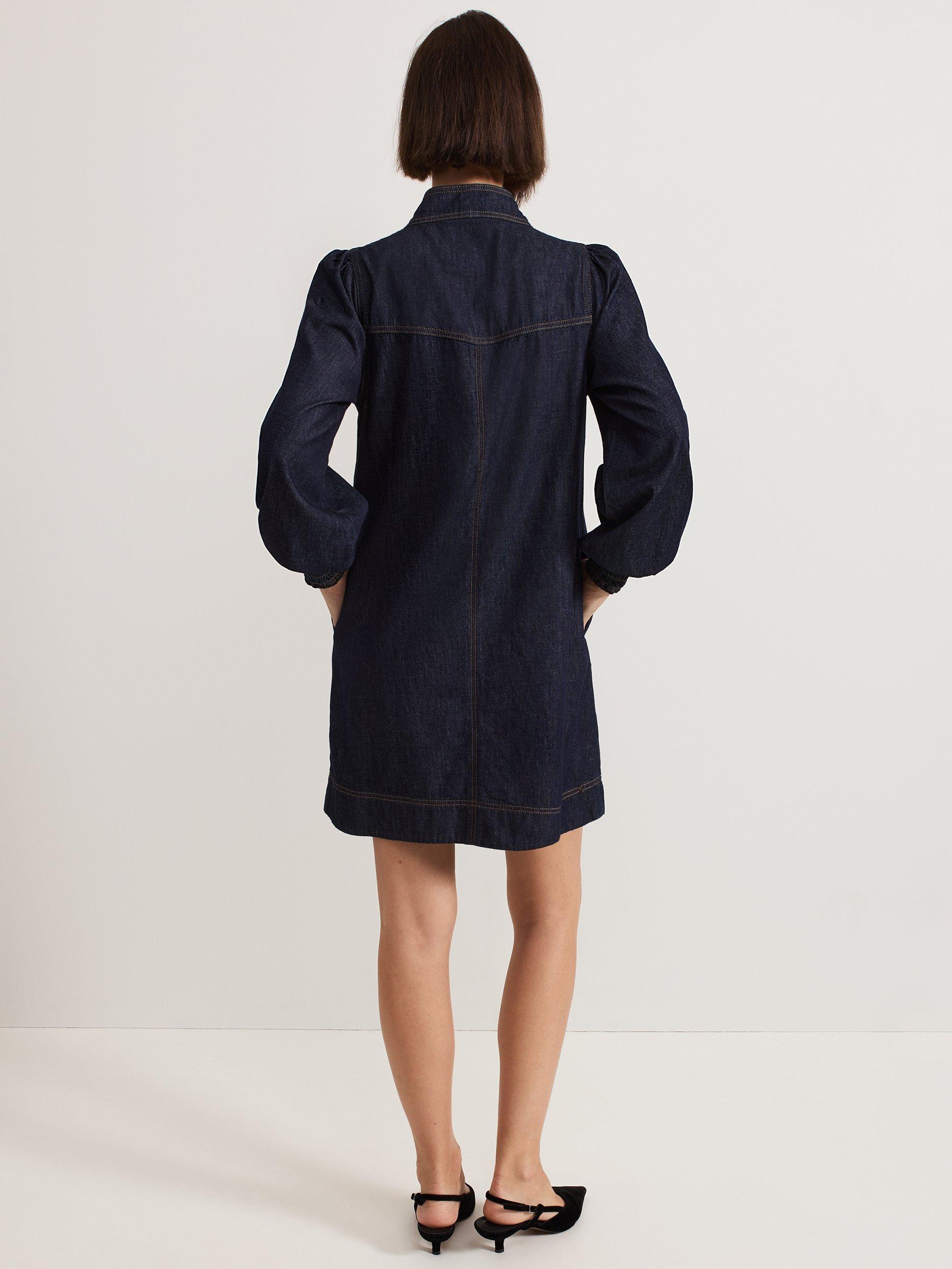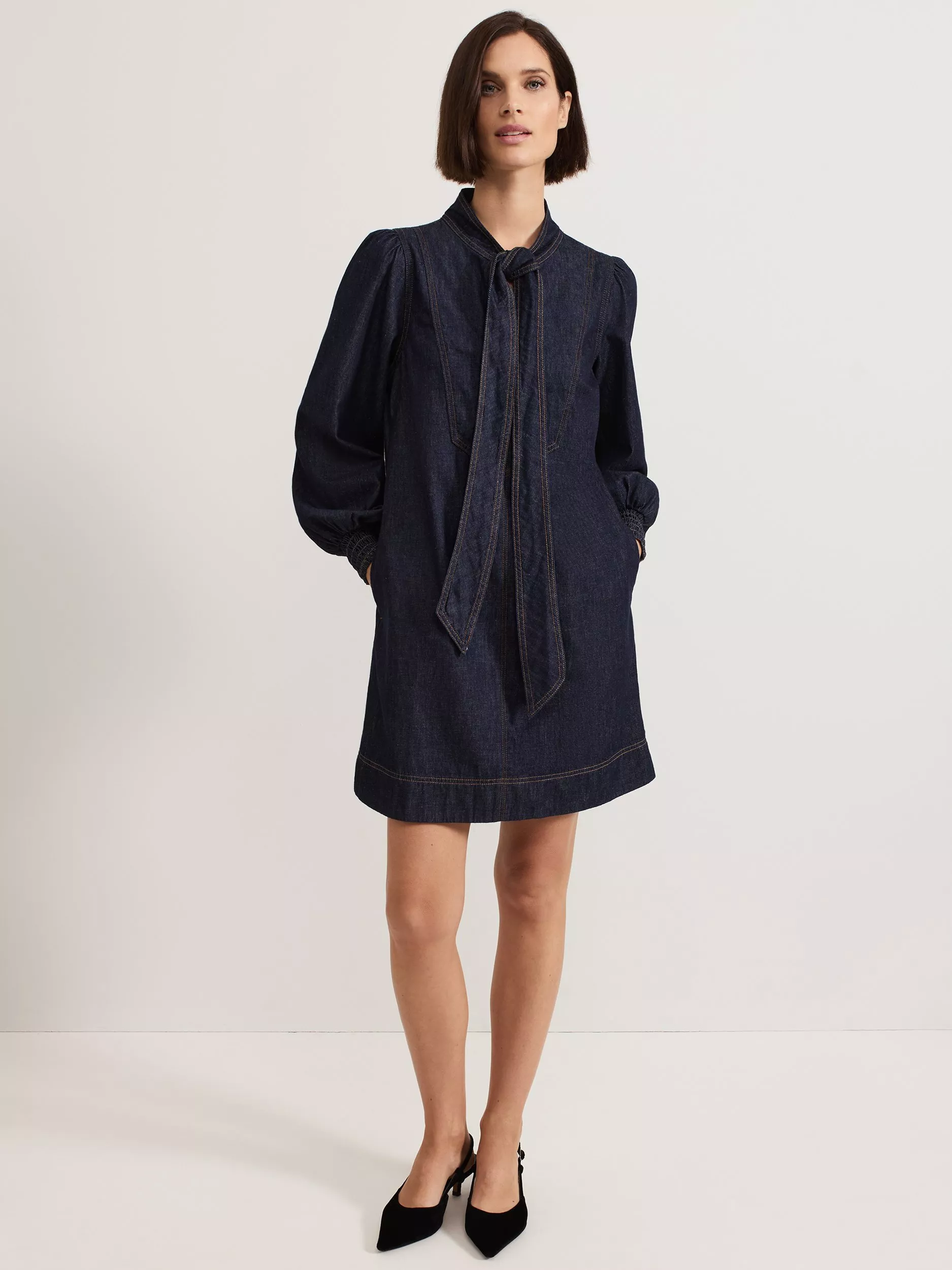 An alternative to usual denim styes, this A-line mini dress from Phase Eight is rendered from pure cotton-denim. With a statement tie neckline and full-length sleeves with shirred elasticated cuffs, this style features perfectly placed patch pockets to the front.