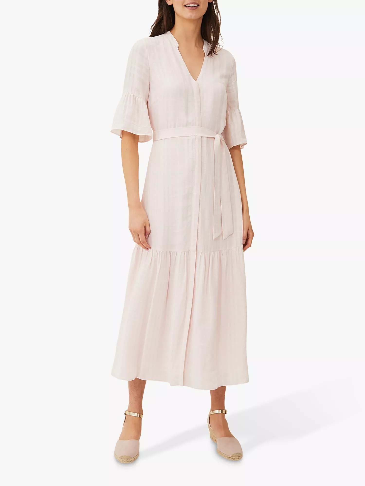 With a tiered design for added movement, this maxi dress from Phase Eight is easy to style up or down. Shaped with a matching waist tie belt, it has soft fluted sleeves and a concealed button placket that leads to a notch neckline. Great for slipping on with sandals for a day in the sun.