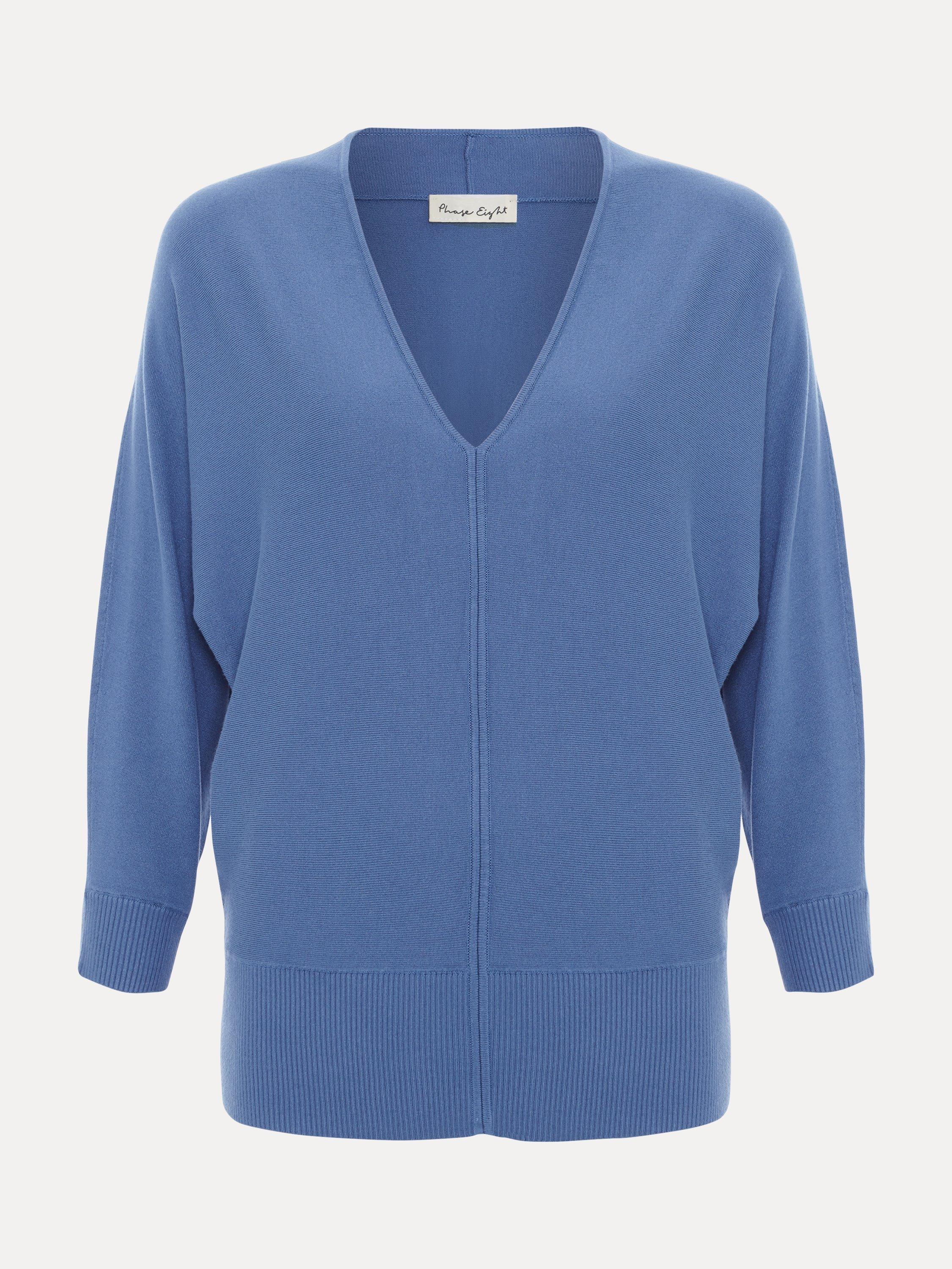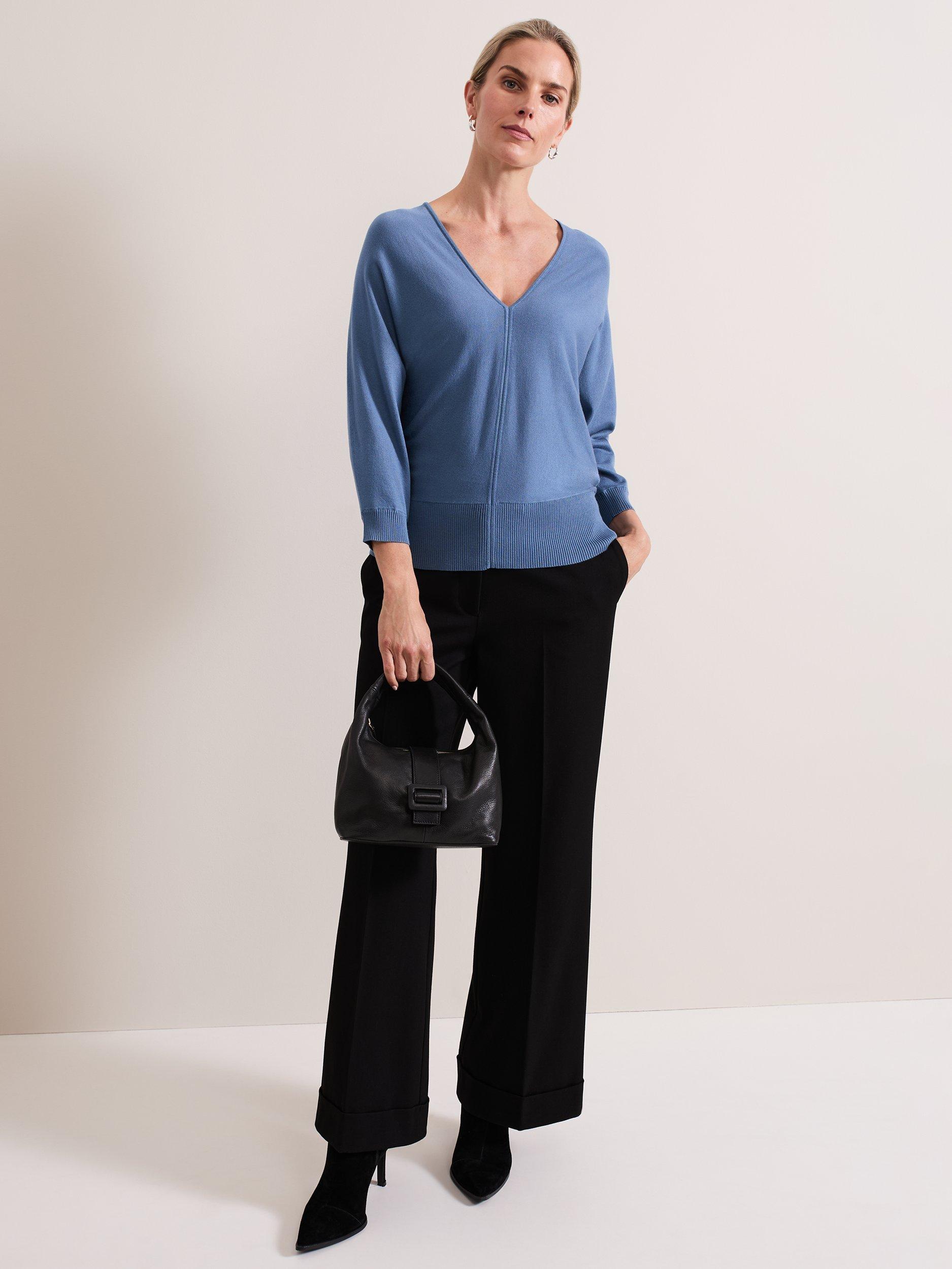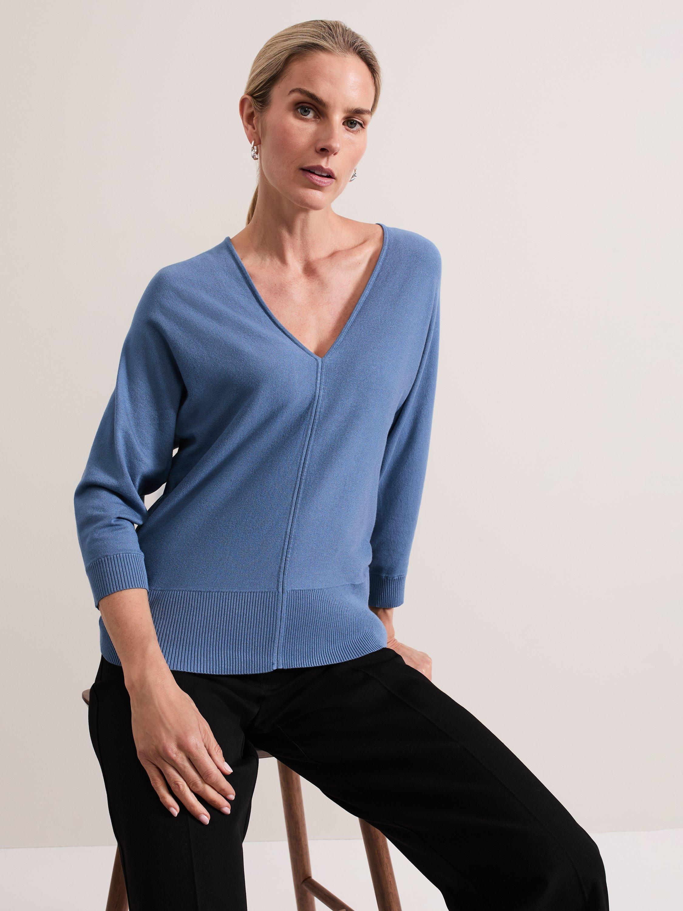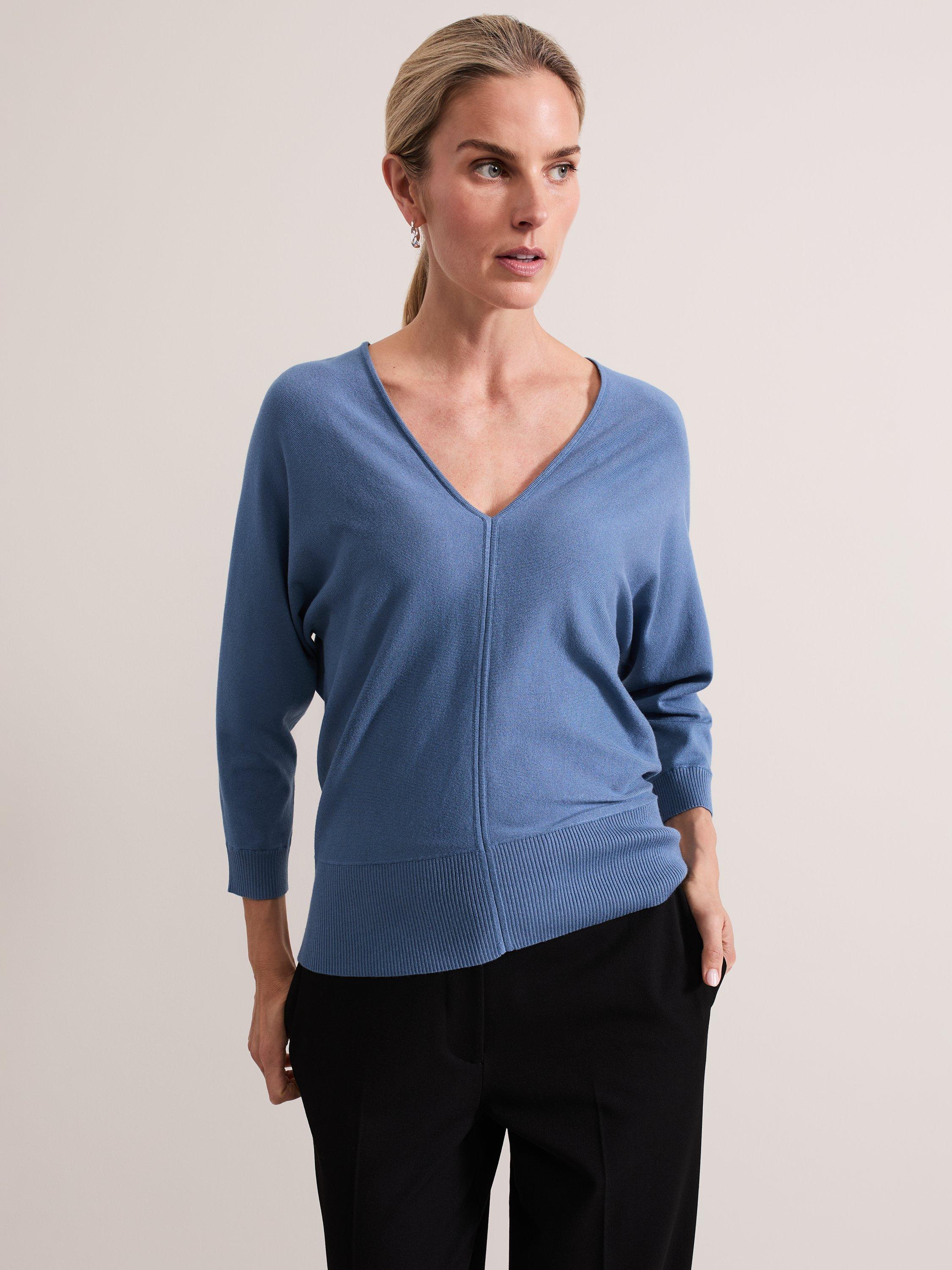 The Gina jumper features a classic V-neckline and batwing sleeves brought together by a ribbed hem and cuff to create a feminine silhouette.