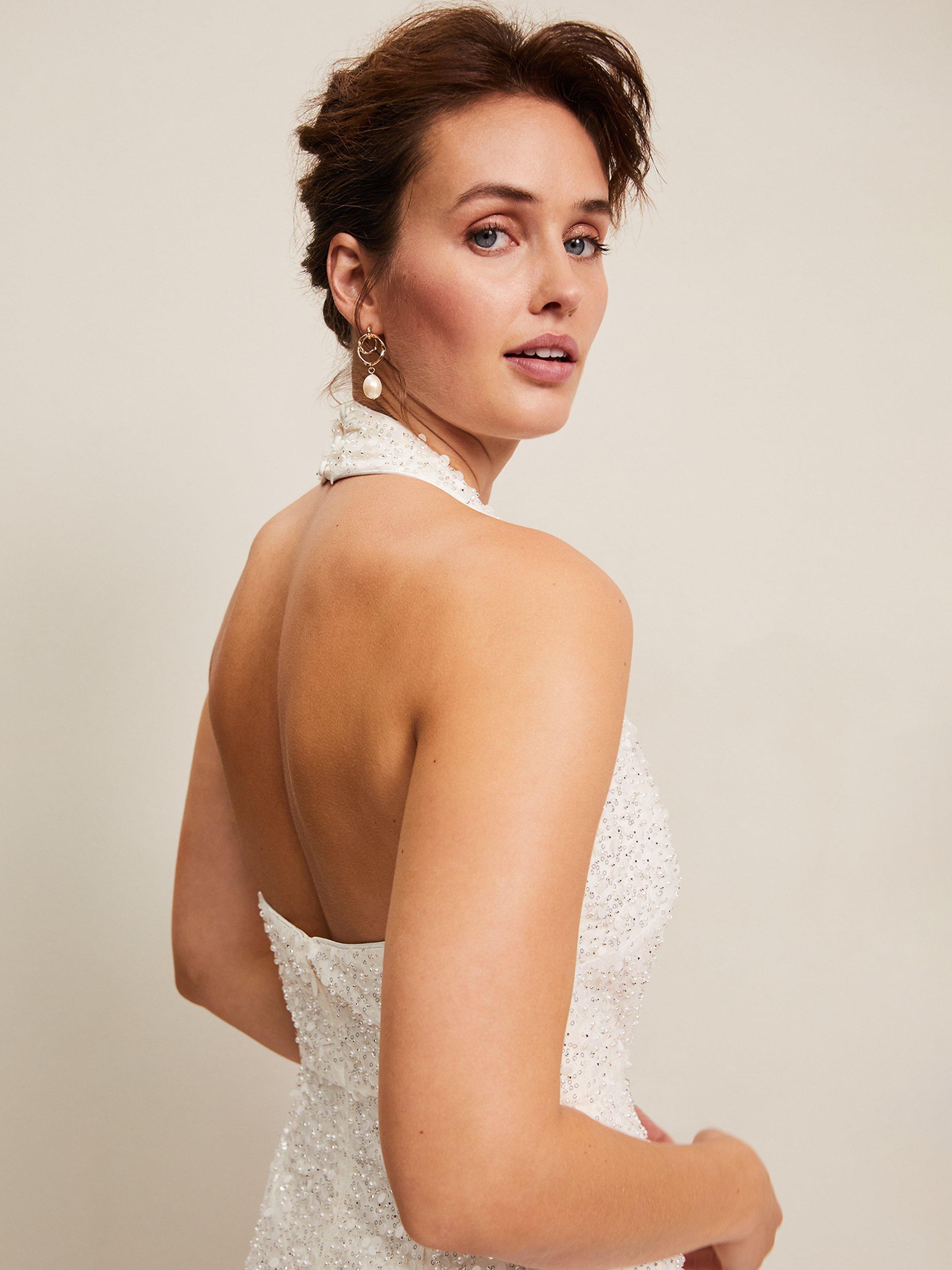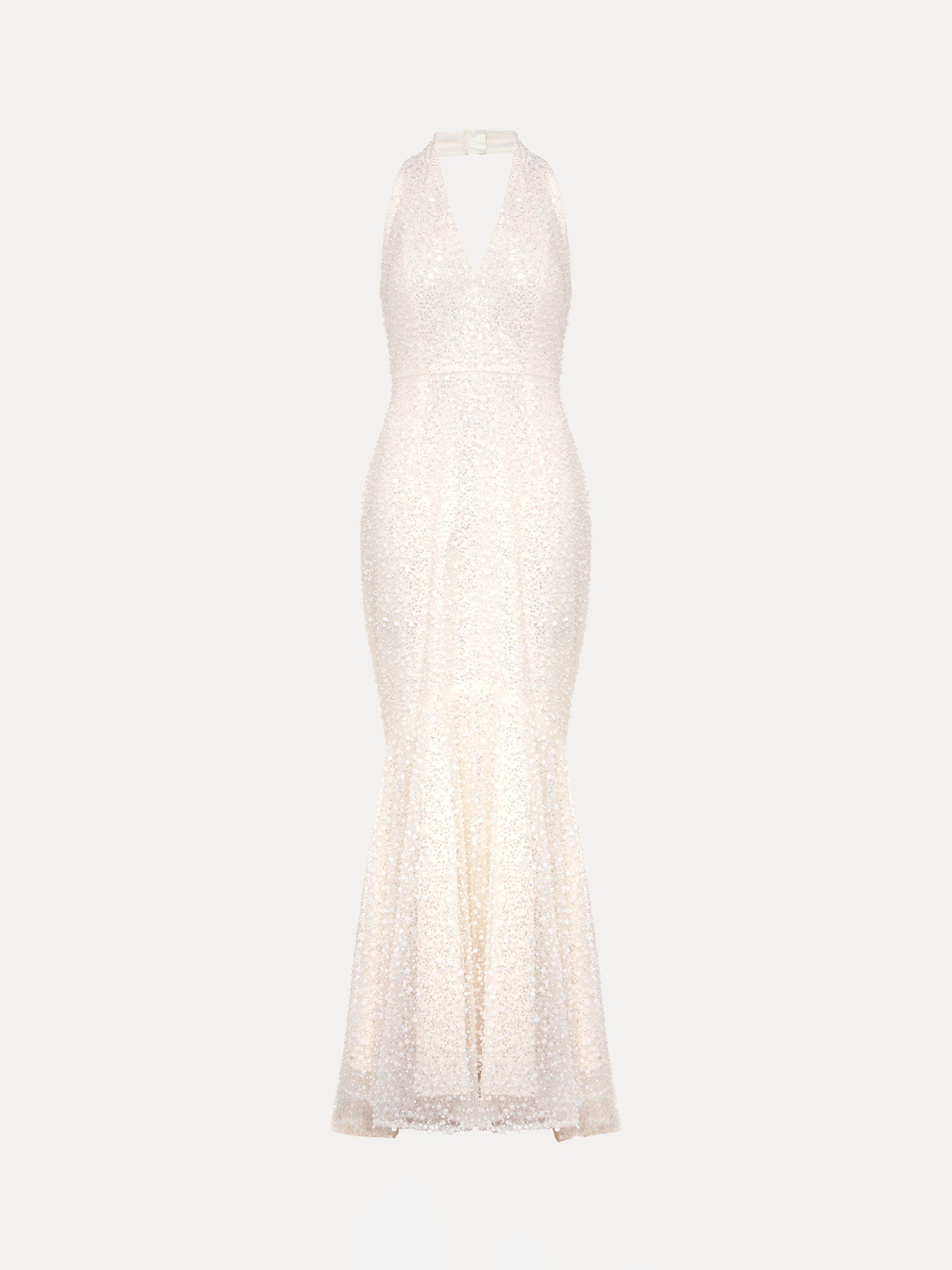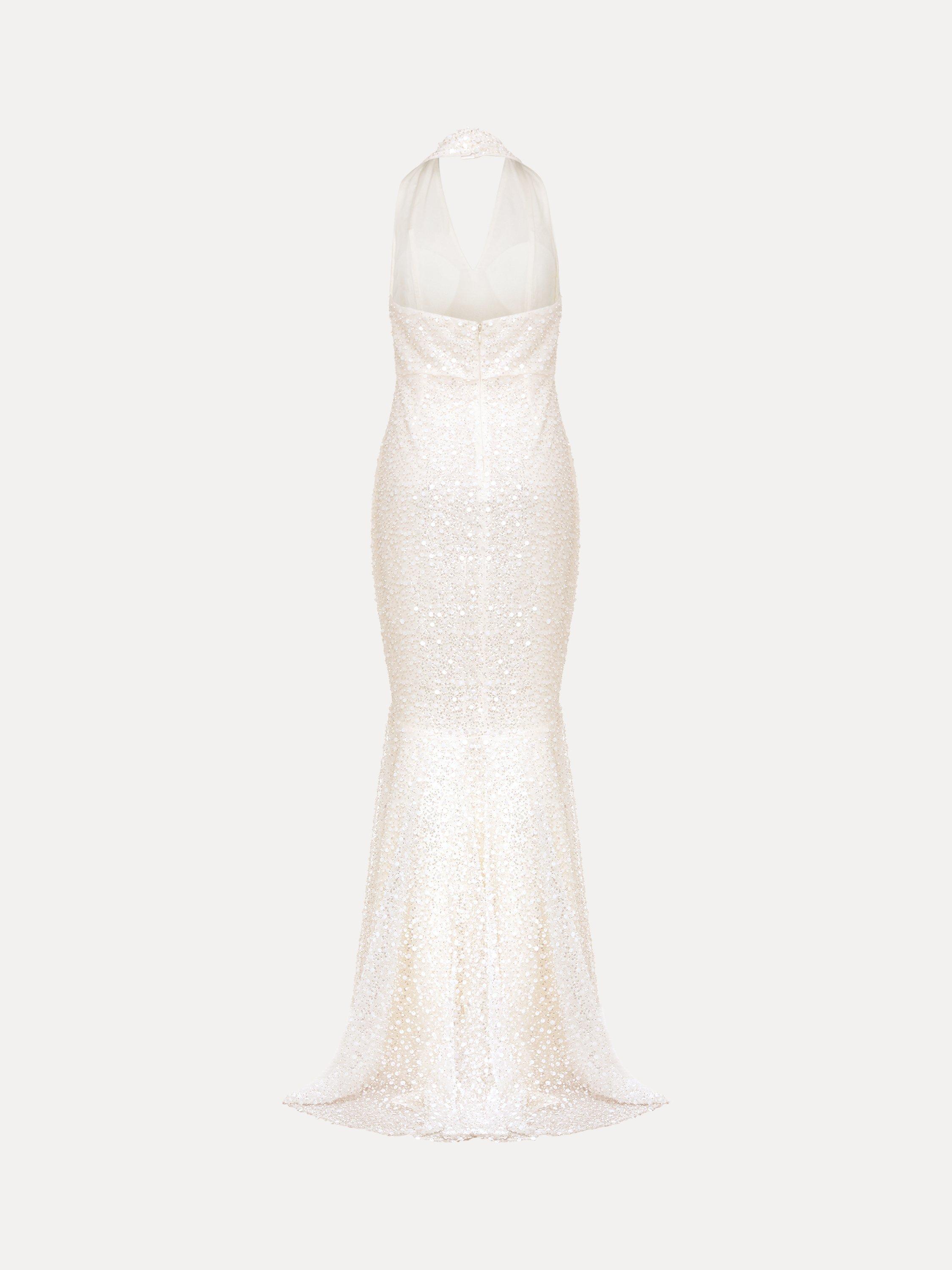 Full of glamour, this all-over embellished dress is designed with a feminine halterneck and open back and sits close to the body to show off your figure. Simply style with bridal heels and you're ready to say "I do".