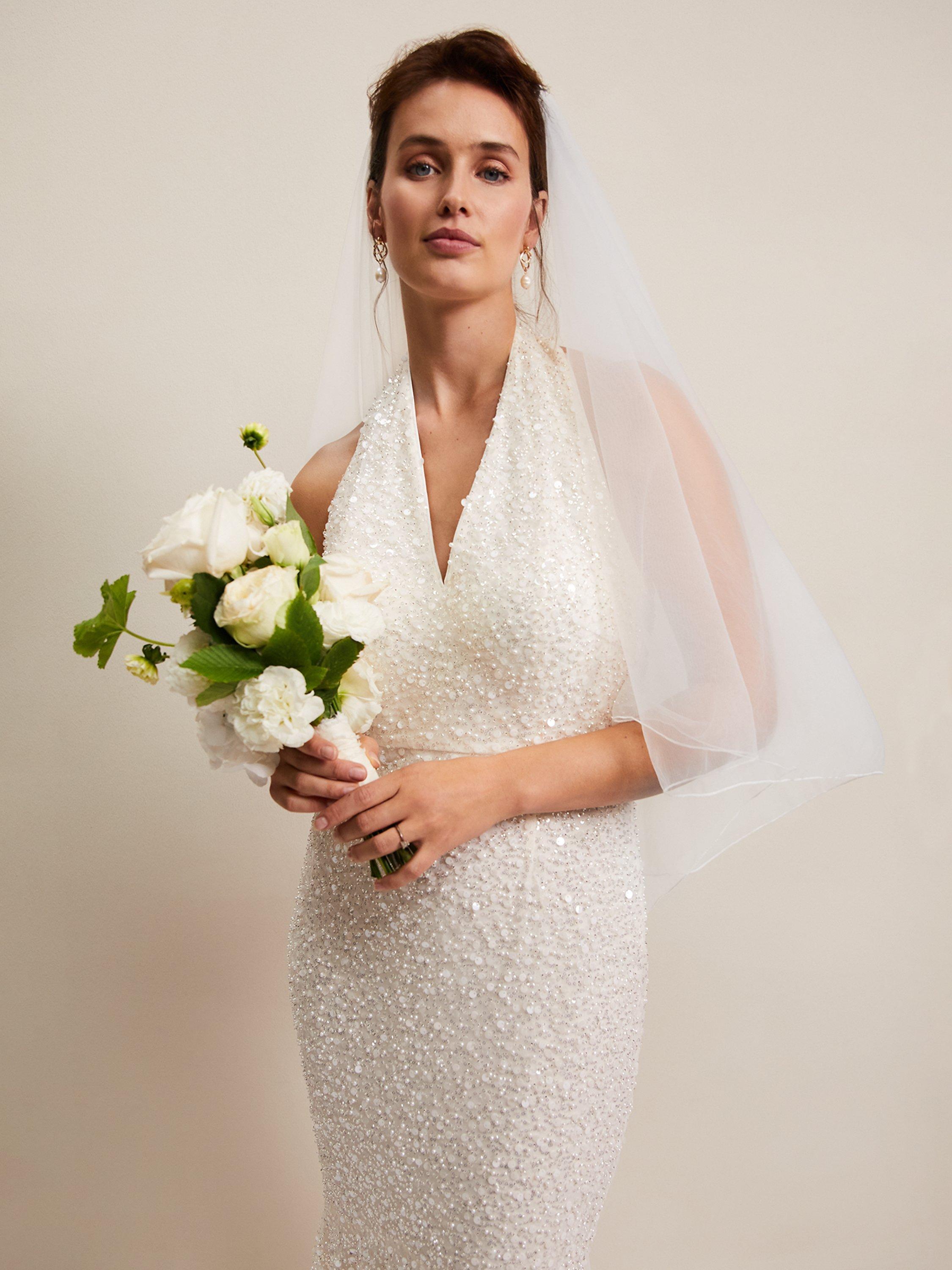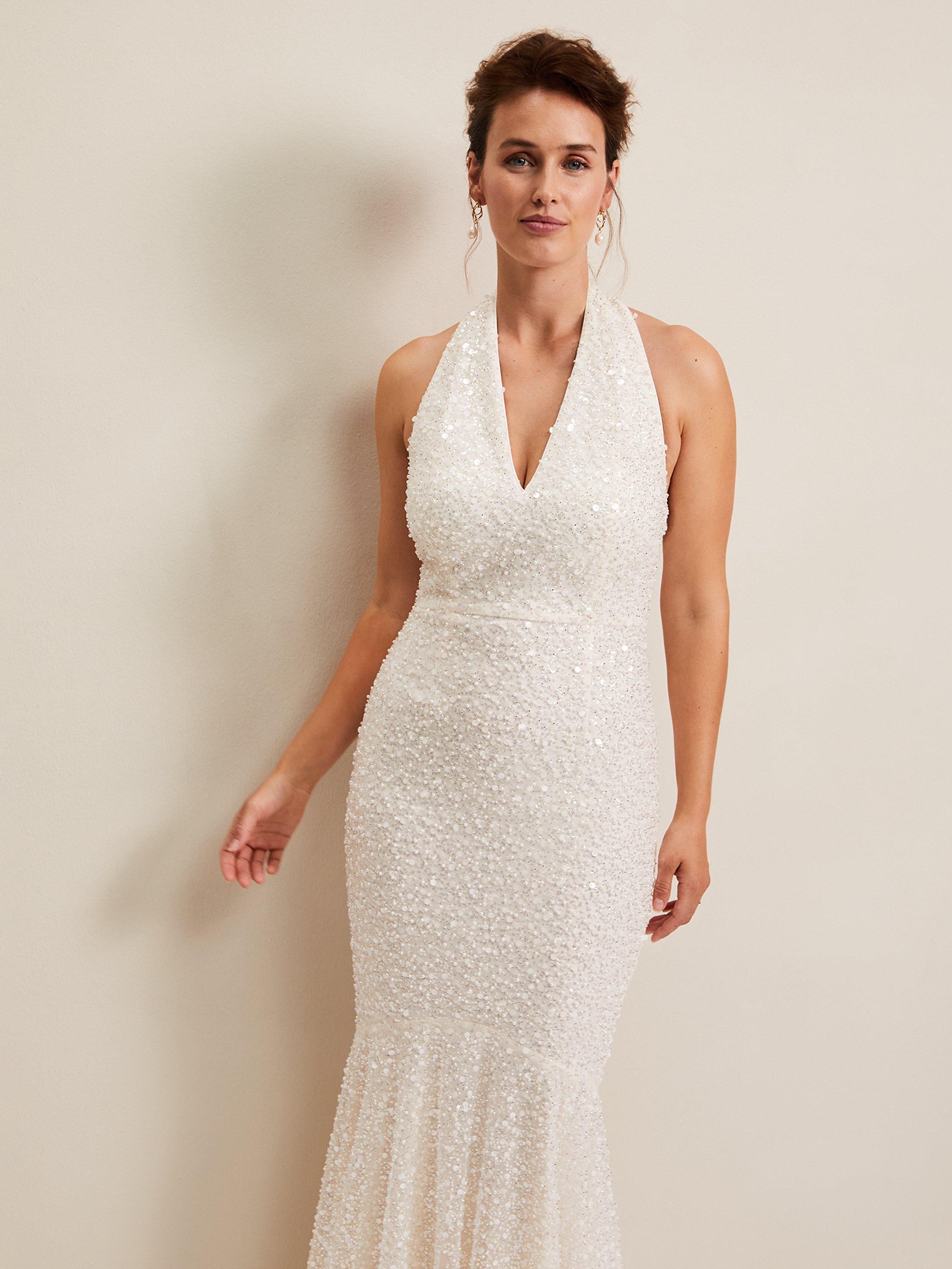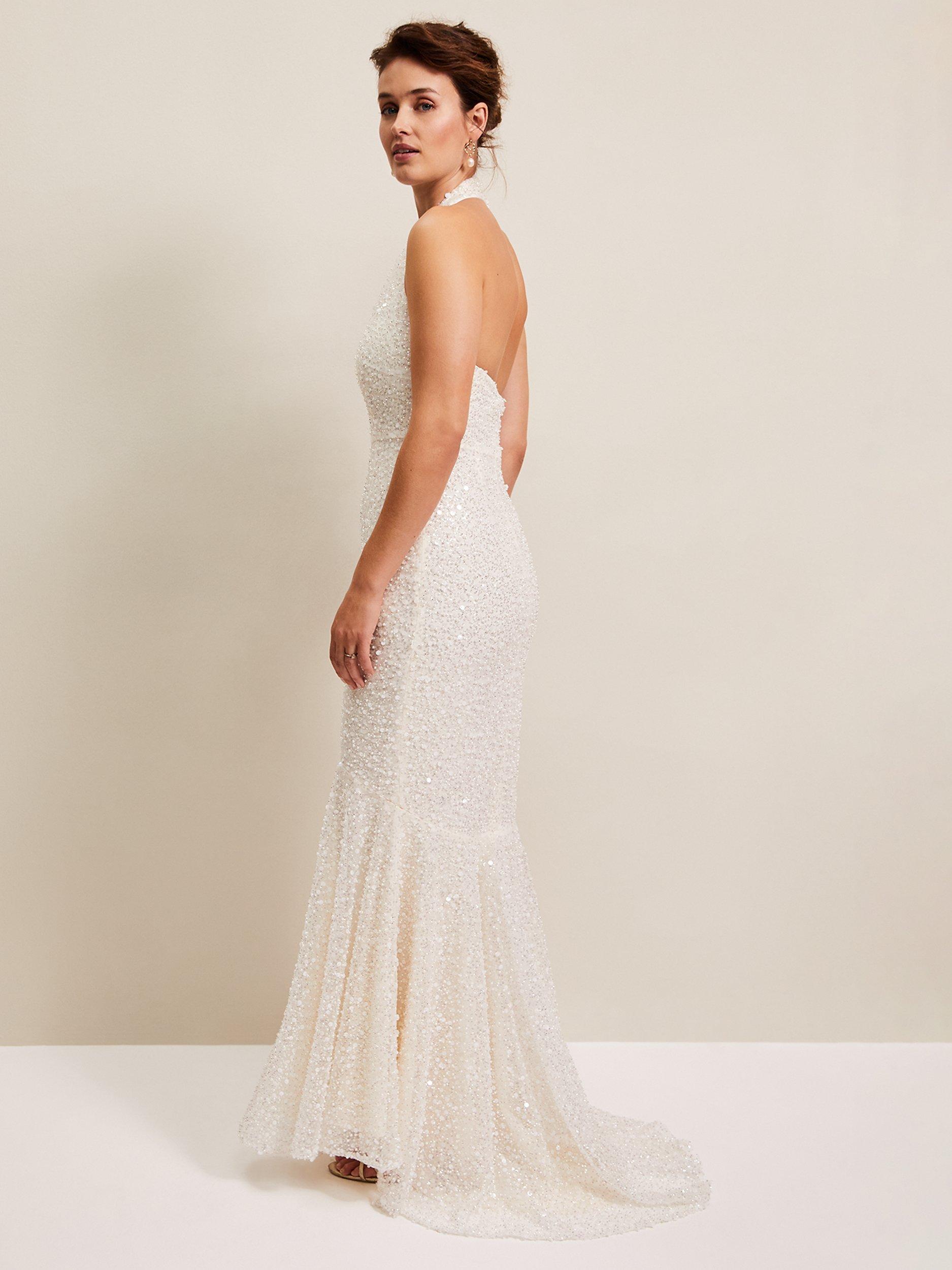 Full of glamour, this all-over embellished dress is designed with a feminine halterneck and open back and sits close to the body to show off your figure. Simply style with bridal heels and you're ready to say "I do".