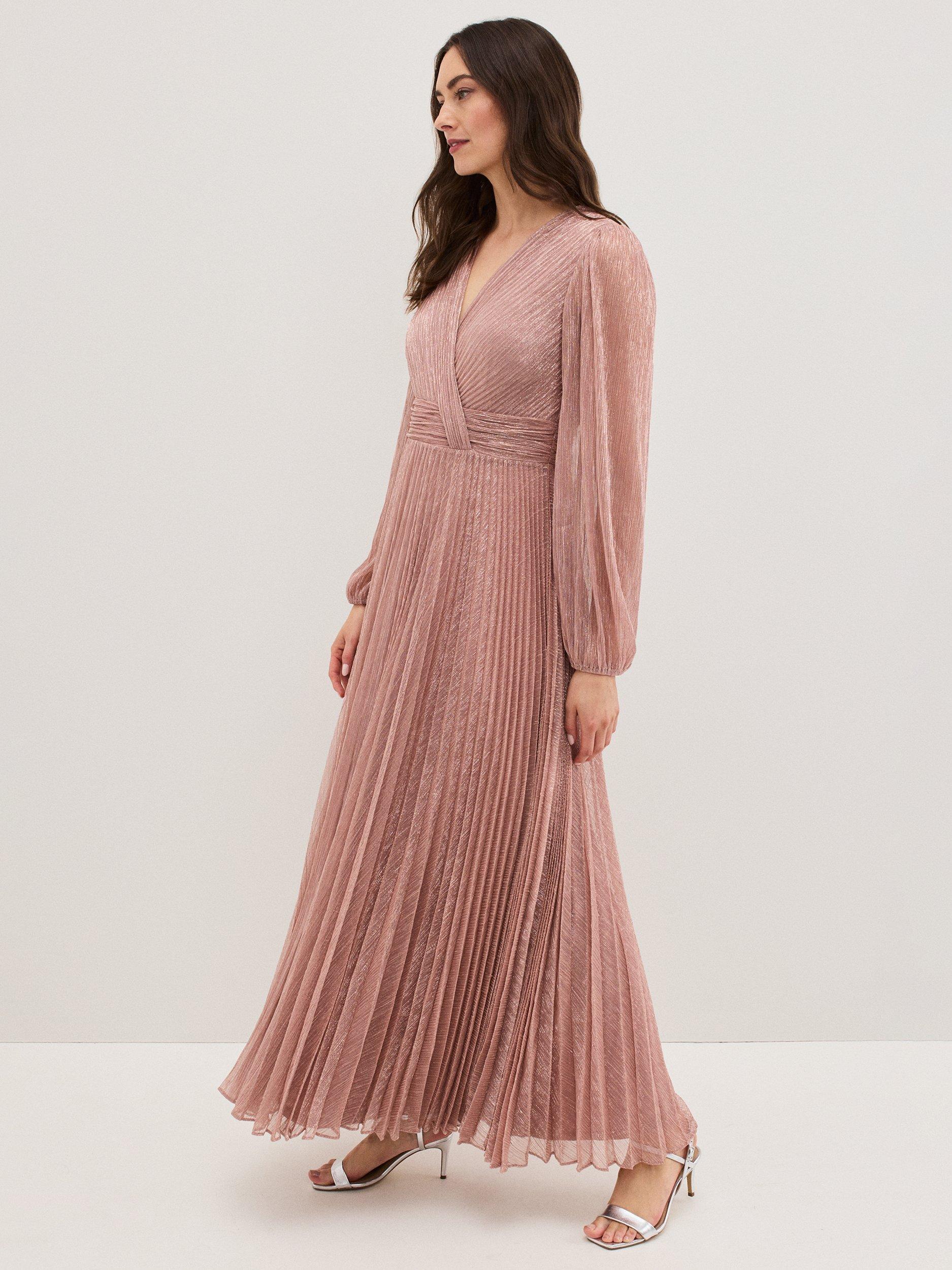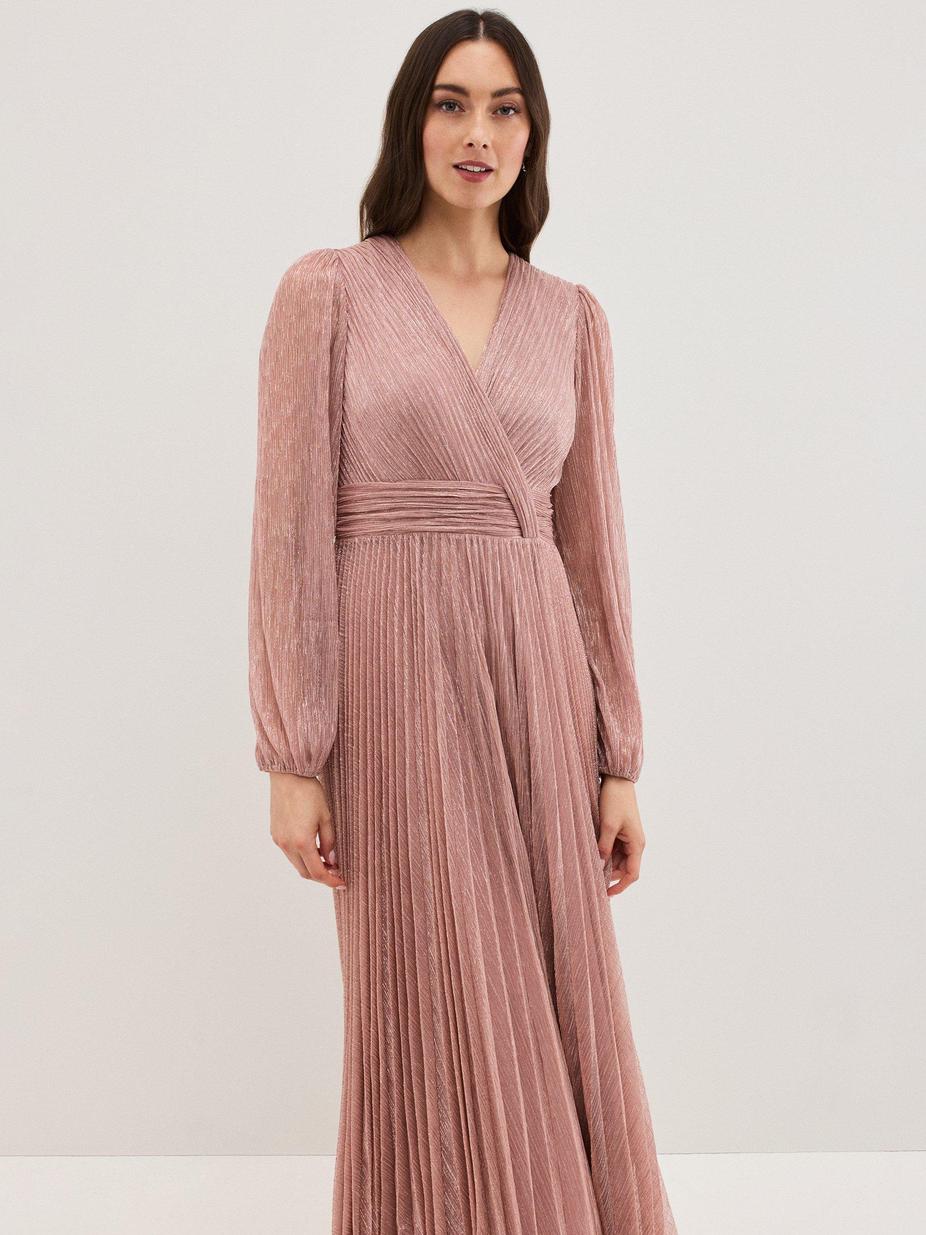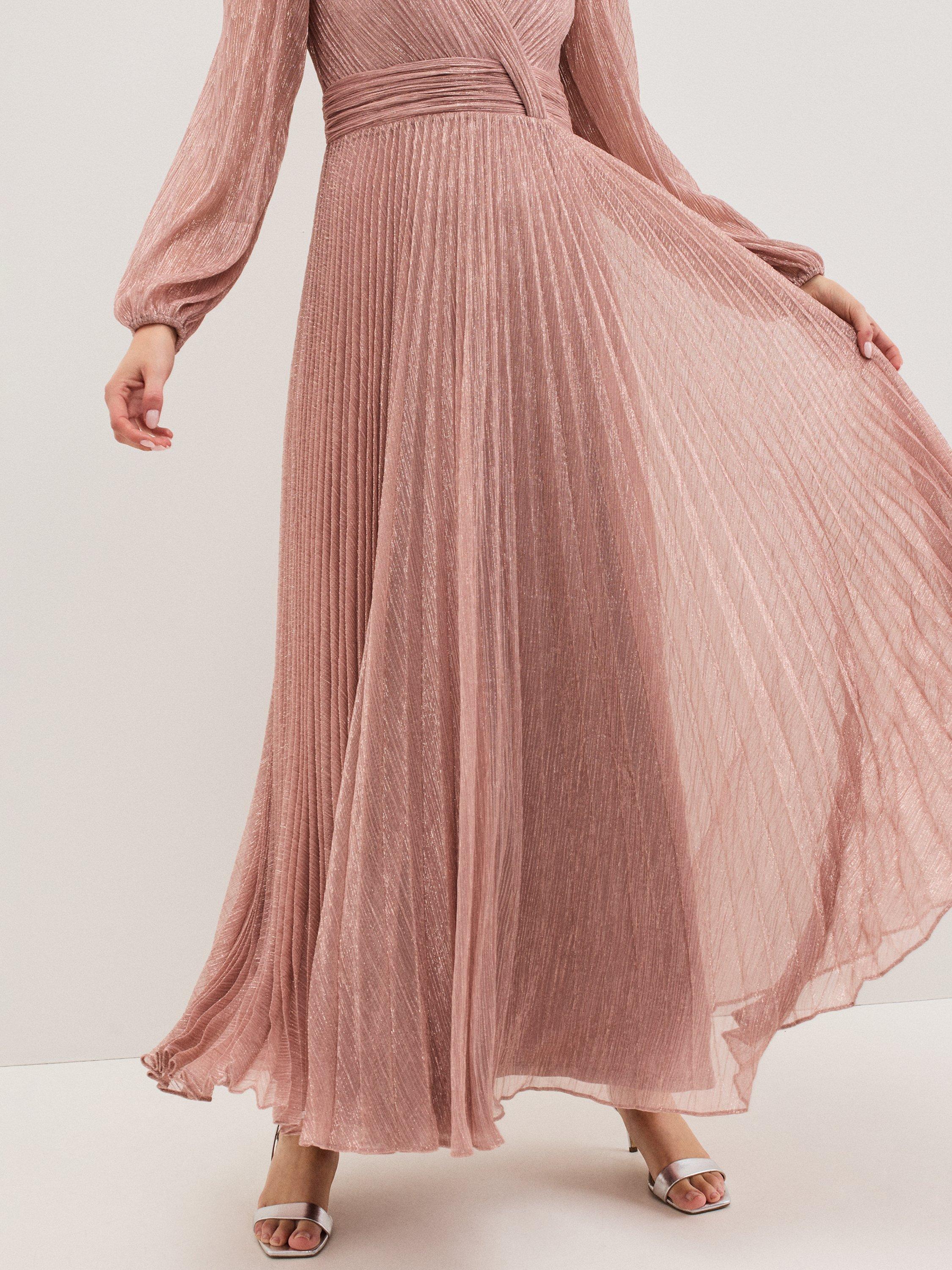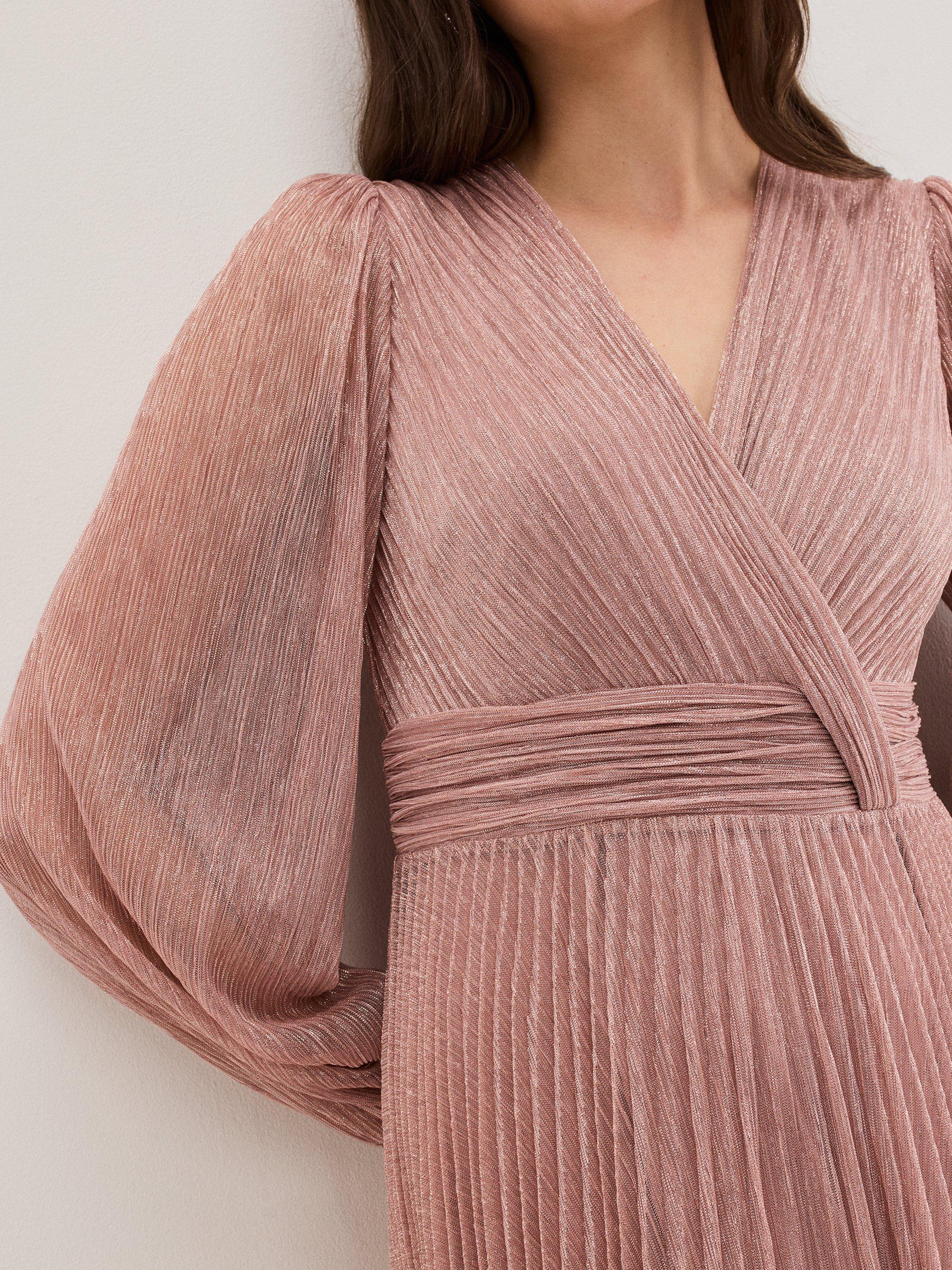 The Harper maxi dress makes for an effortless statement. Featuring feminine details, including blouson sleeves and a faux wrap bodice, it is an elegant event style. The delicate pleats are interwoven with subtle shimmer, perfect for a modern bridesmaid look.