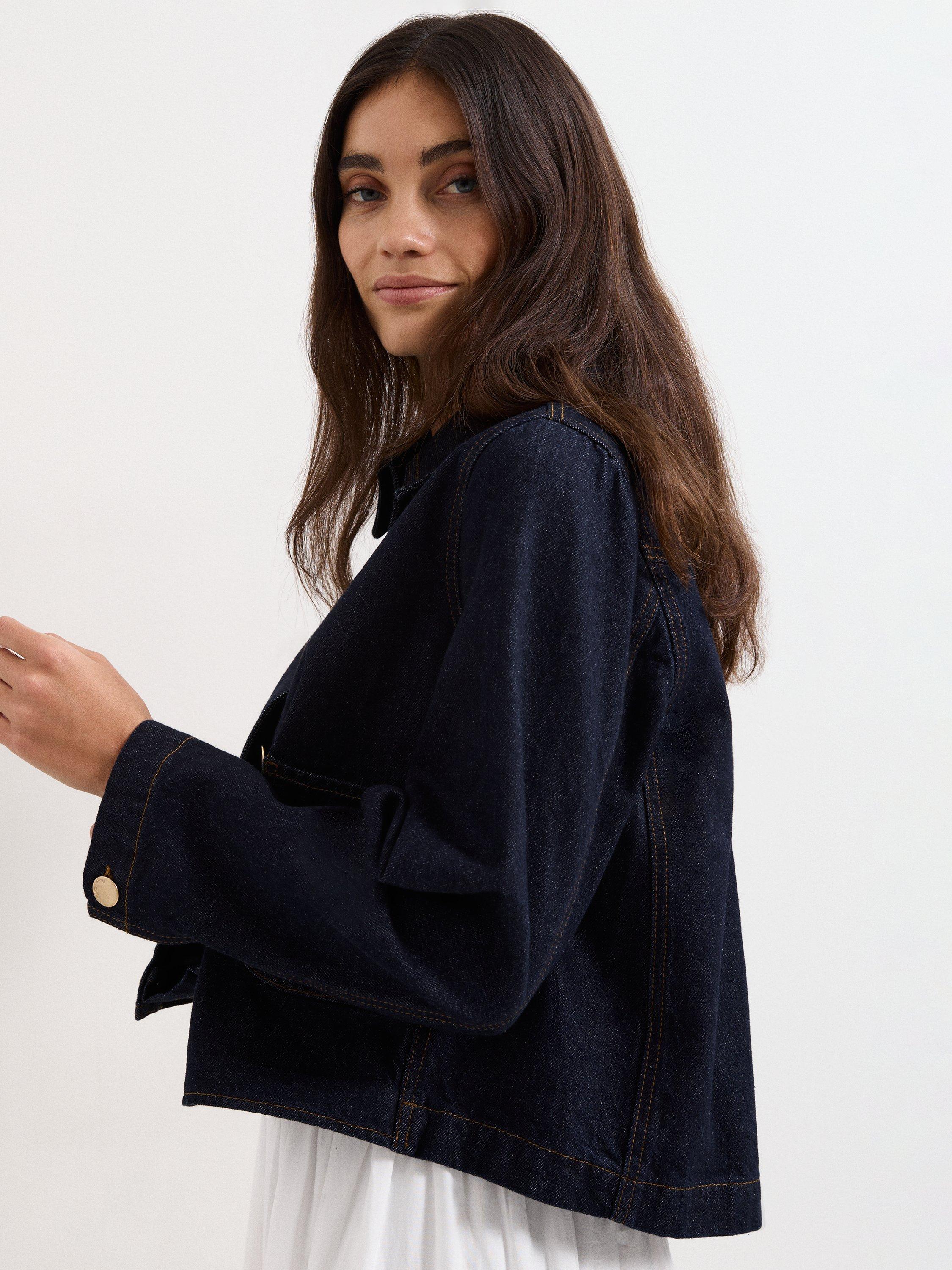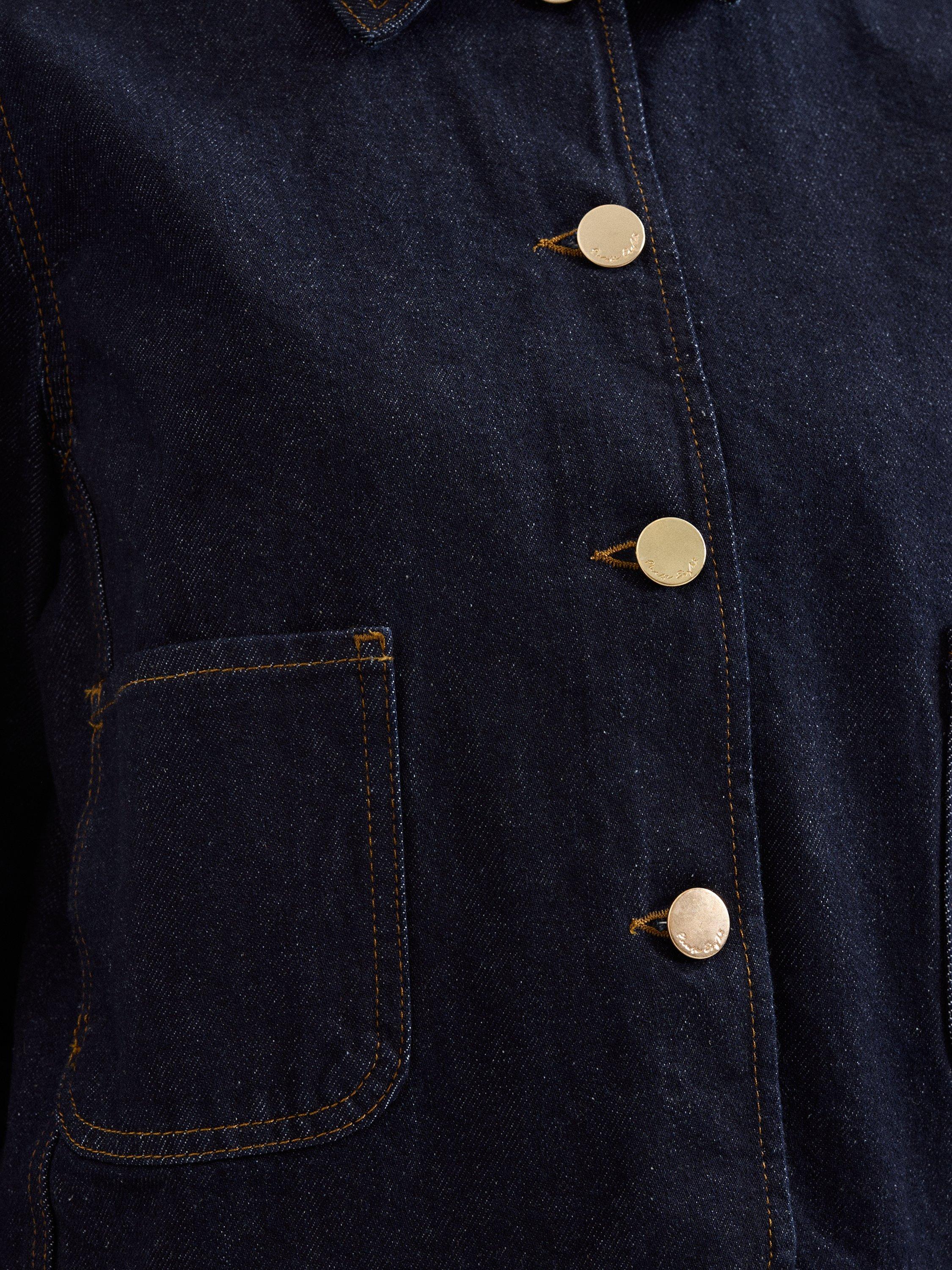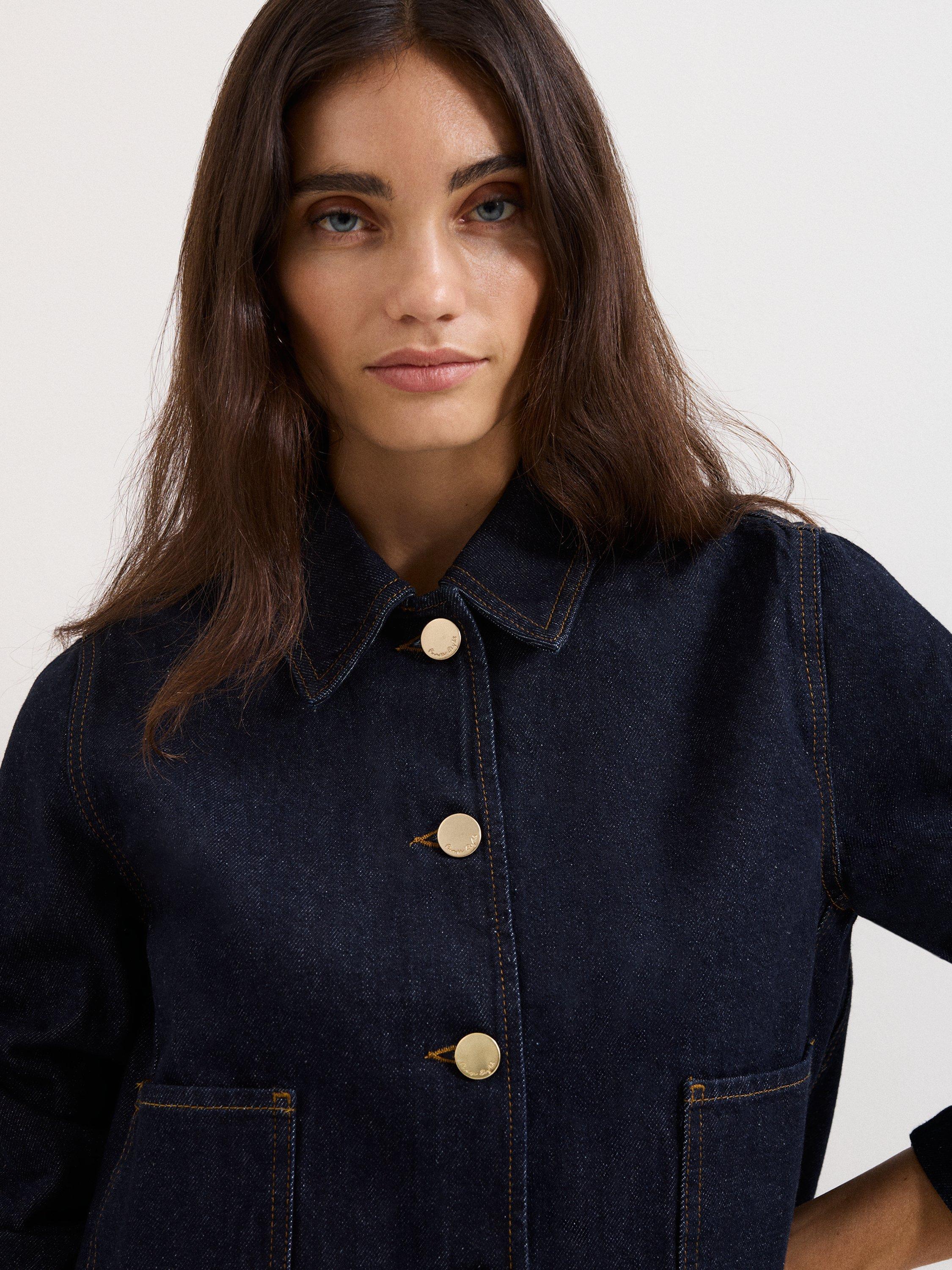 Indira Denim Jacket in a smart tailored style with gold buttons for elevated elegance.