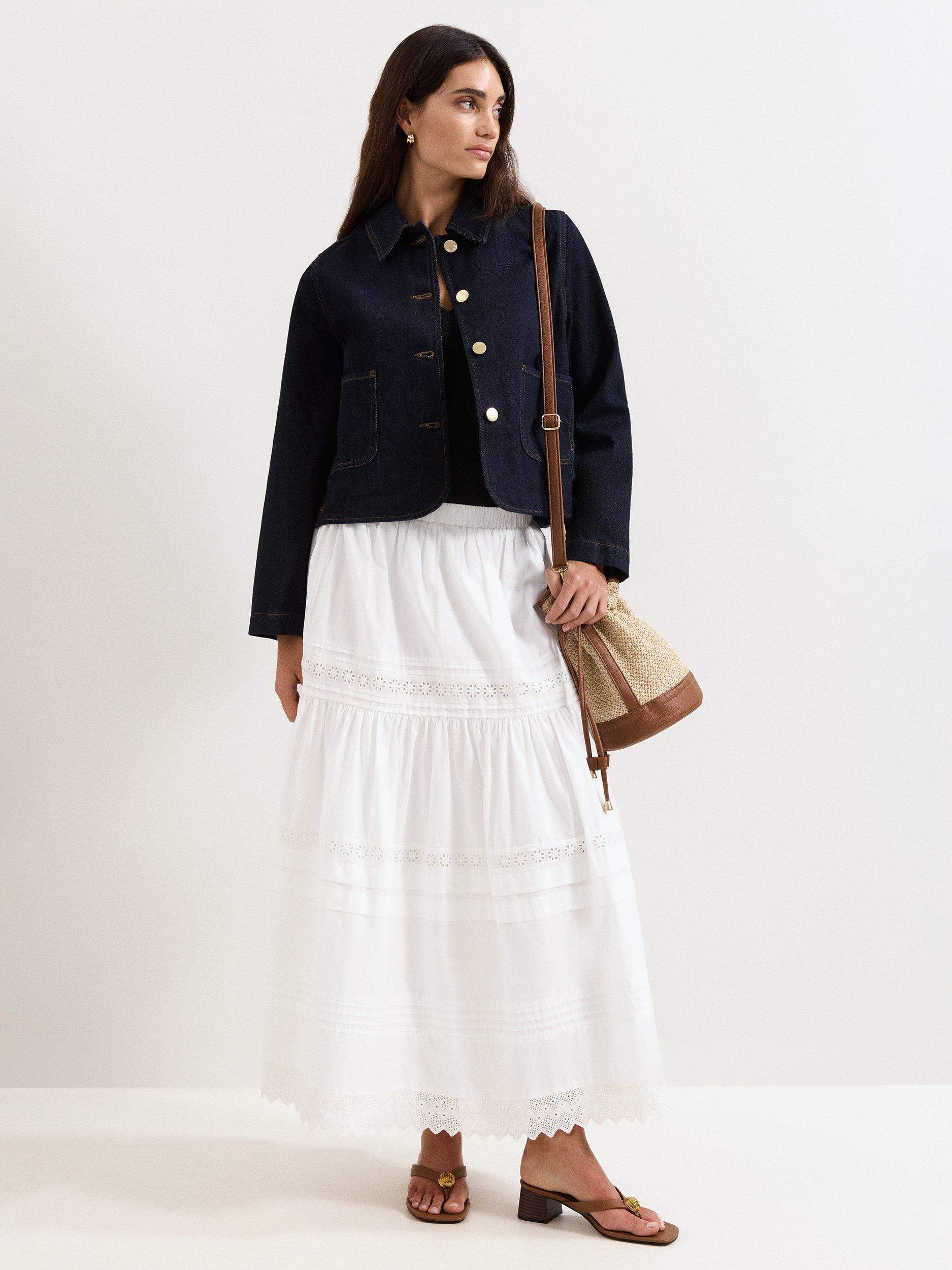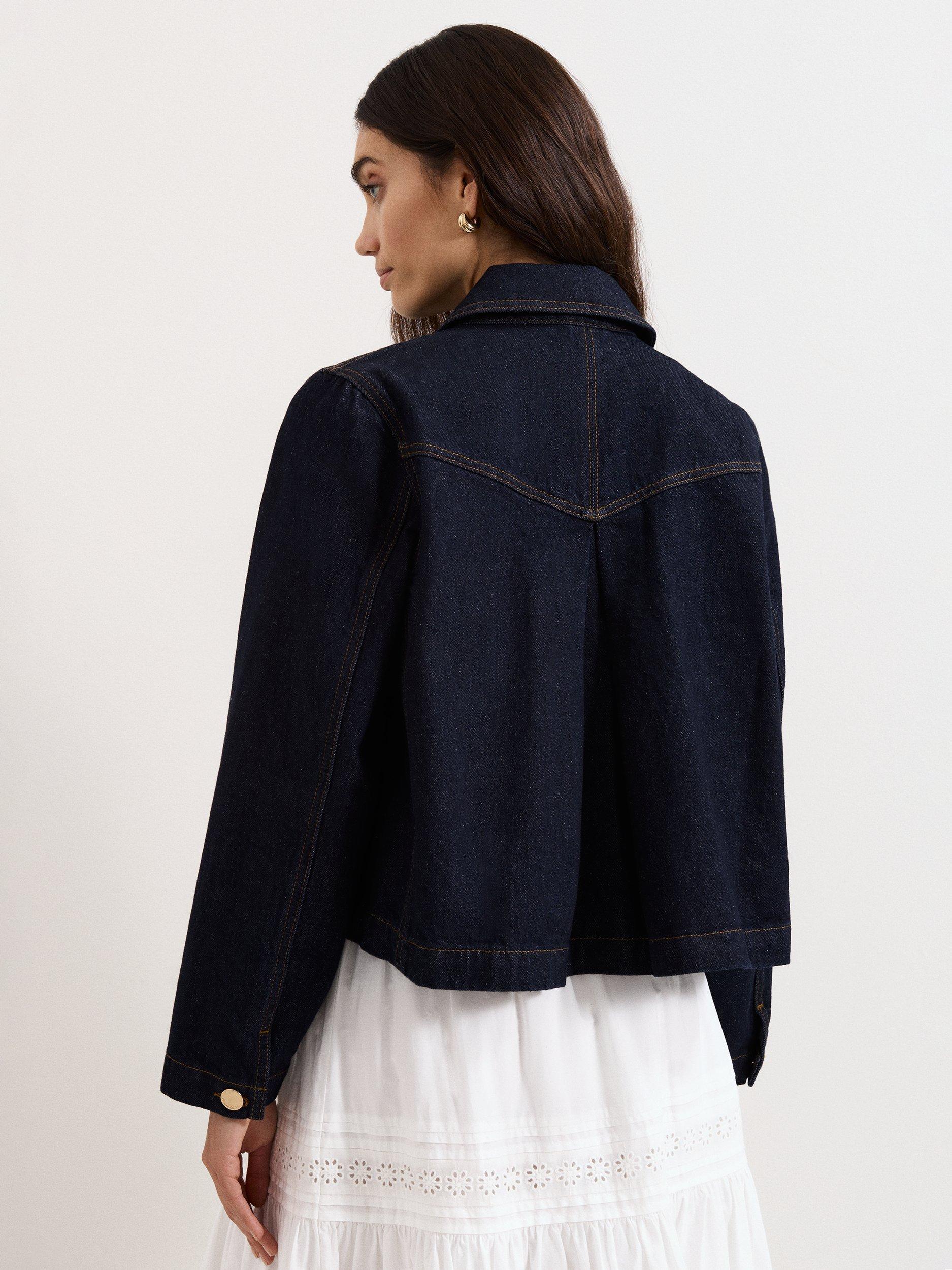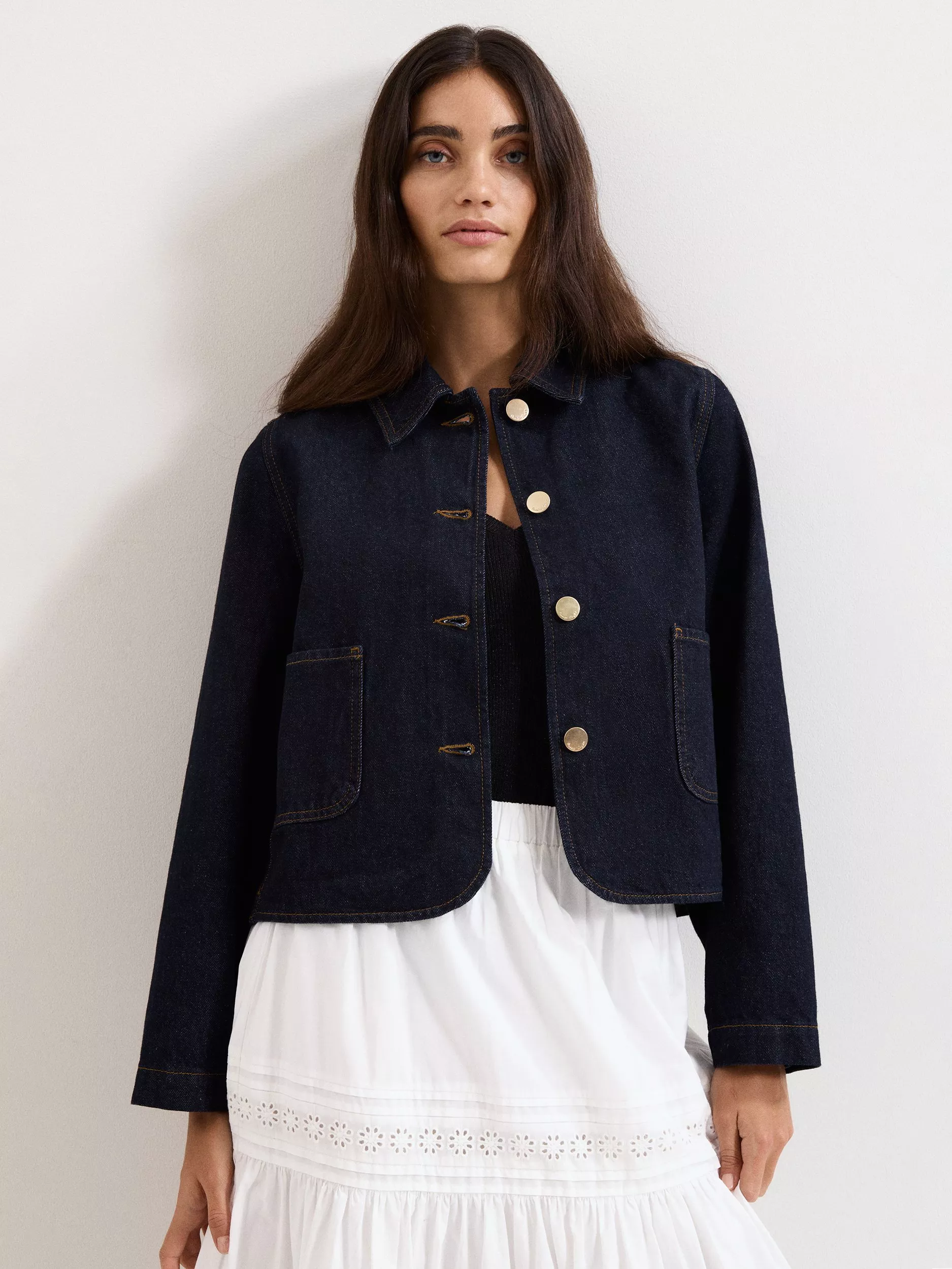 Indira Denim Jacket in a smart tailored style with gold buttons for elevated elegance.