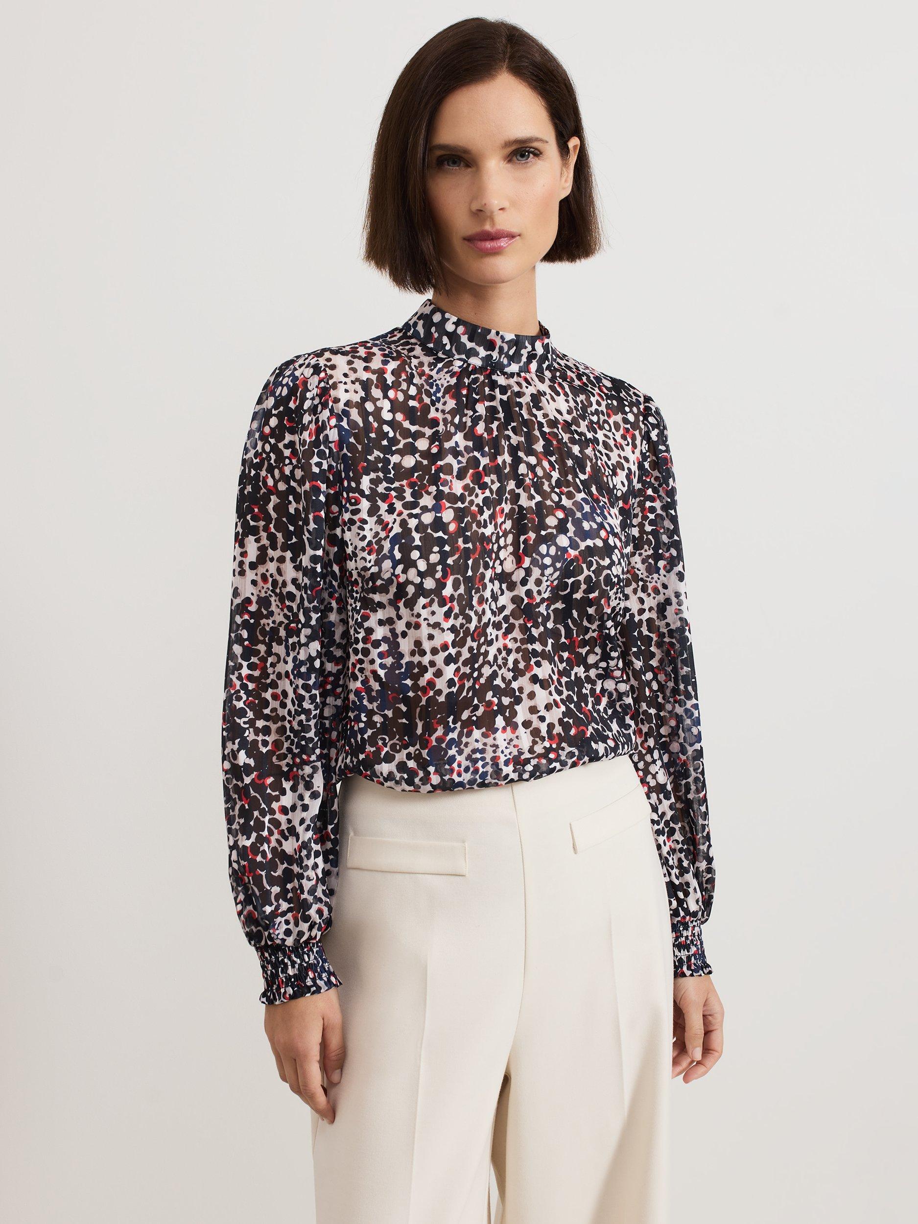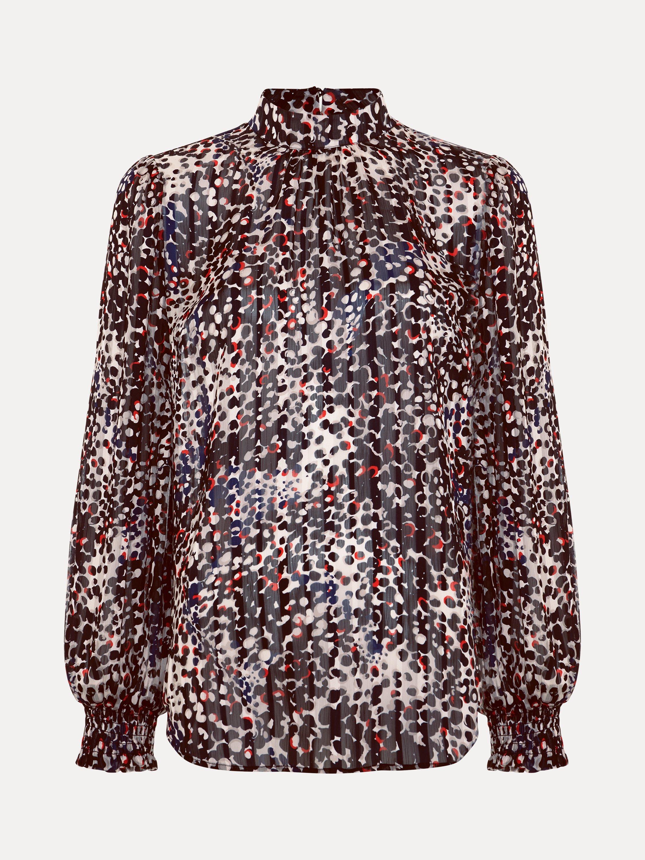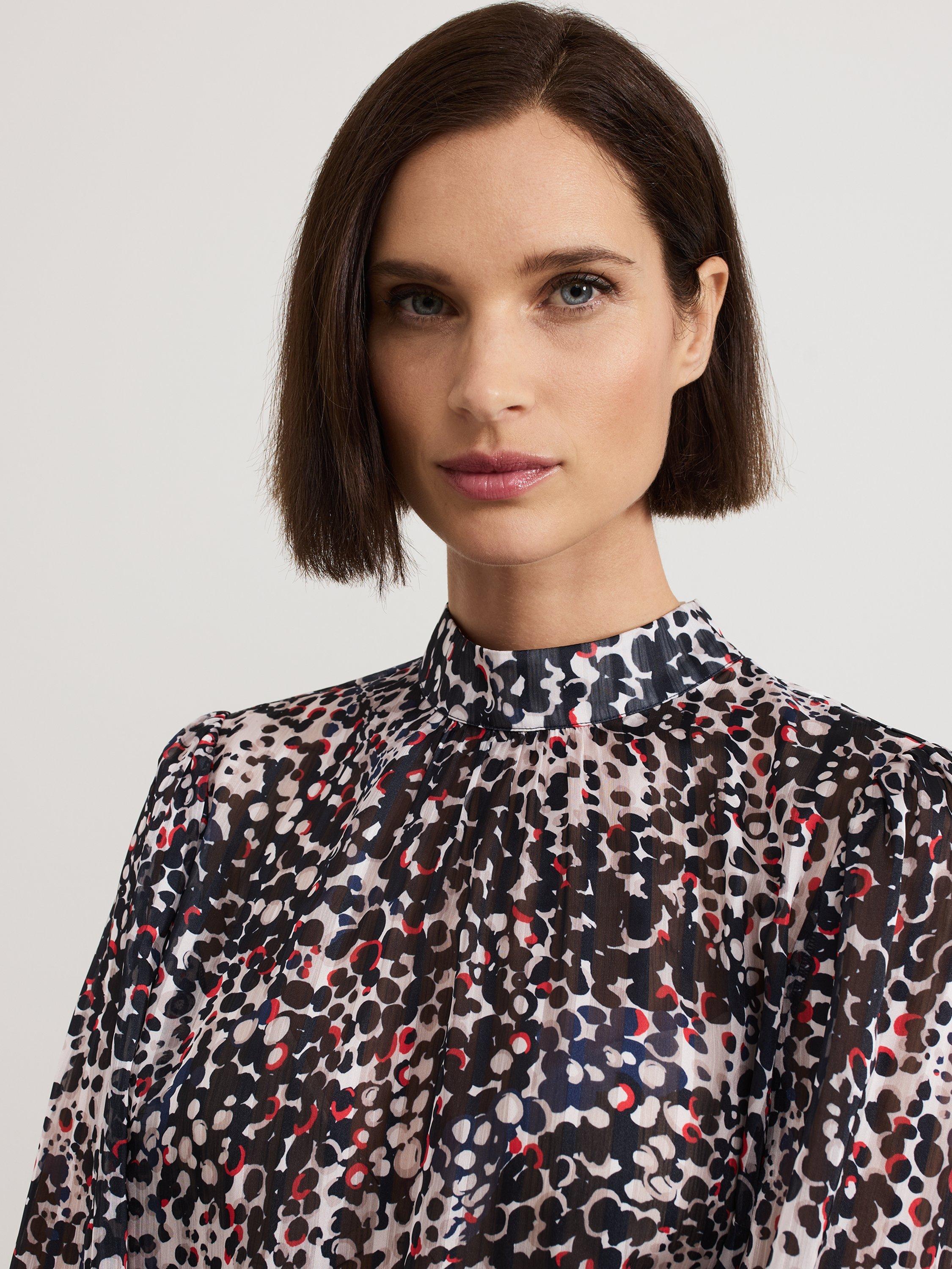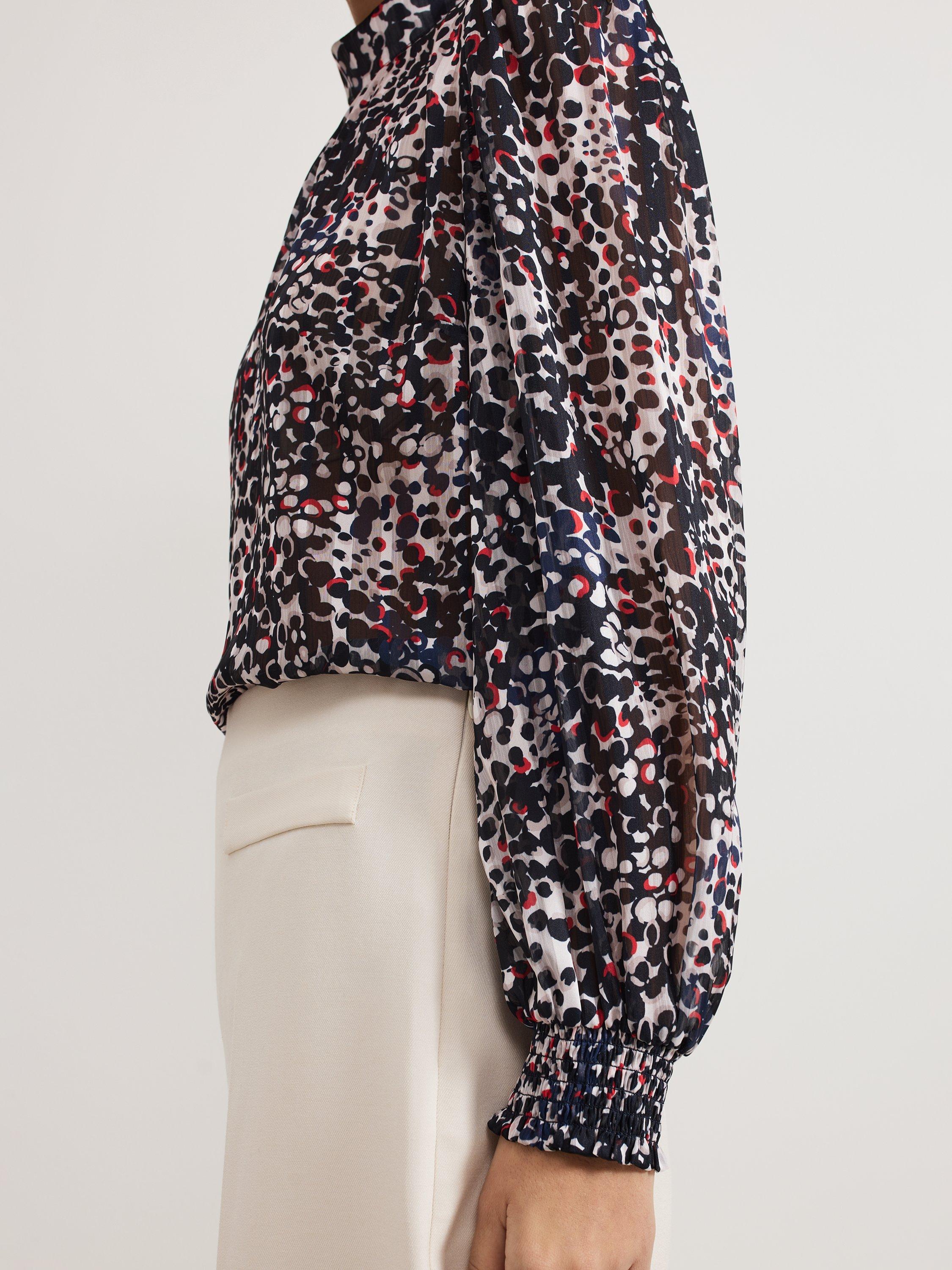 This elegant high neck blouse features an abstract spot print with contrasting pops of colour. The cinched cuffs create elegant blouson sleeves that add a touch of sophistication to any outfit. Perfect to style with your favourite trousers, this top is a must-have in your wardrobe.