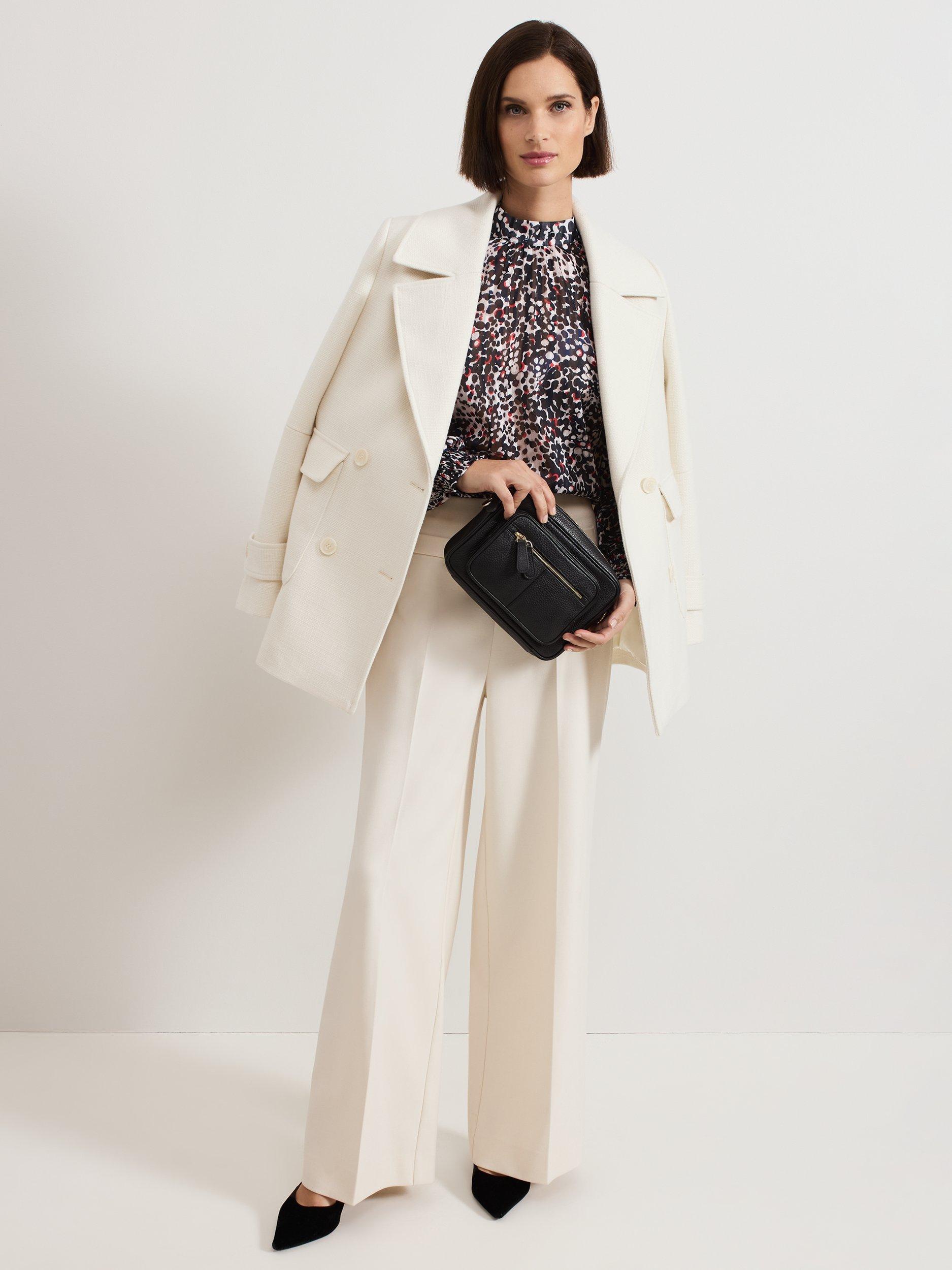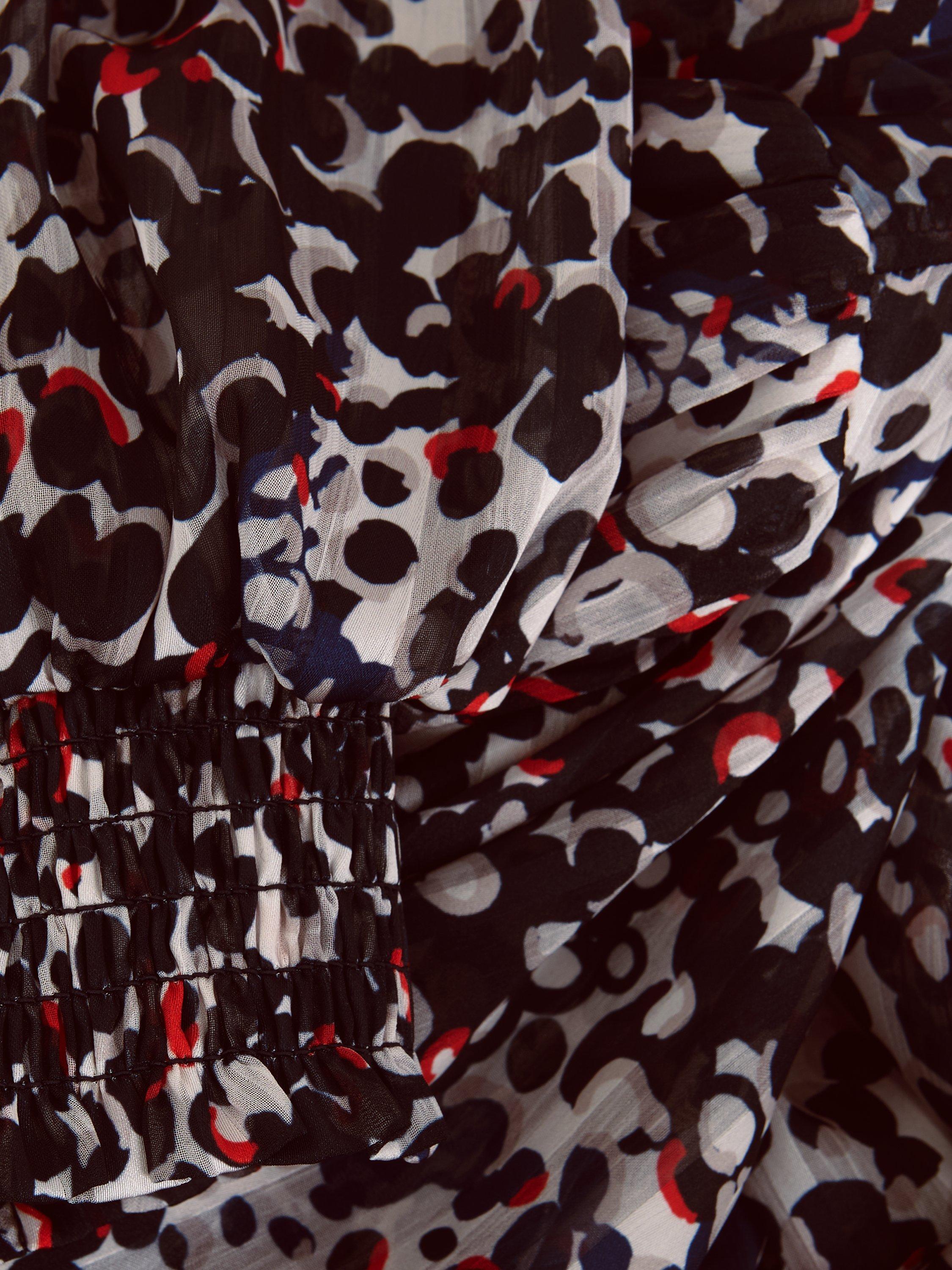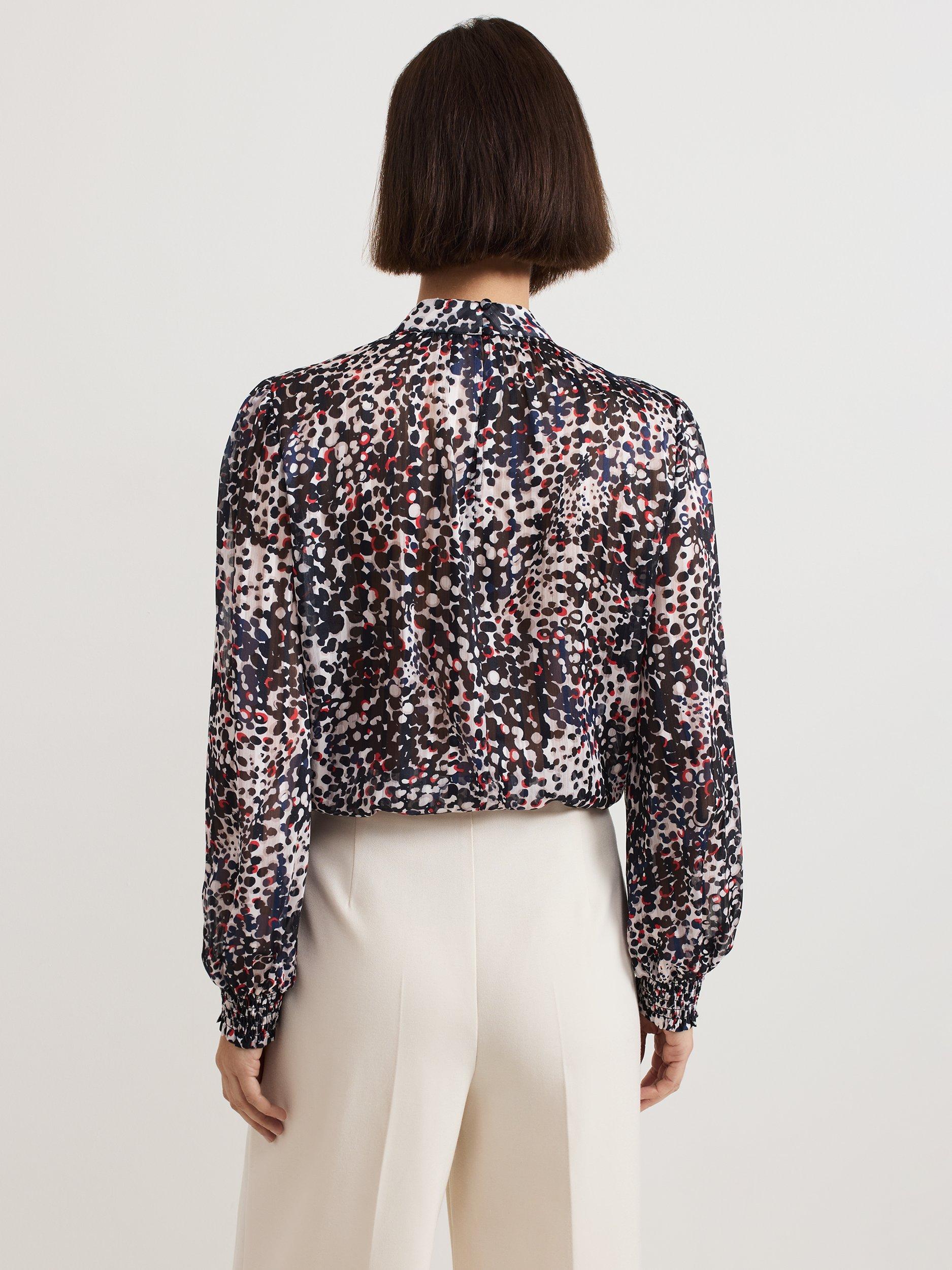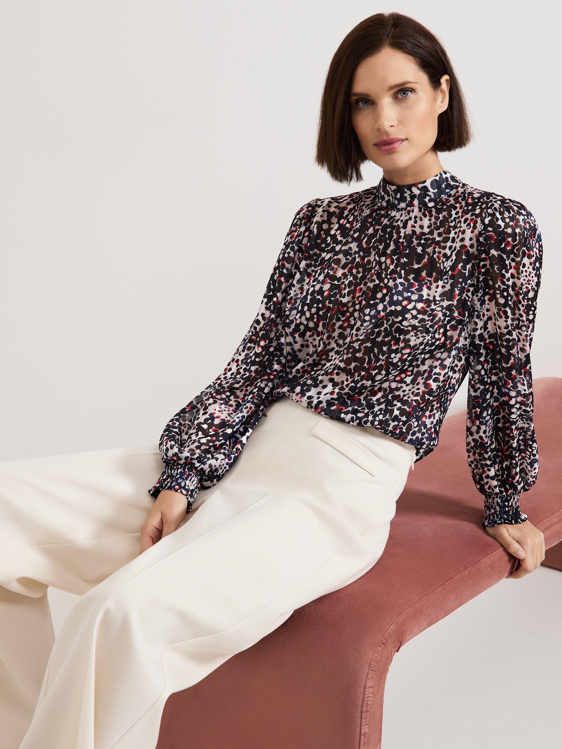 This elegant high neck blouse features an abstract spot print with contrasting pops of colour. The cinched cuffs create elegant blouson sleeves that add a touch of sophistication to any outfit. Perfect to style with your favourite trousers, this top is a must-have in your wardrobe.