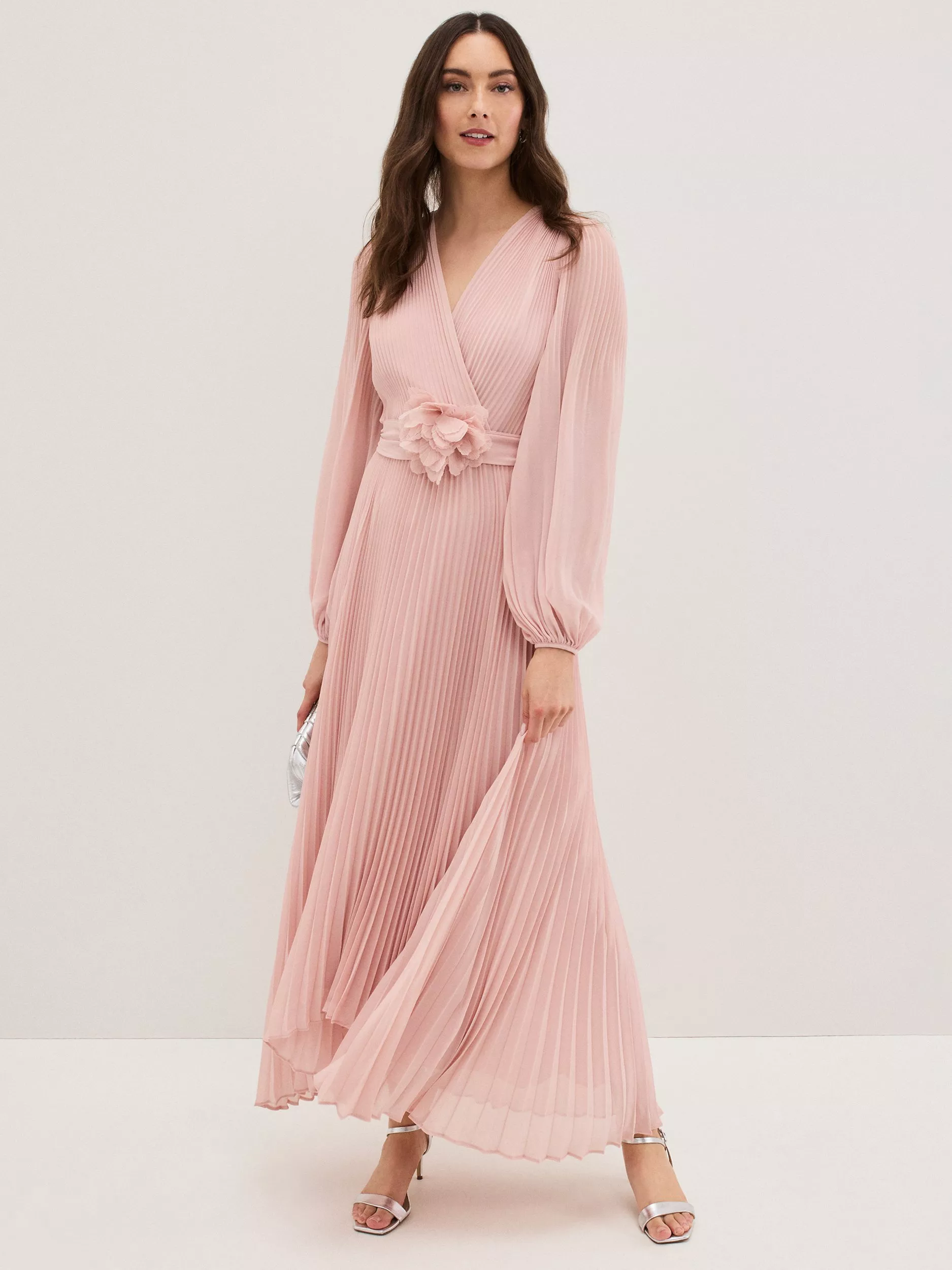 A stunning bridesmaid choice, the Isadora dress makes an effortless statement. Designed with delicate pleats throughout to create soft movement, this dress features blouson sleeves and is finished with a floral applique at the waistband for added interest. Style with matching accessories for an elegant occasion style.