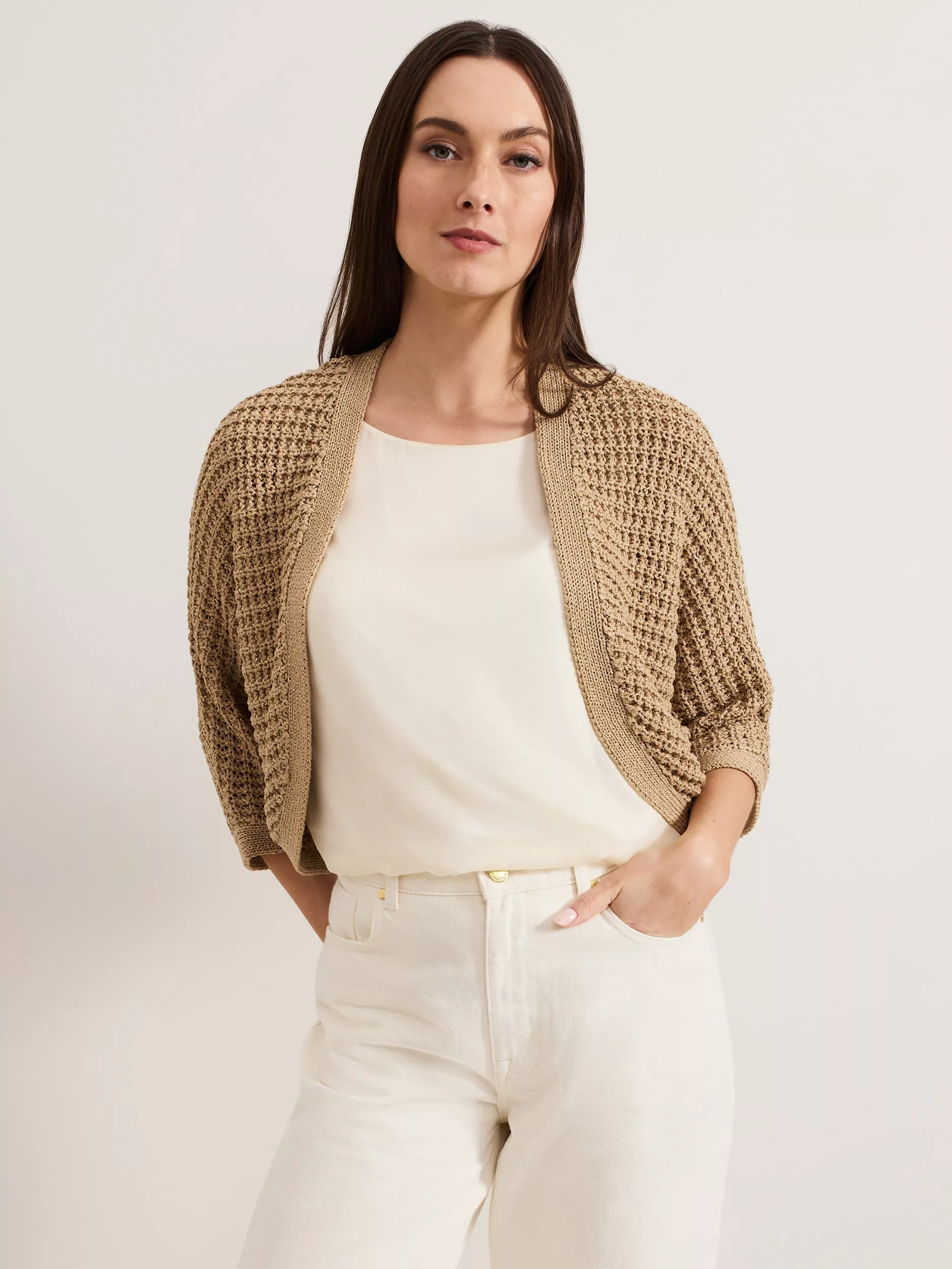 Embrace luxe layering with this chunky knitted shrug. The shade will work in every season, updated with a metallic thread for a subtle shimmer. Batwing sleeves and ribbed detailing at the hems create a relaxed silhouette, perfect for wearing day-to-day.
