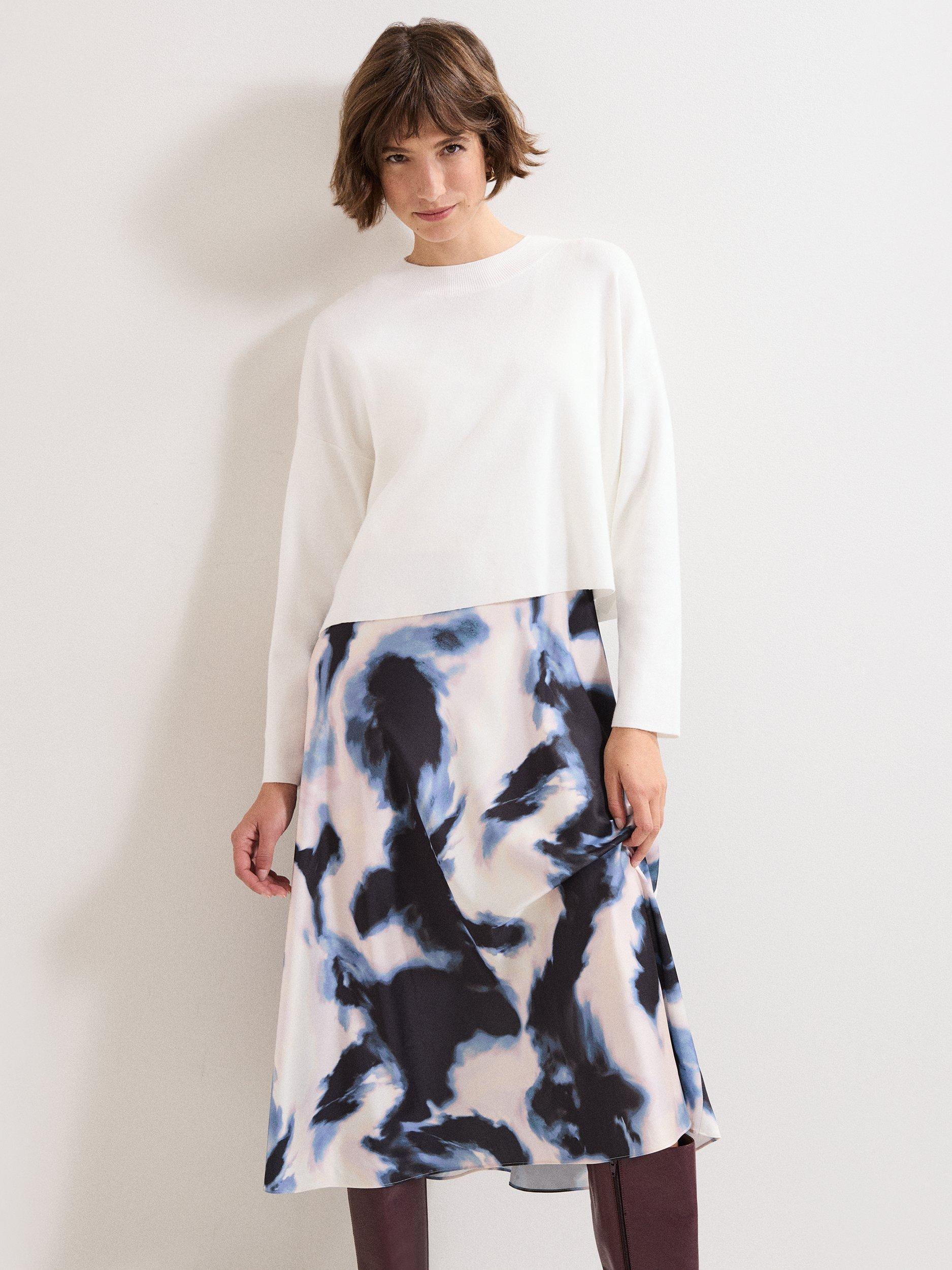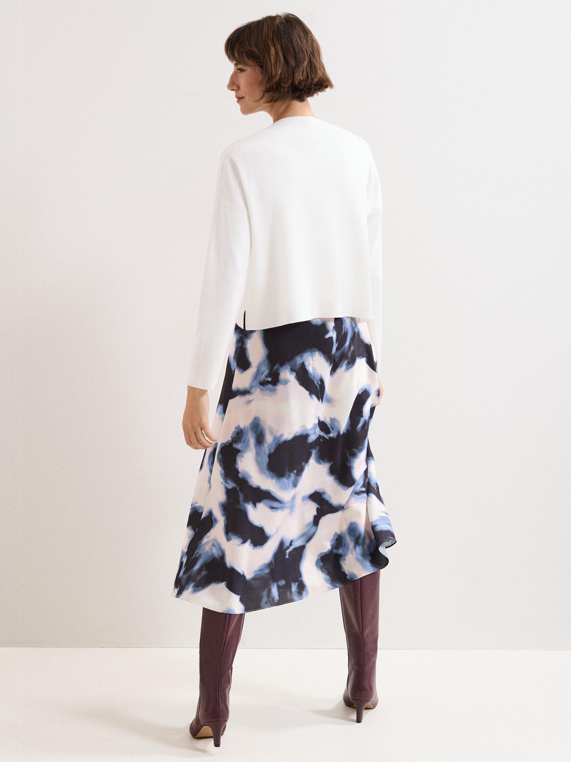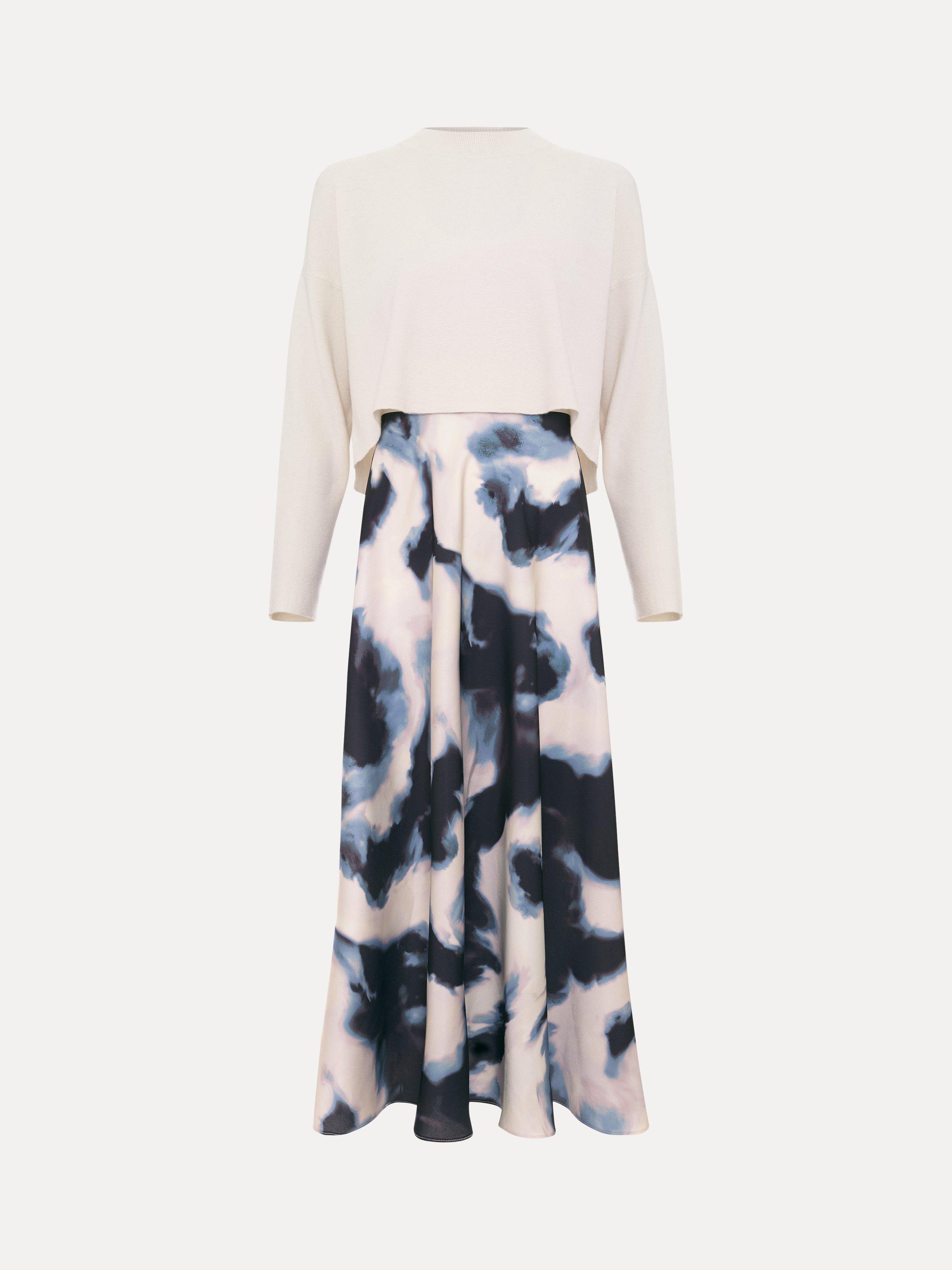 The ultimate 2-in-1 style. With a beautiful abstract print skirt designed in luxe woven satin, this versatile dress features a simple, sophisticated bodice with a detachable soft, knit. The perfect style for transitional looks or taking you from sunny days to chilly nights.