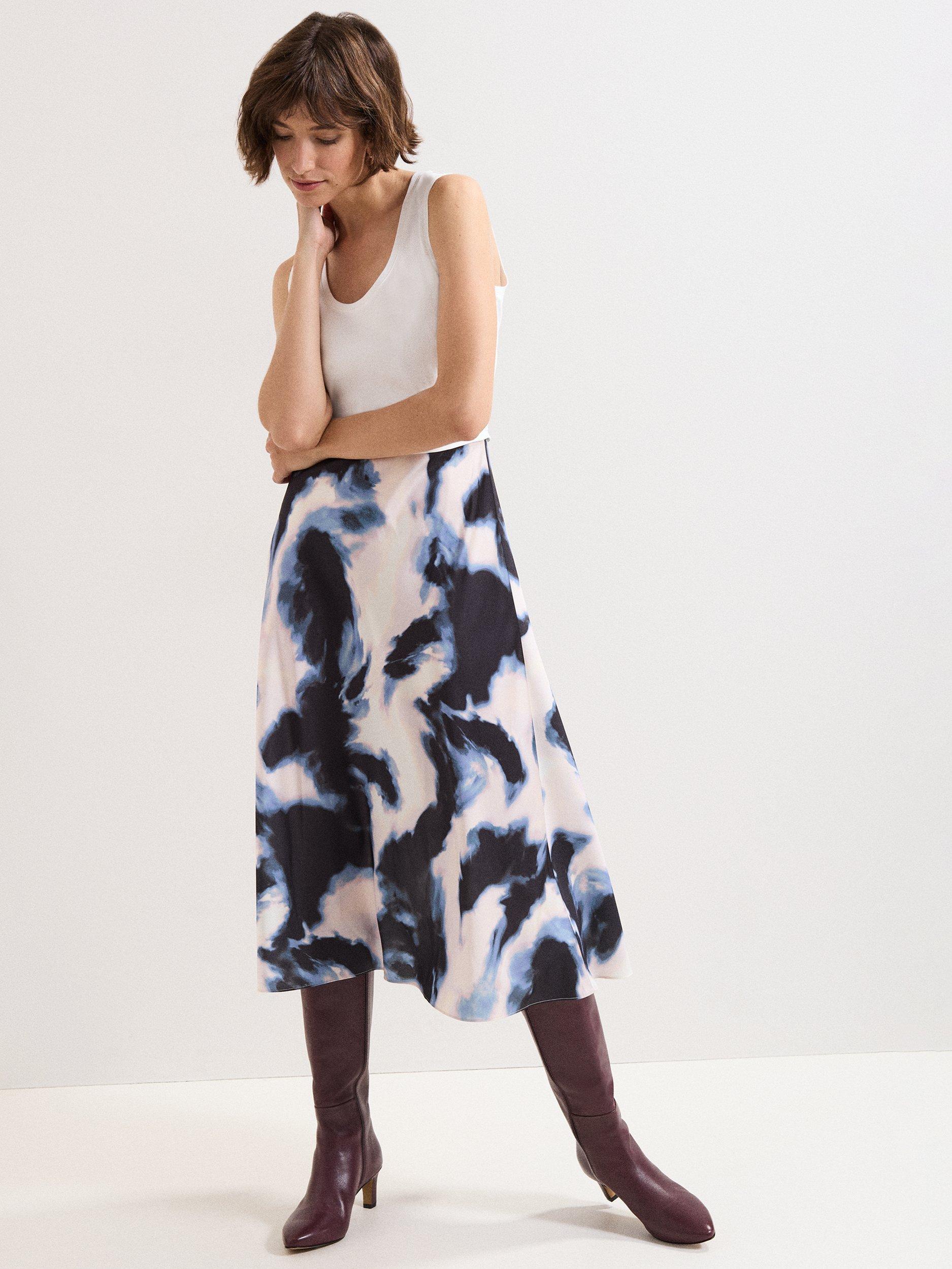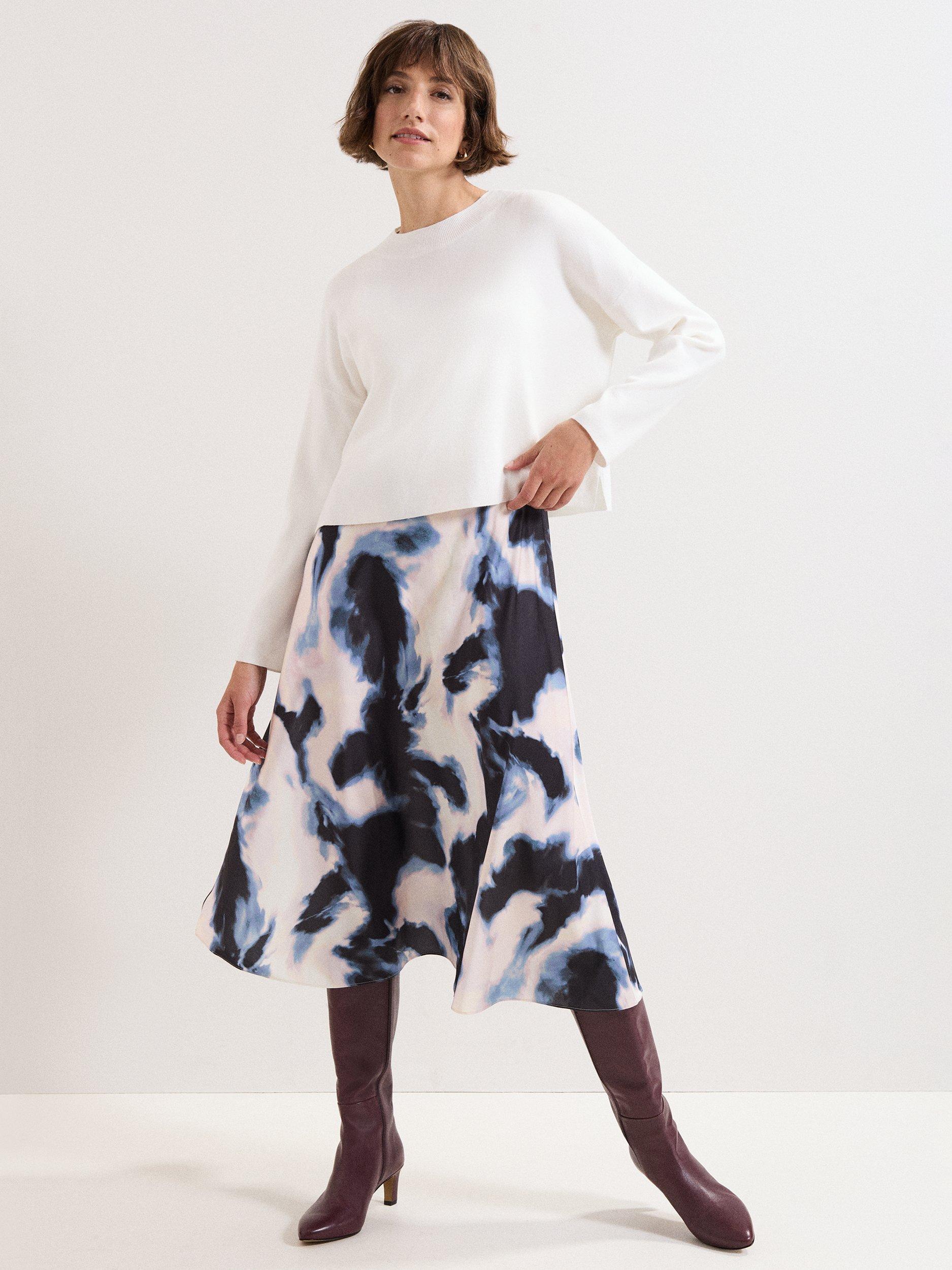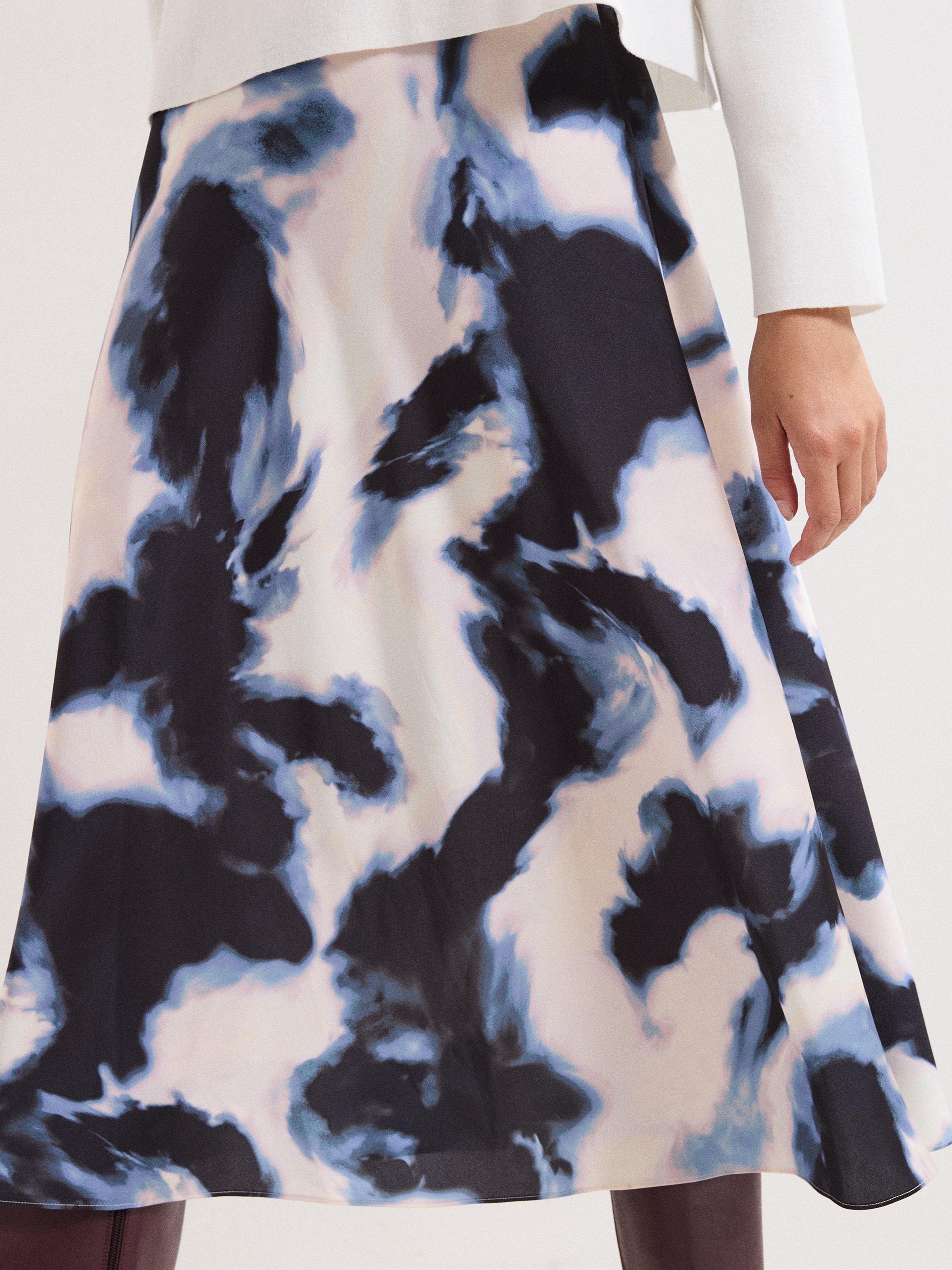 The ultimate 2-in-1 style. With a beautiful abstract print skirt designed in luxe woven satin, this versatile dress features a simple, sophisticated bodice with a detachable soft, knit. The perfect style for transitional looks or taking you from sunny days to chilly nights.