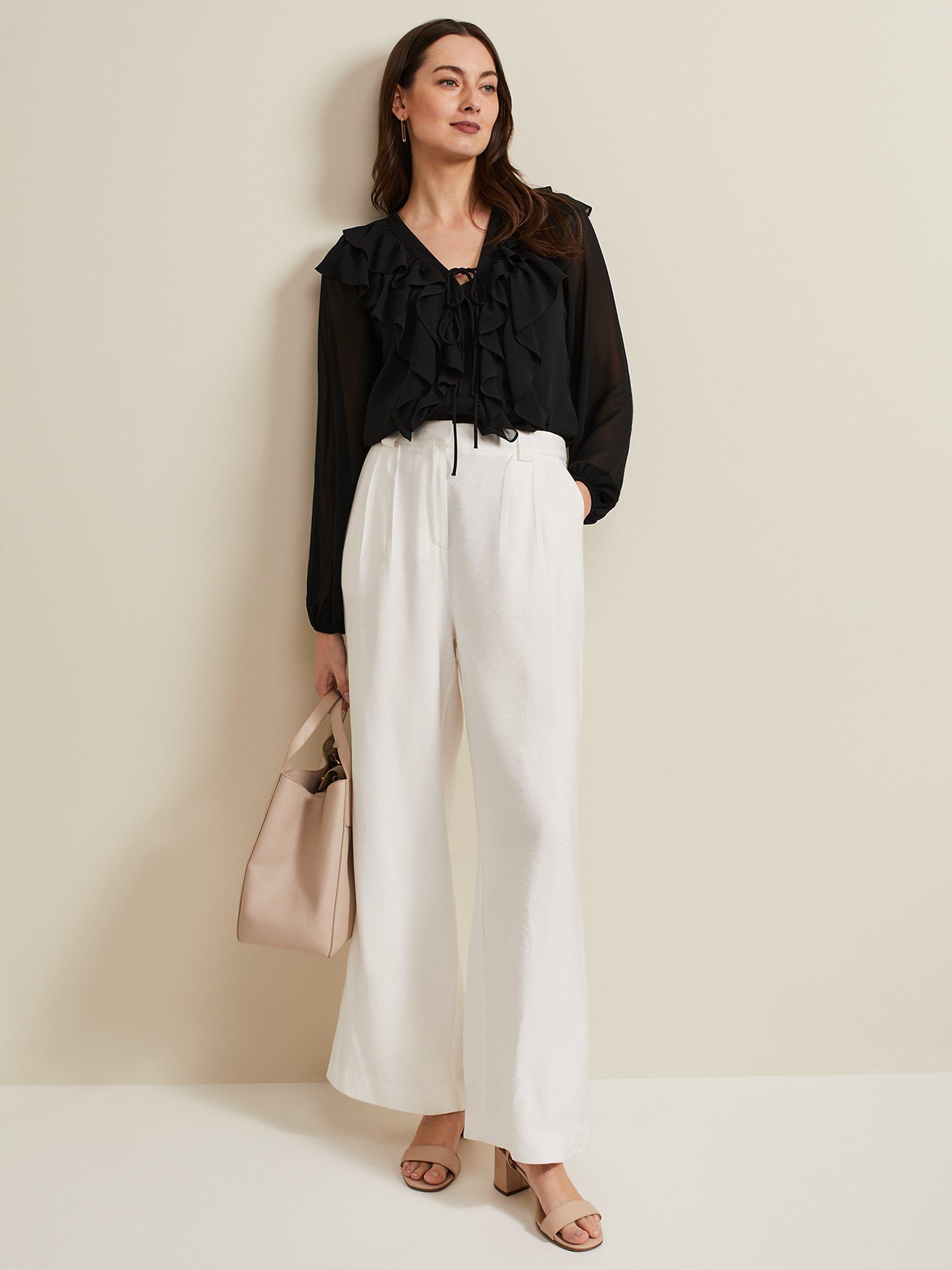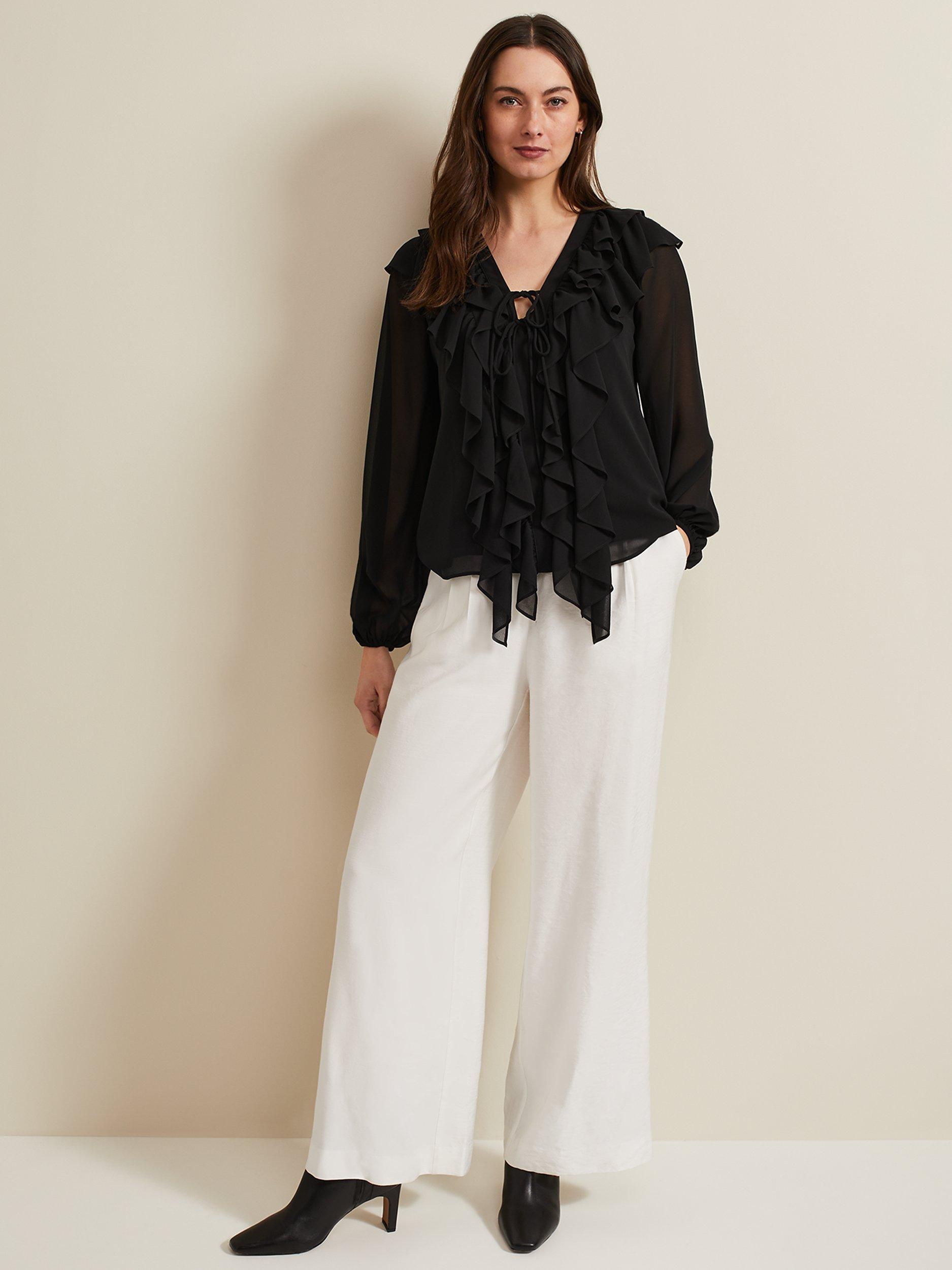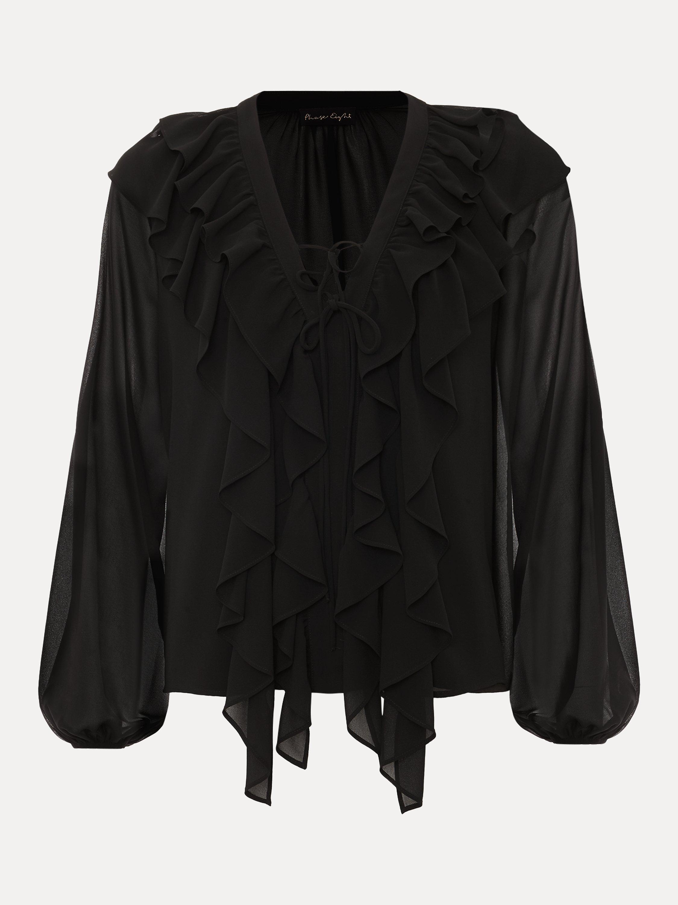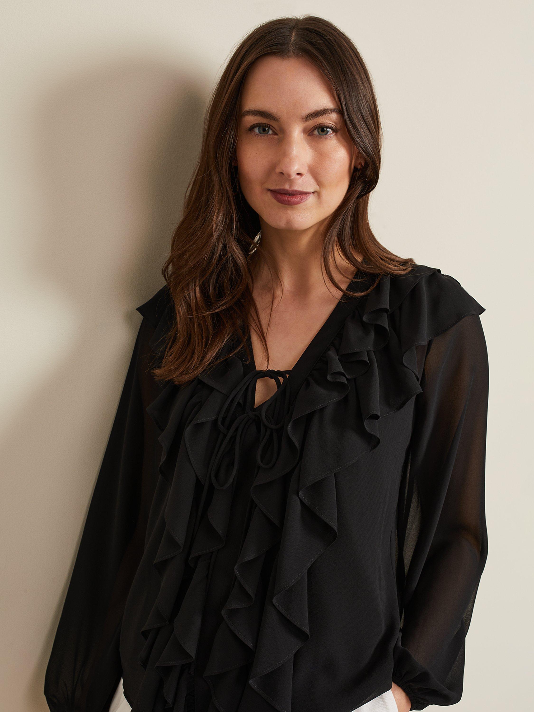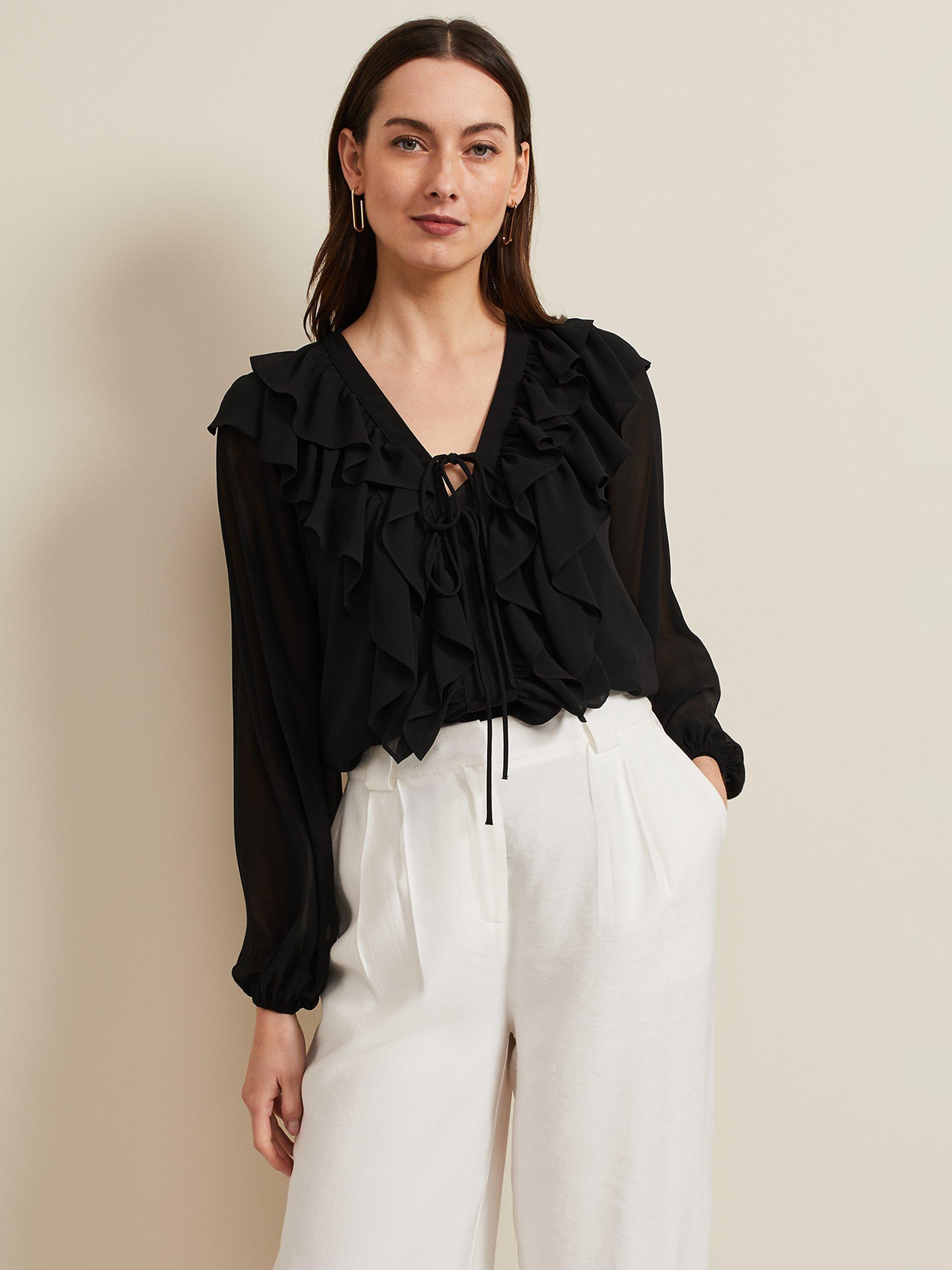 A contemporary blouse for your weekend wardrobe. Designed with a feminine V-neckline and tie detailing it's decorated with ruffles around the neckline and down the bodice. Simply style with any of your separates this season.