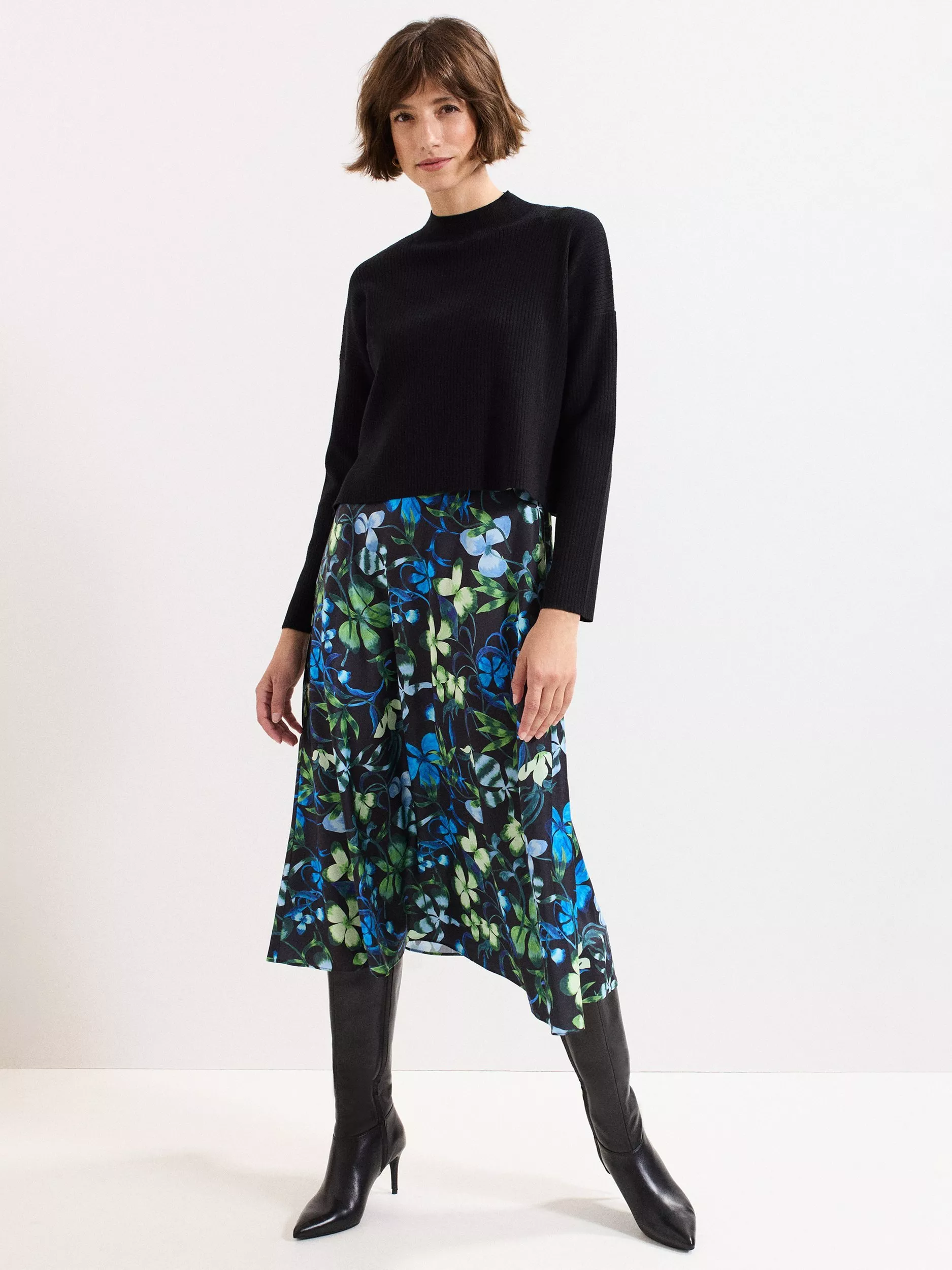 This versatile piece promises endless outfit opportunities. This midi dress features a layered top and a contrasting floral satin skirt for a contemporary update. Wear with the jumper or on its own paired with your favourite boots for a sophisticated, feminine style.