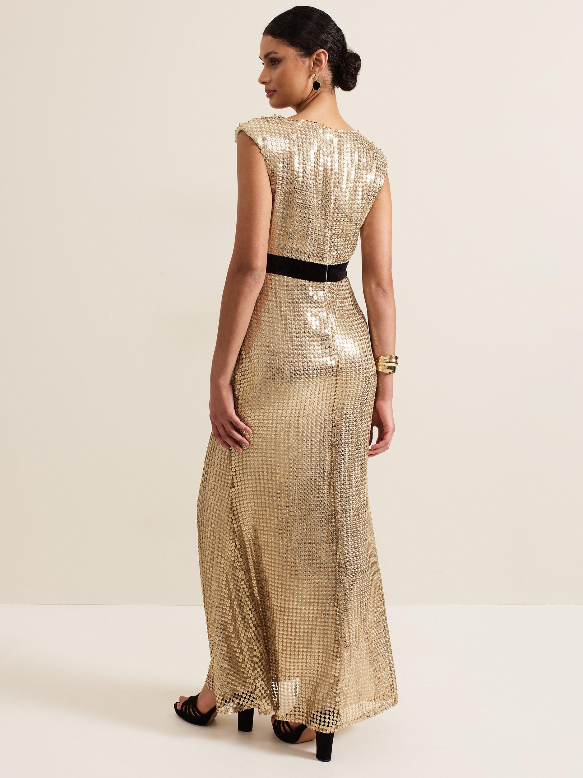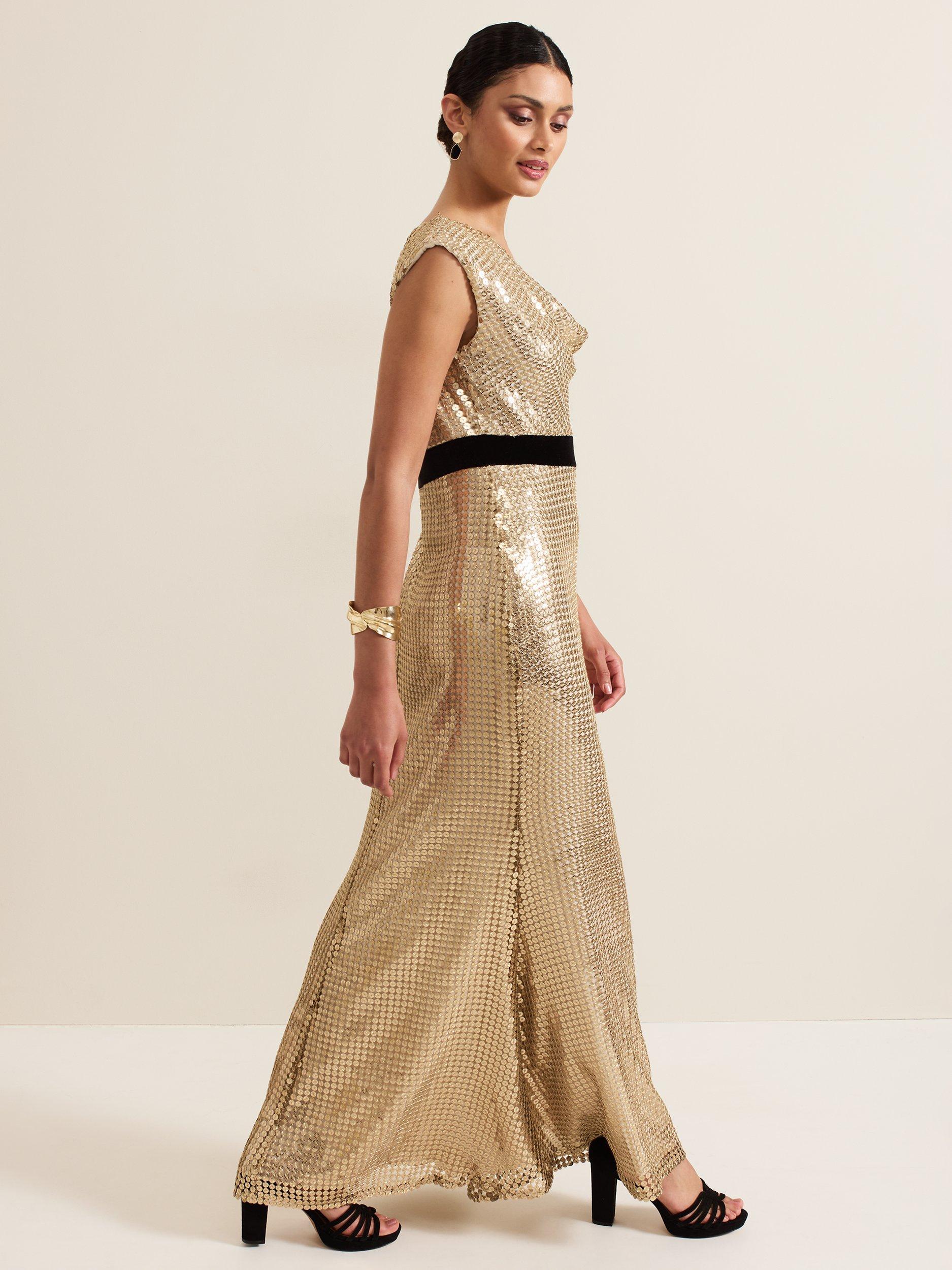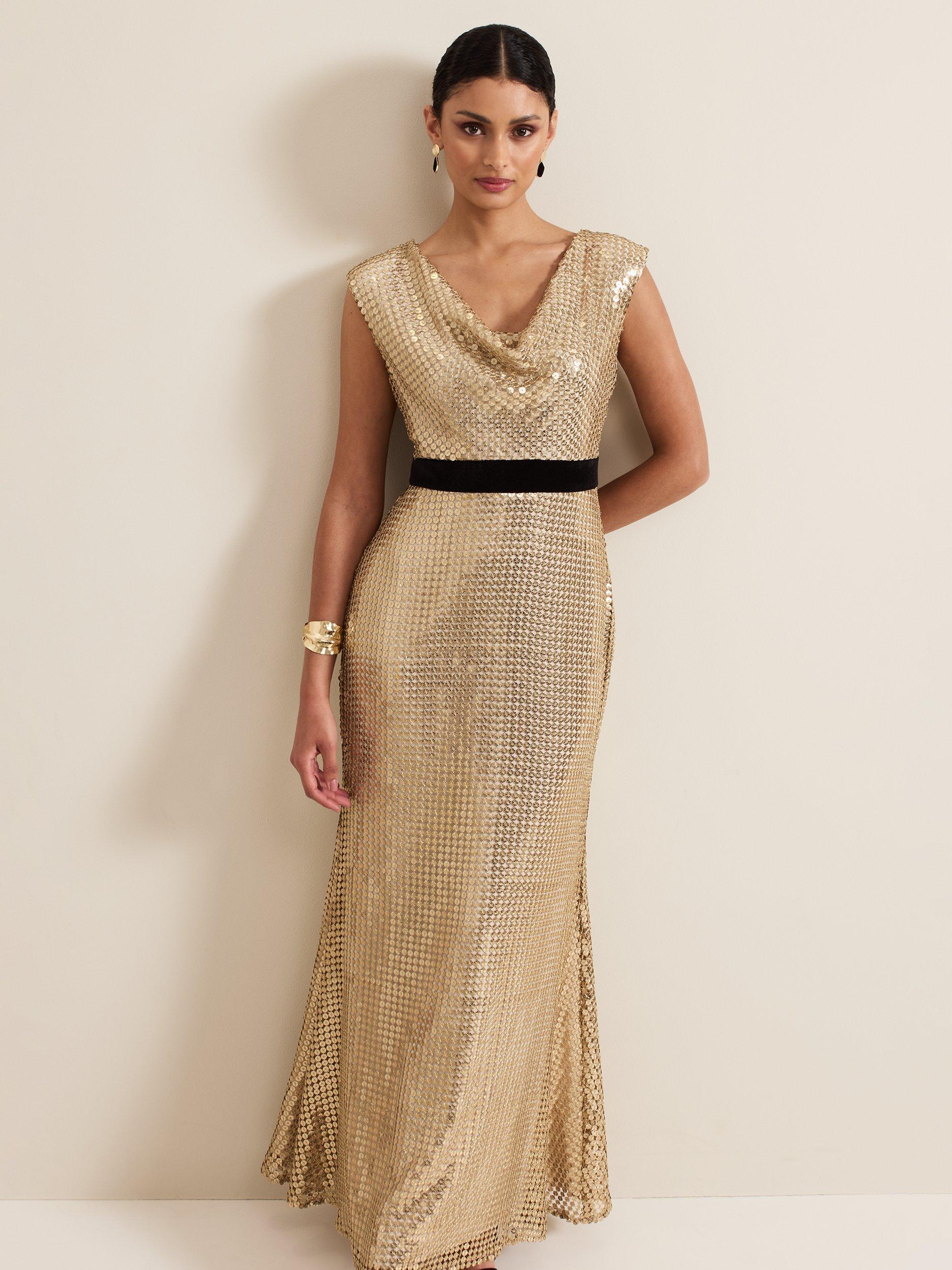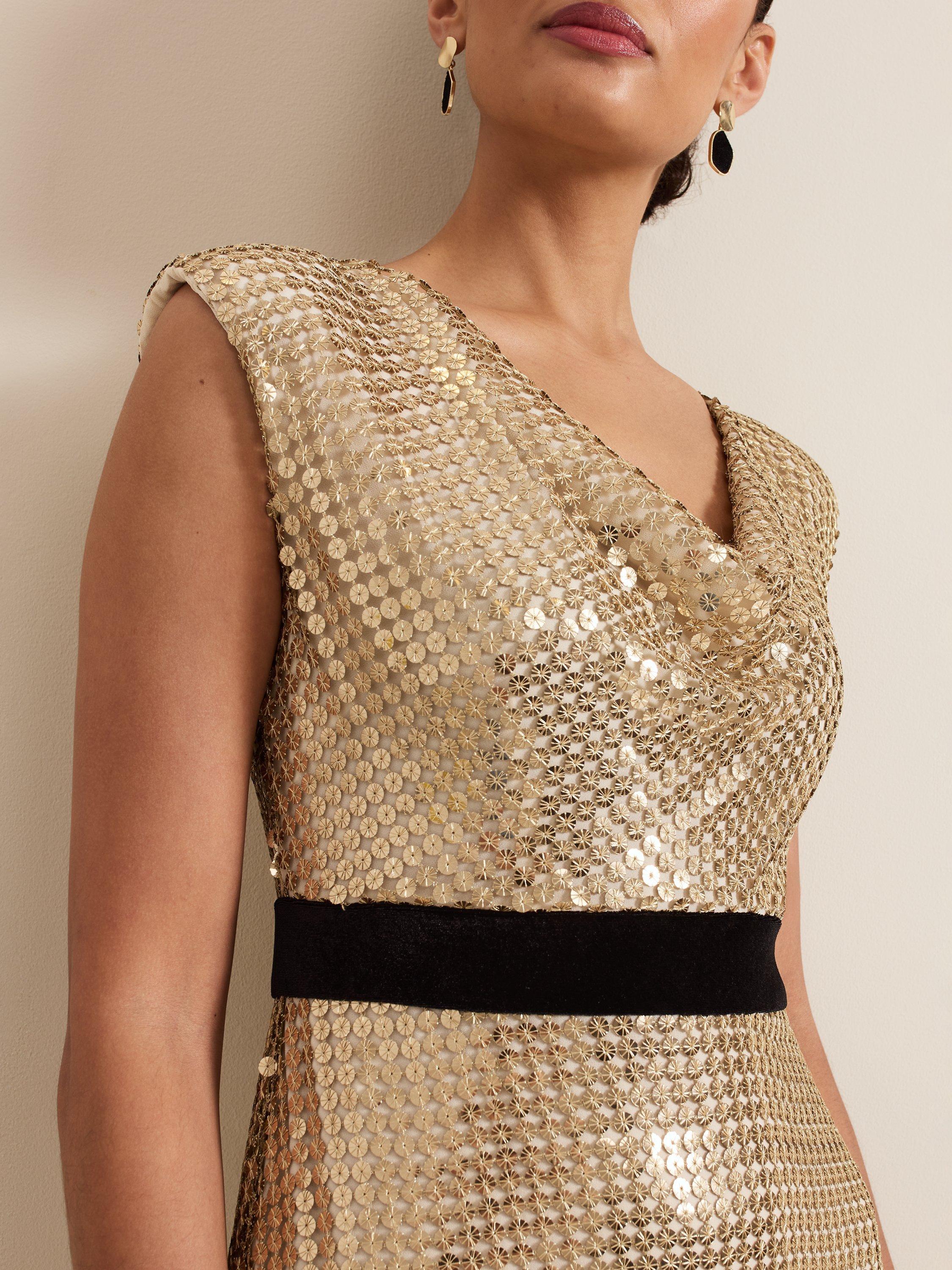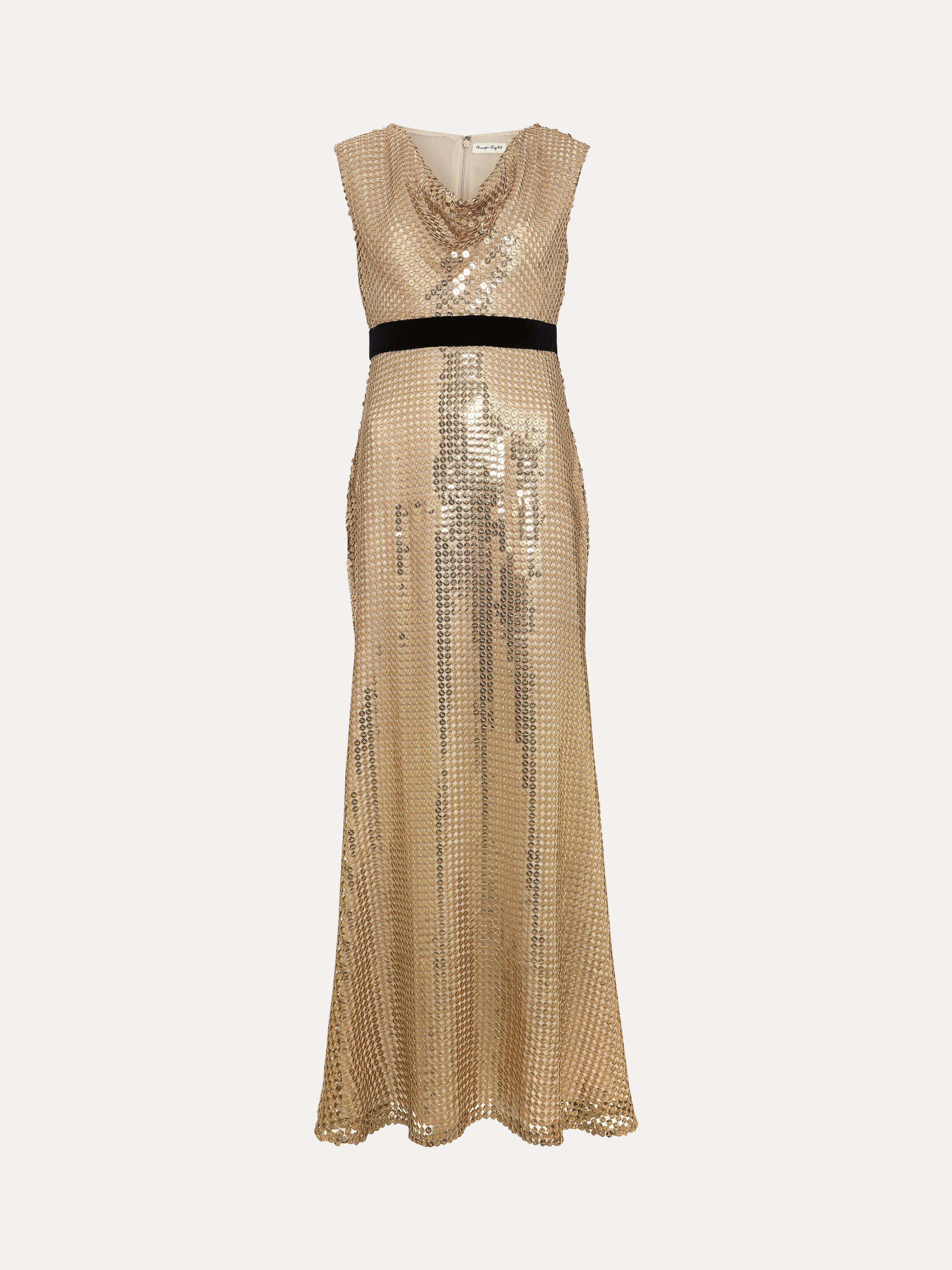 Come alive in motion in the Jamae dress. Fully covered in sequins that catch the light beautifully this dress features a feminine cowl neckline, a velvet waistband to highlight your figure and is cut to a sleeveless maxi silhouette. Pair with your favourite black heels and clutch for a statement event style.