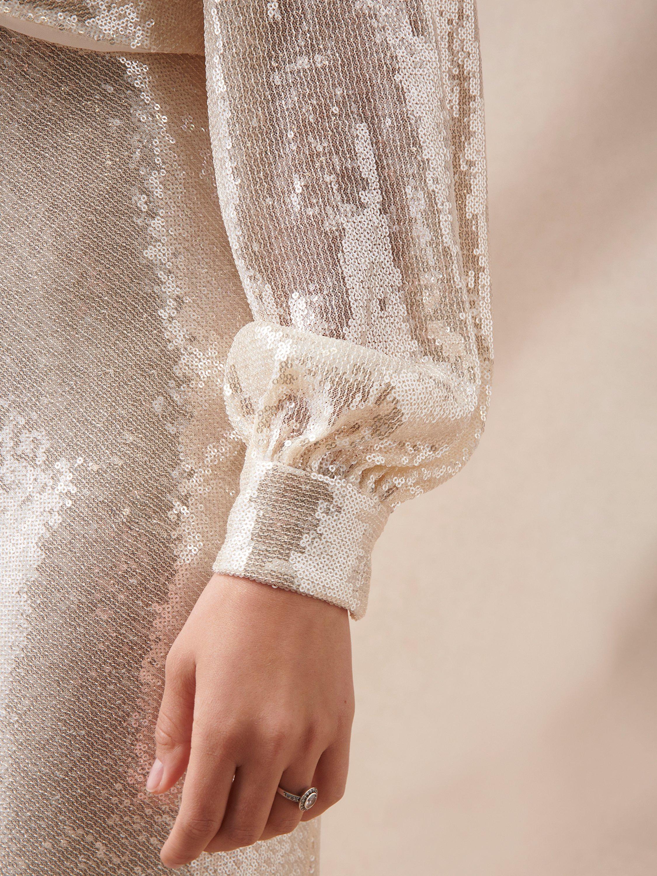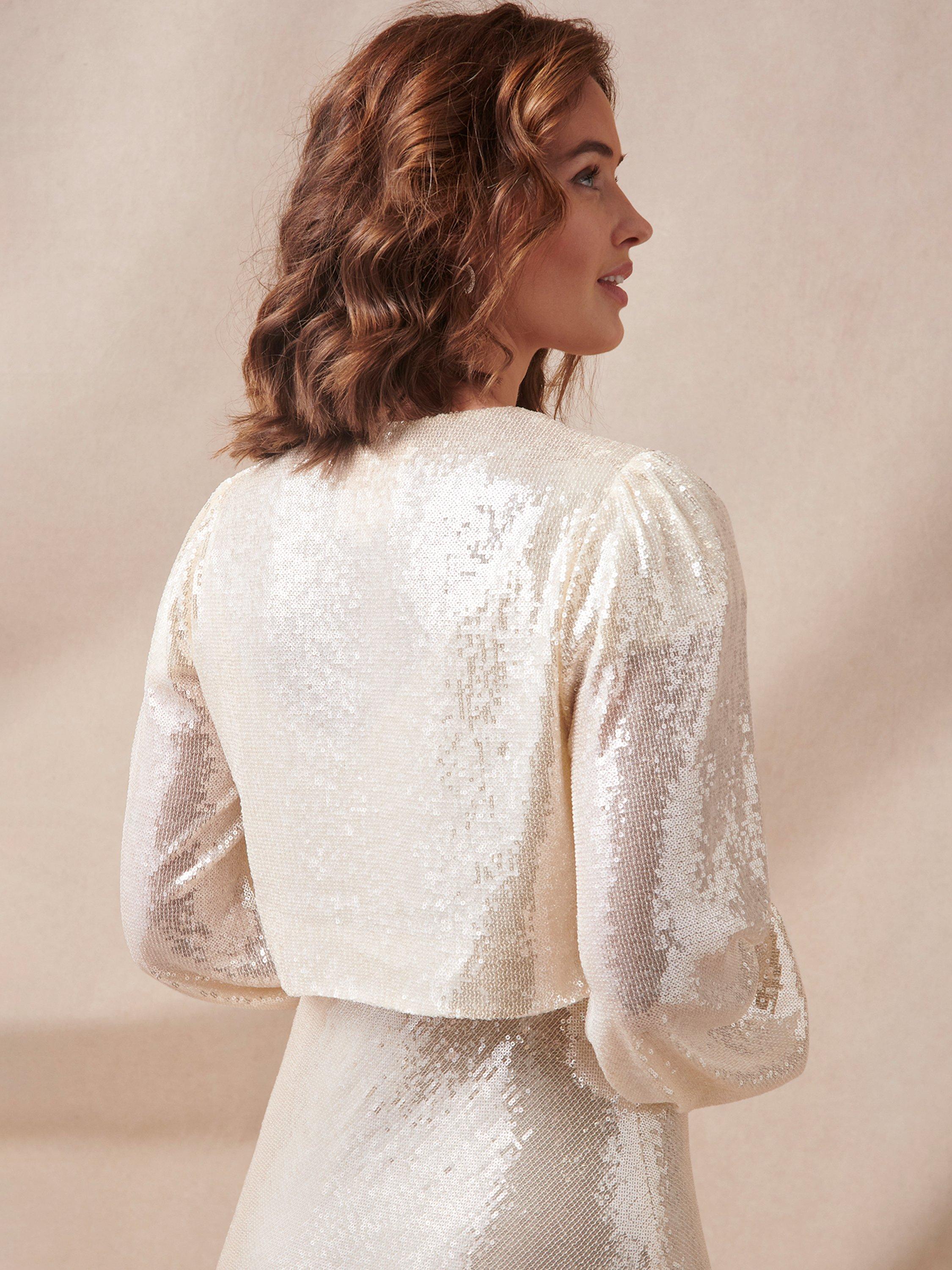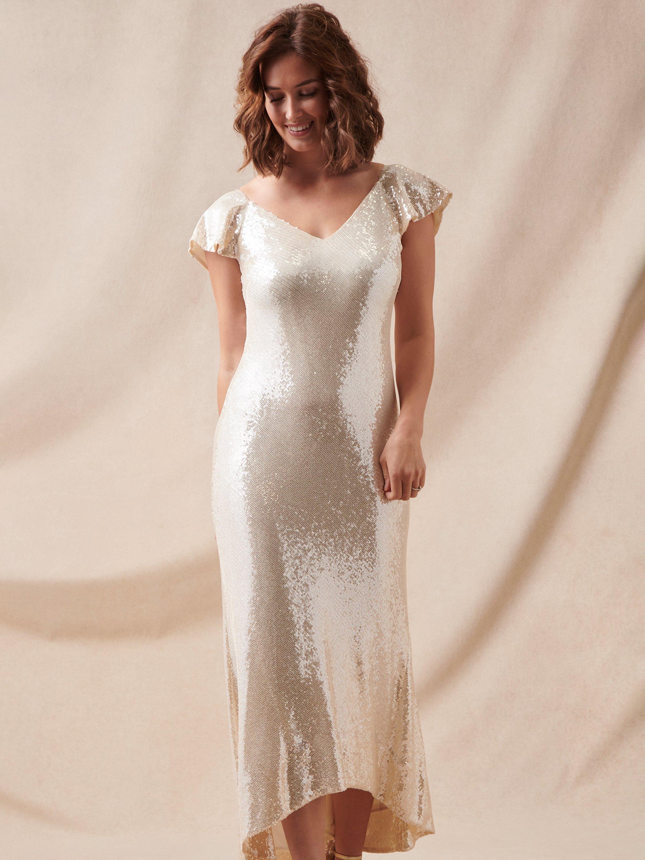Phase Eight's statement sequin bridal style is perfect for the big day or for the post-altar party. Designed with all-over shimmering sequins, the Jamila dress features an overlay bodice that completely transforms this style: wear the overlay for a full blouson sleeve twisted front look or remove to reveal a feminine V-neckline with softly fluted short sleeves. Style with equally fabulous heels.