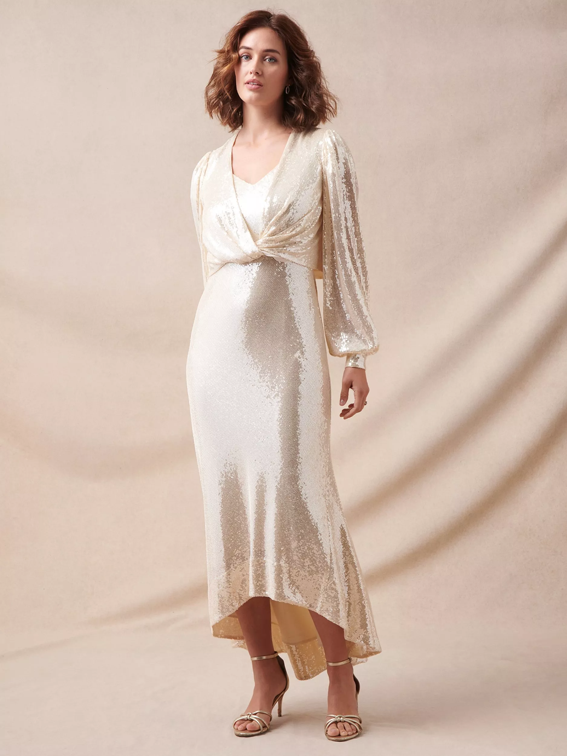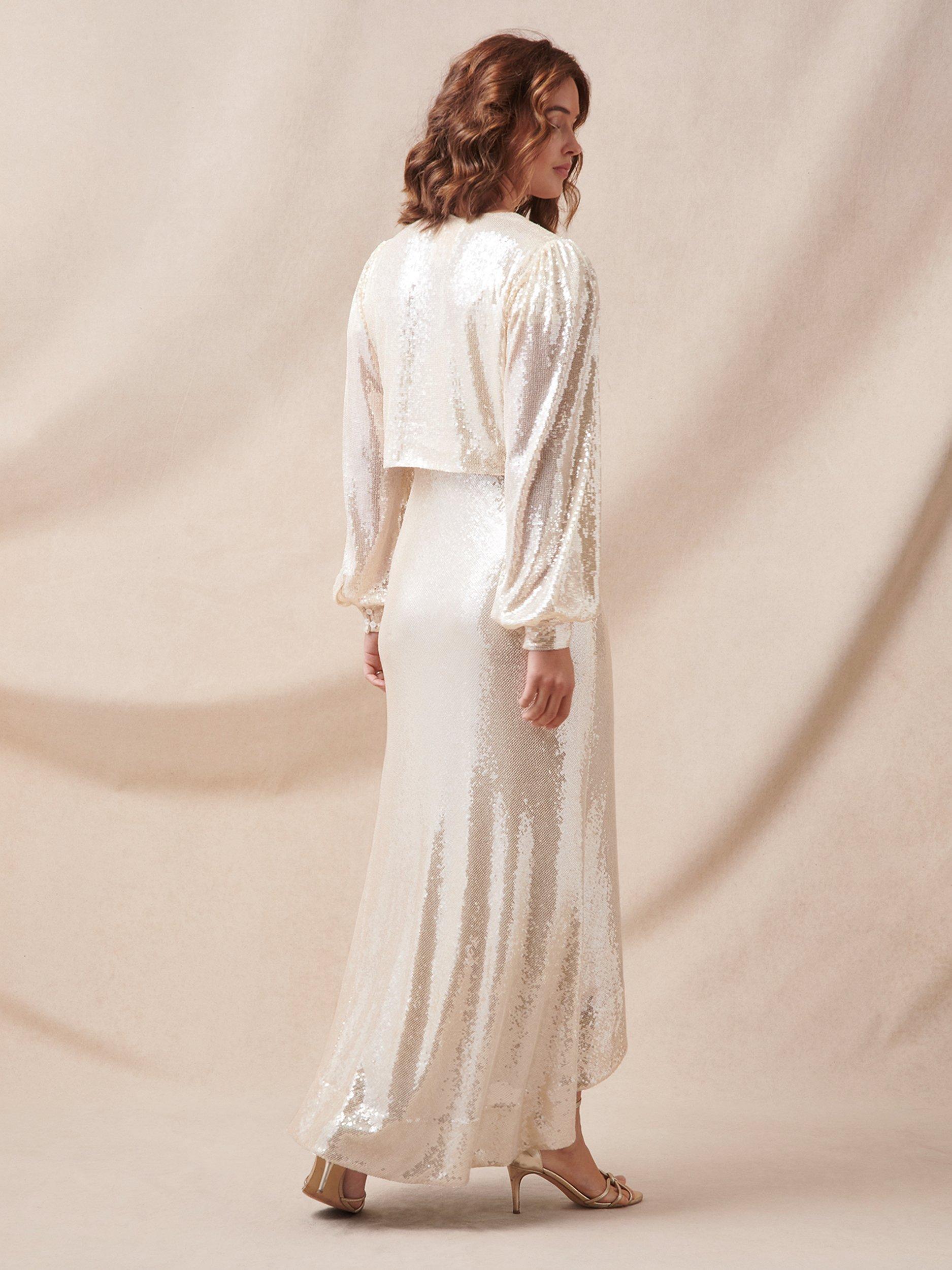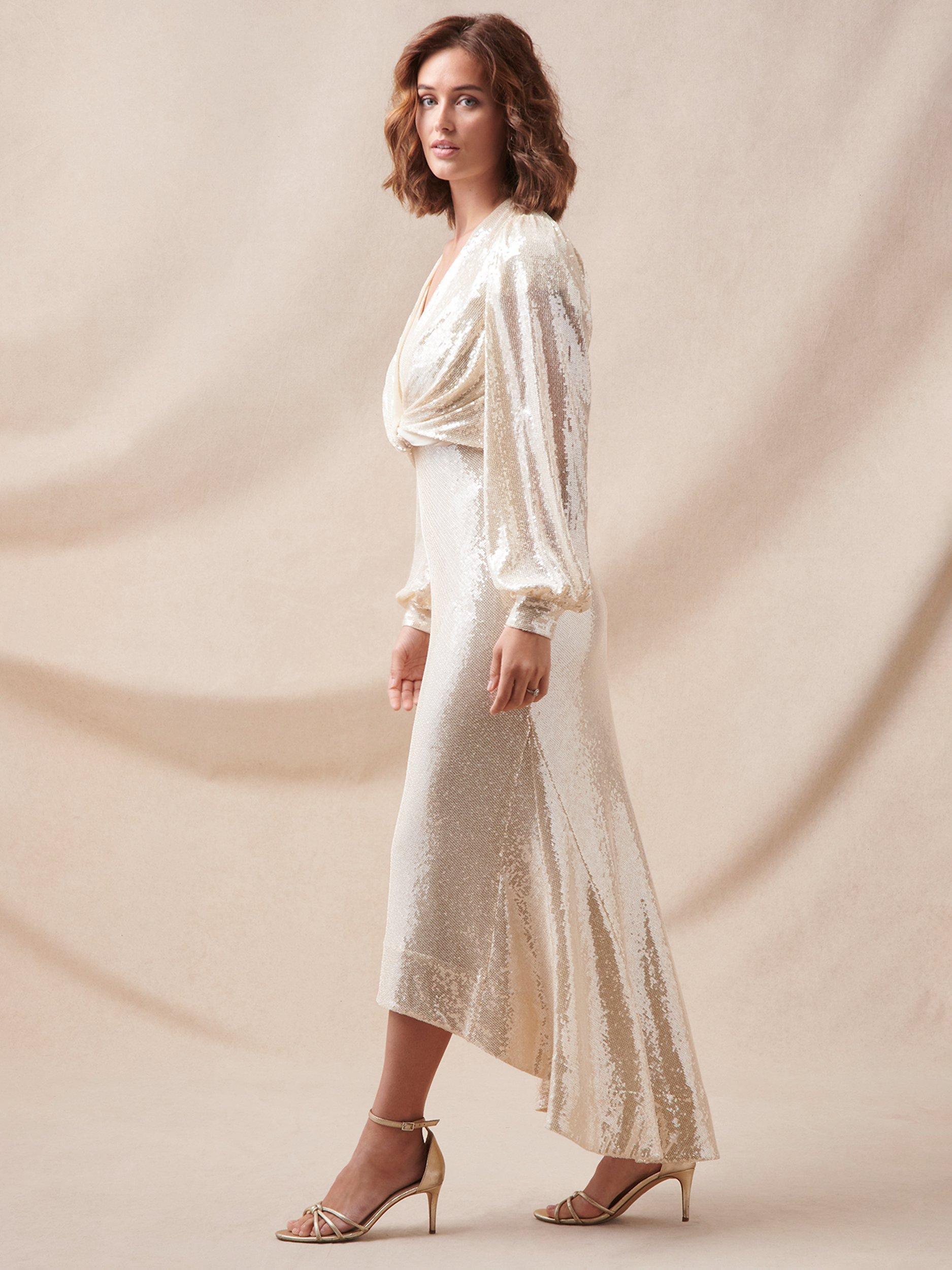Phase Eight's statement sequin bridal style is perfect for the big day or for the post-altar party. Designed with all-over shimmering sequins, the Jamila dress features an overlay bodice that completely transforms this style: wear the overlay for a full blouson sleeve twisted front look or remove to reveal a feminine V-neckline with softly fluted short sleeves. Style with equally fabulous heels.