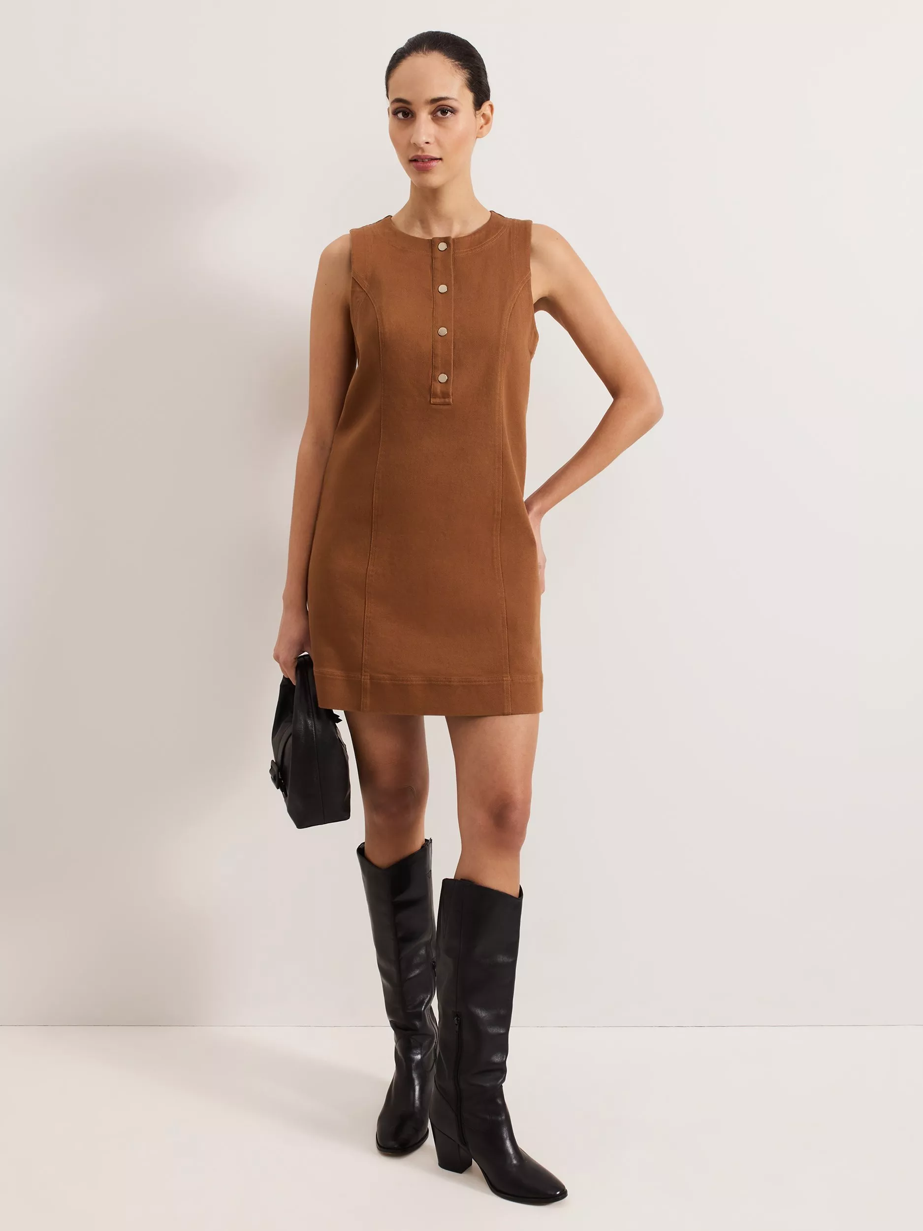 Meet our contemporary update on the denim dress. In a shade that will work any time of year, this dress features exposed seam detailing that creates a streamlined silhouette, falling to a mini length above the knee. Finished with button detailing for a modern edge we love to style ours with a pair of boots for a polished day or night look.