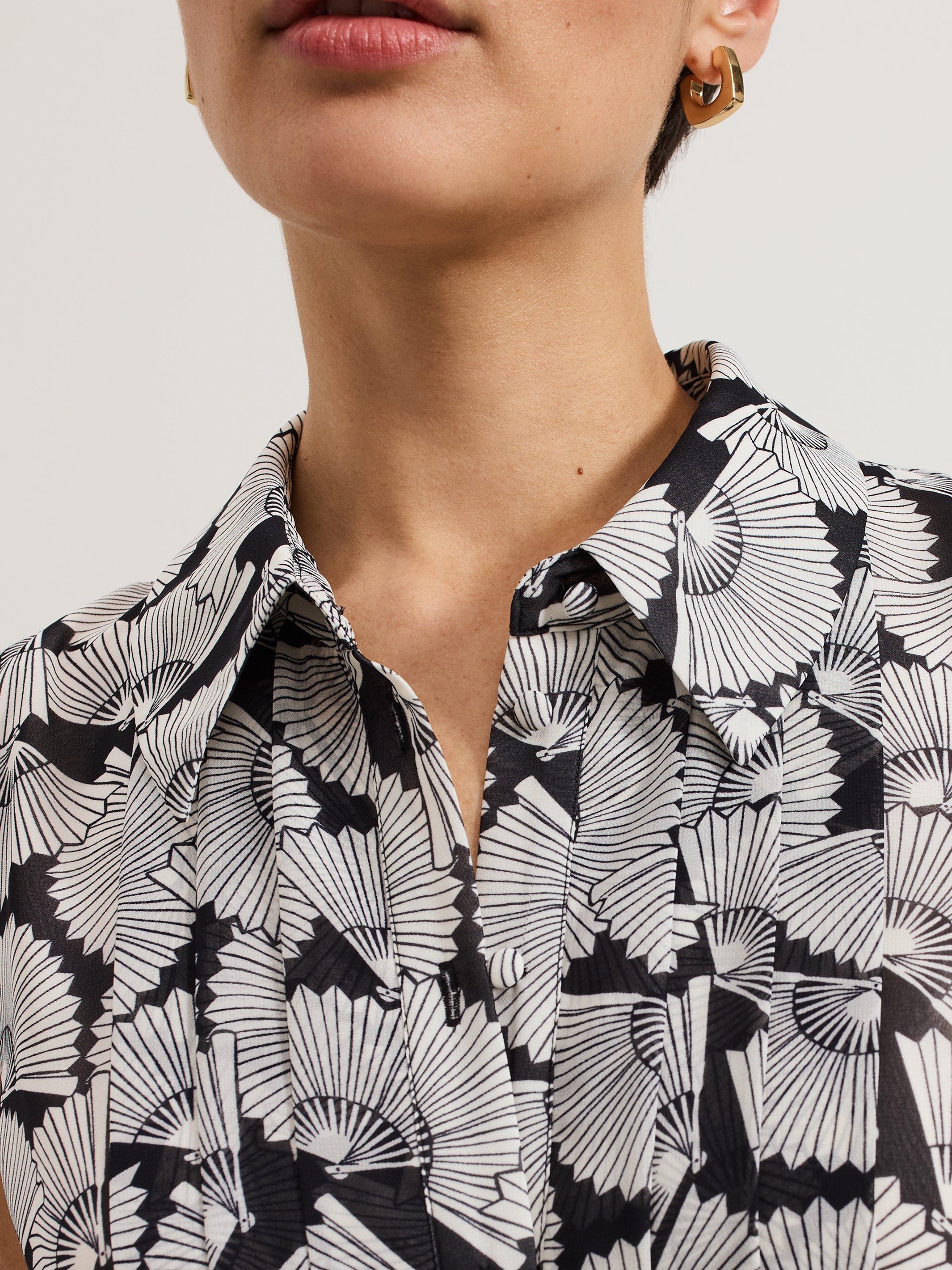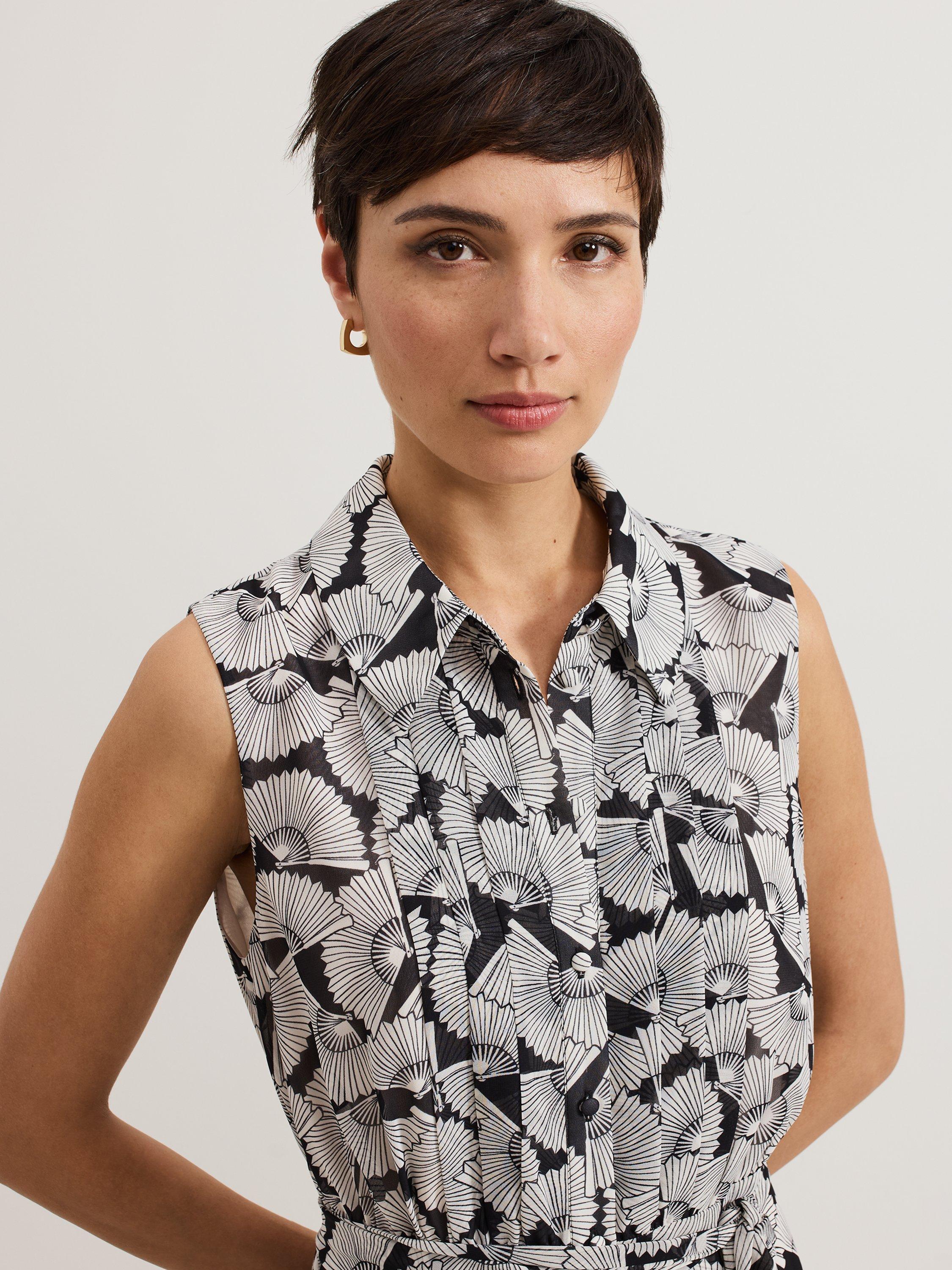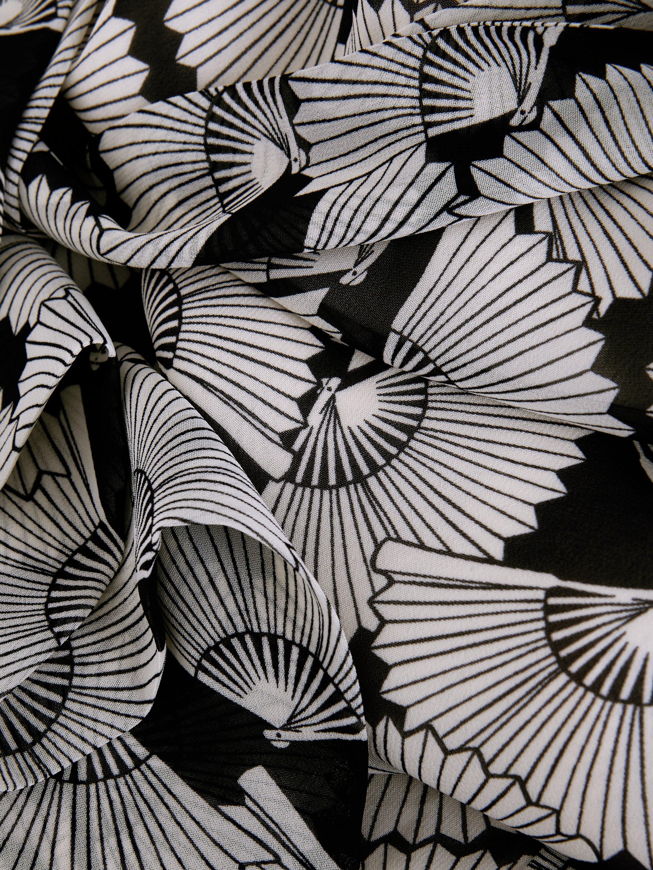 With an two-tone fan print repeated all-over, this piece is complete with a self-tie belt at the waist.