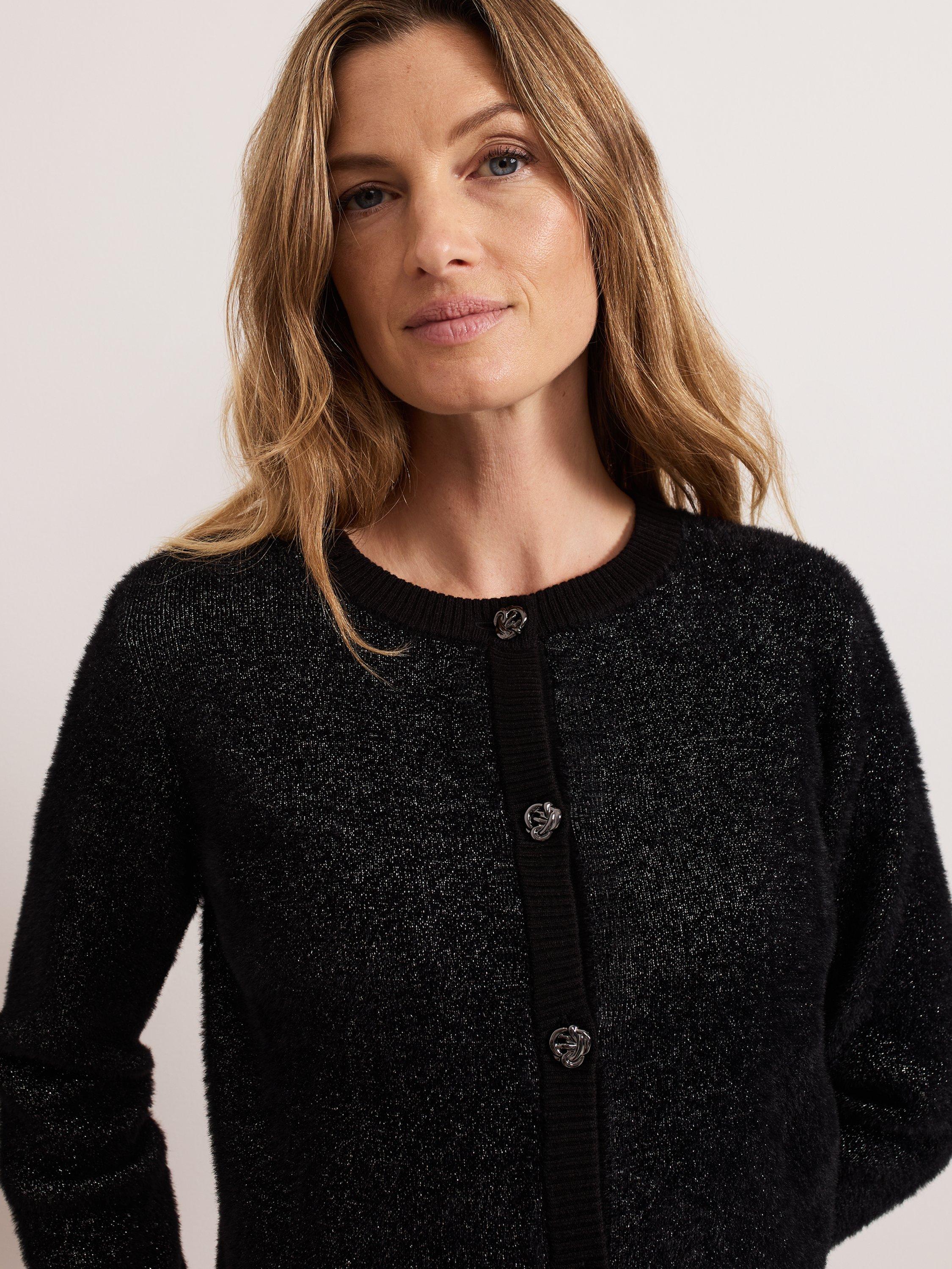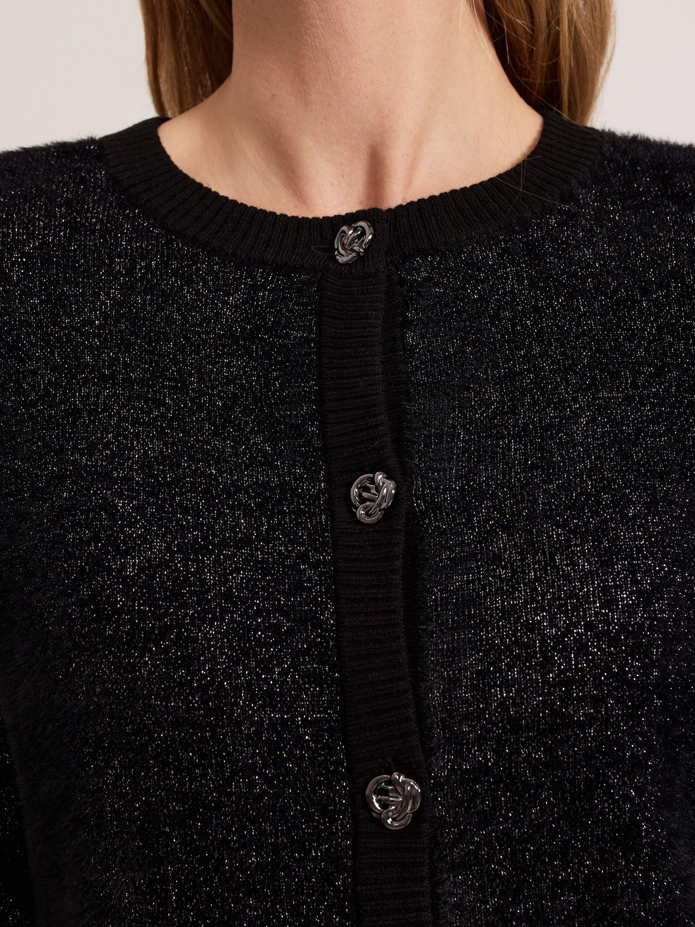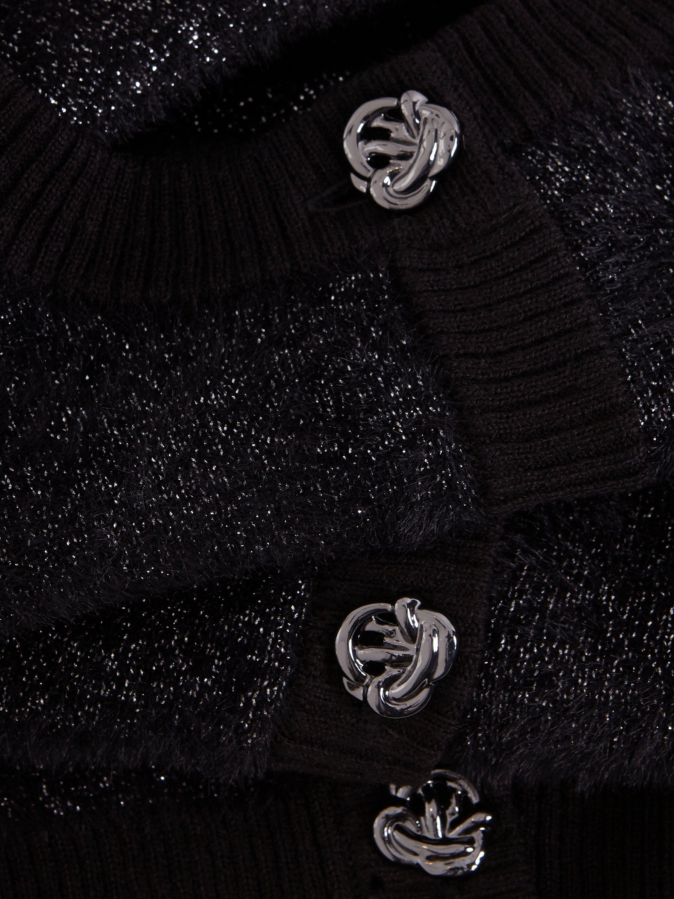 This is the perfect final layer to add some extra sparkle to all your favourite outfits. Designed in black with metallic thread detailing, this cardigan is crafted from a soft fluffy material, with ribbed detailing and embellished gunmetal grey buttons, it's sure to become a winter wardrobe staple.