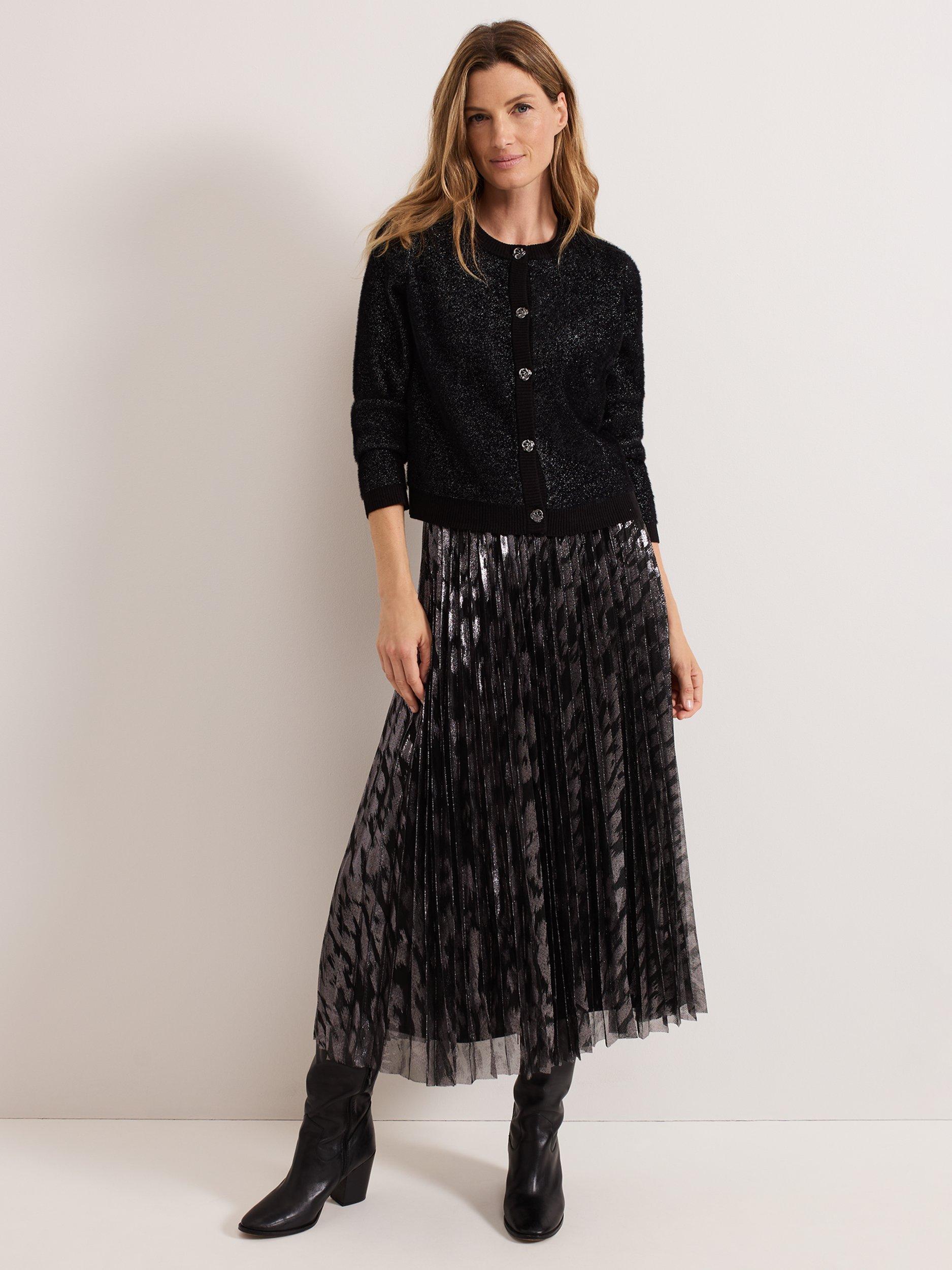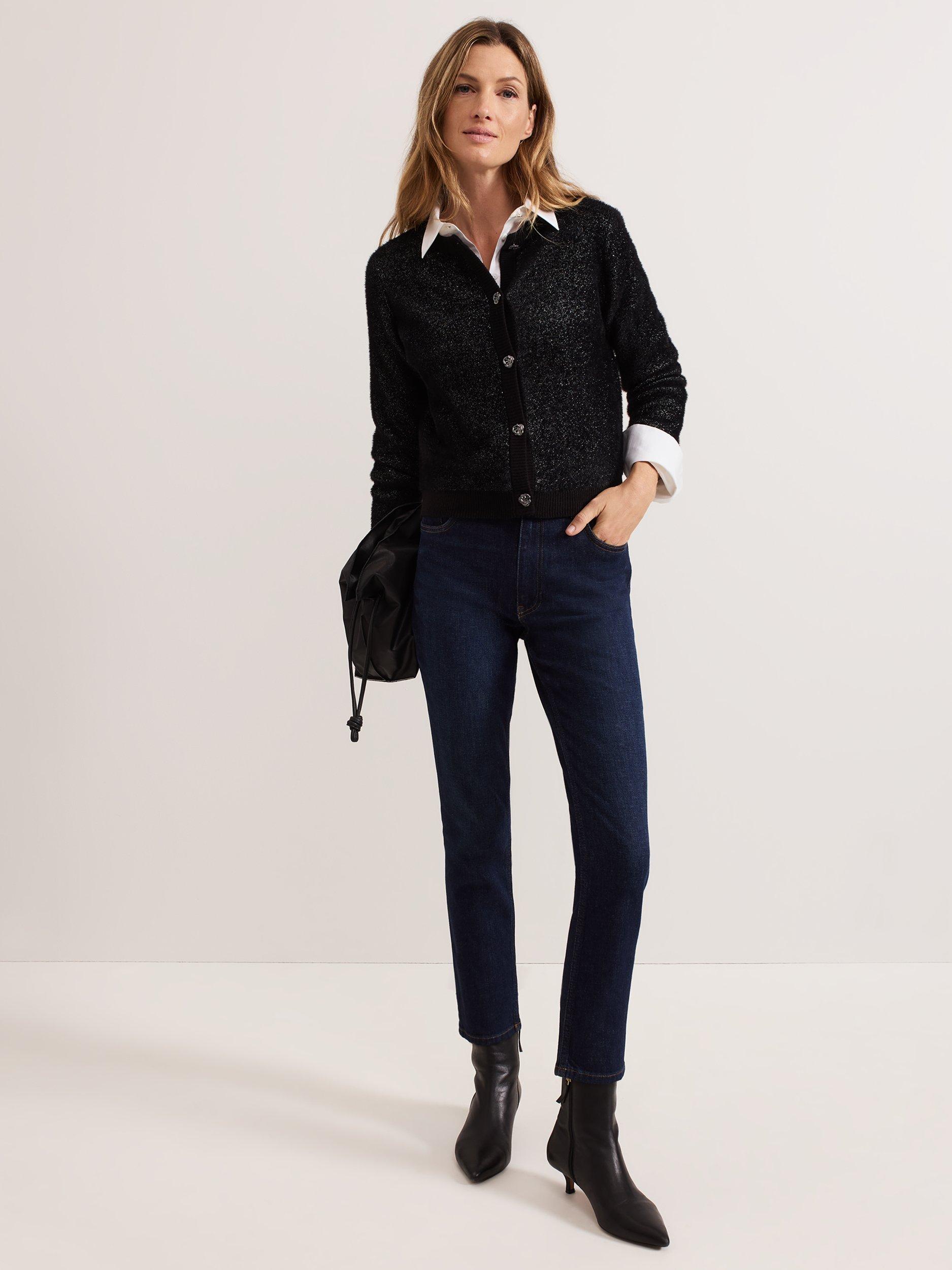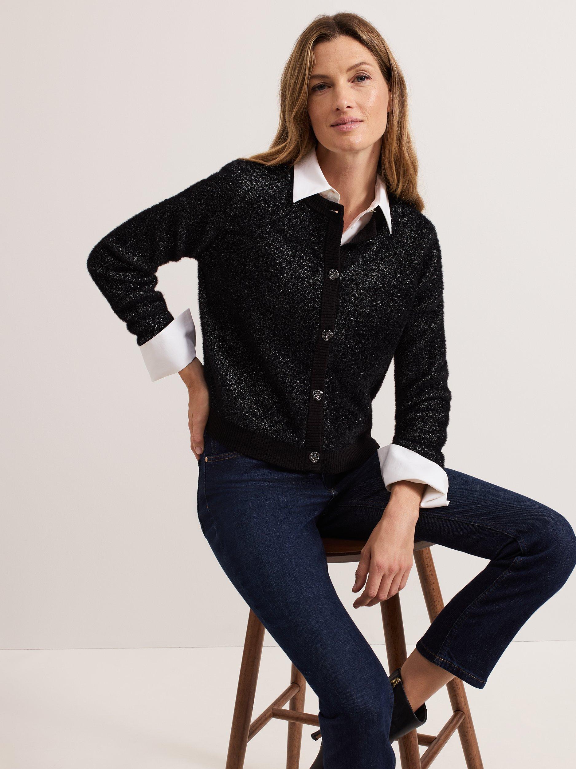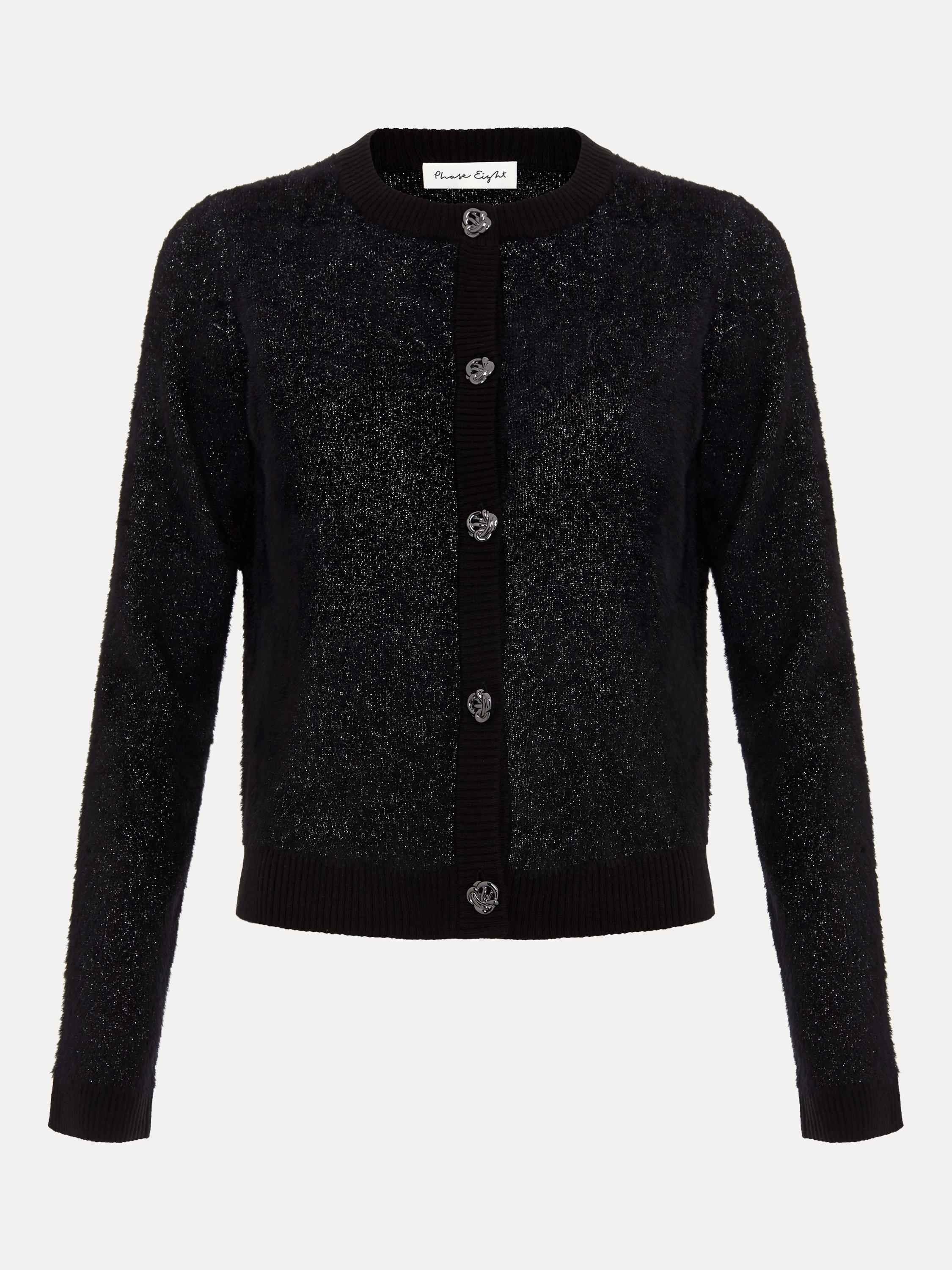 This is the perfect final layer to add some extra sparkle to all your favourite outfits. Designed in black with metallic thread detailing, this cardigan is crafted from a soft fluffy material, with ribbed detailing and embellished gunmetal grey buttons, it's sure to become a winter wardrobe staple.