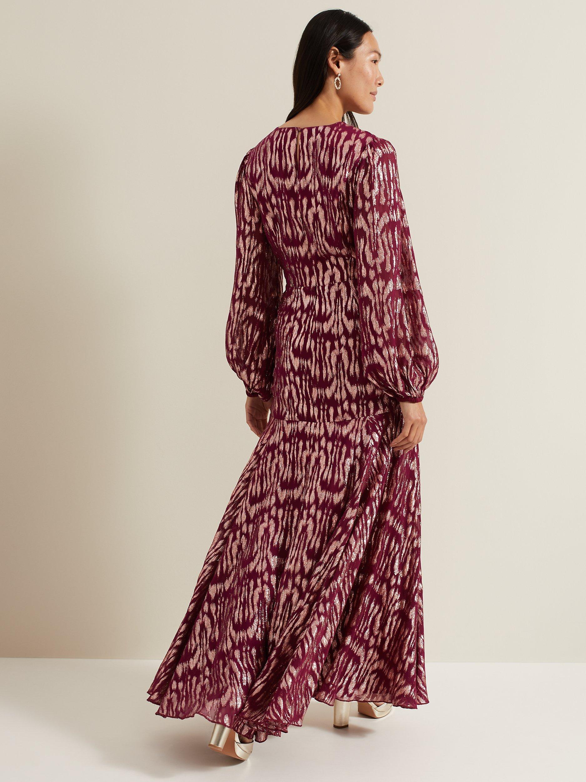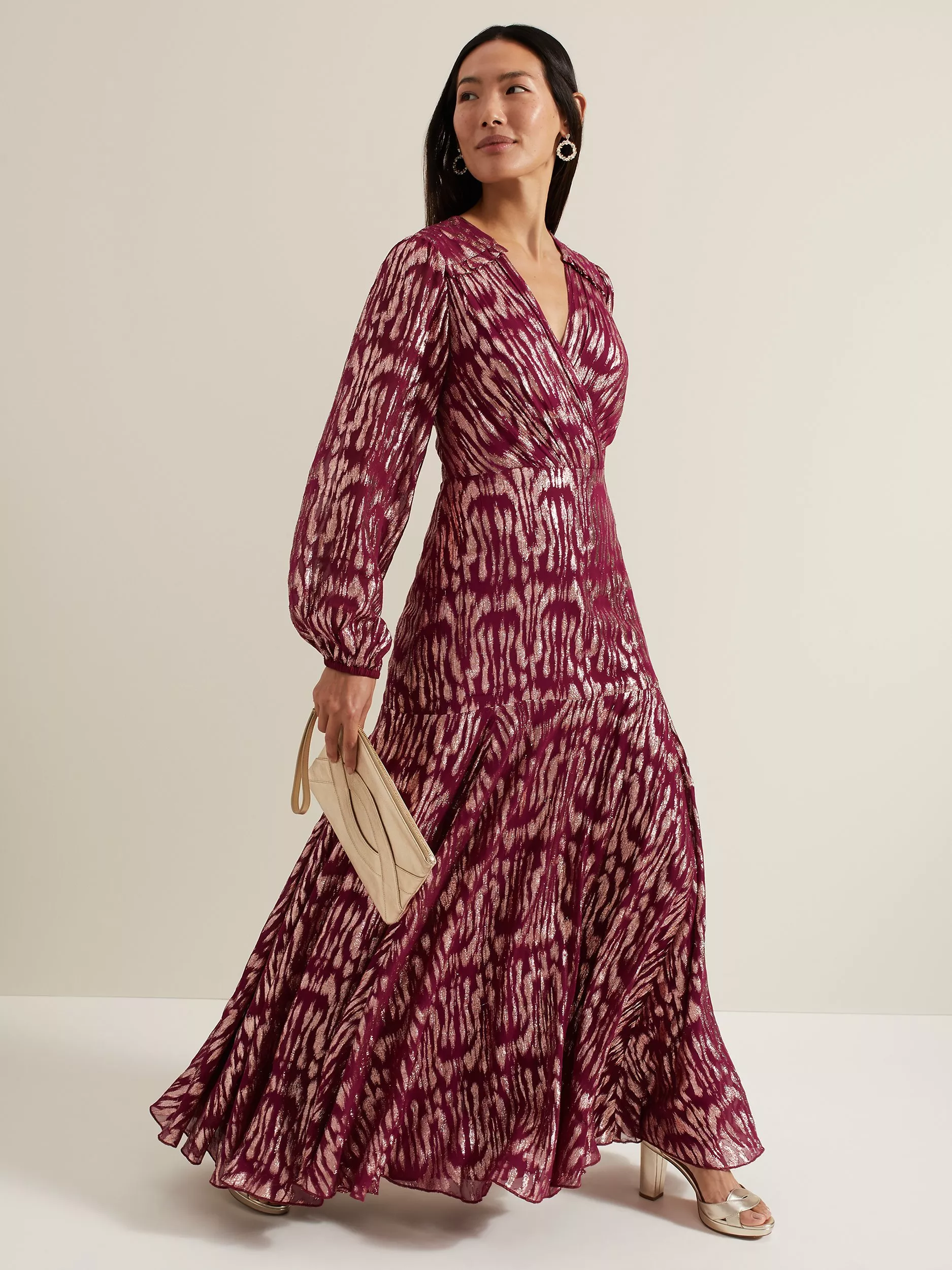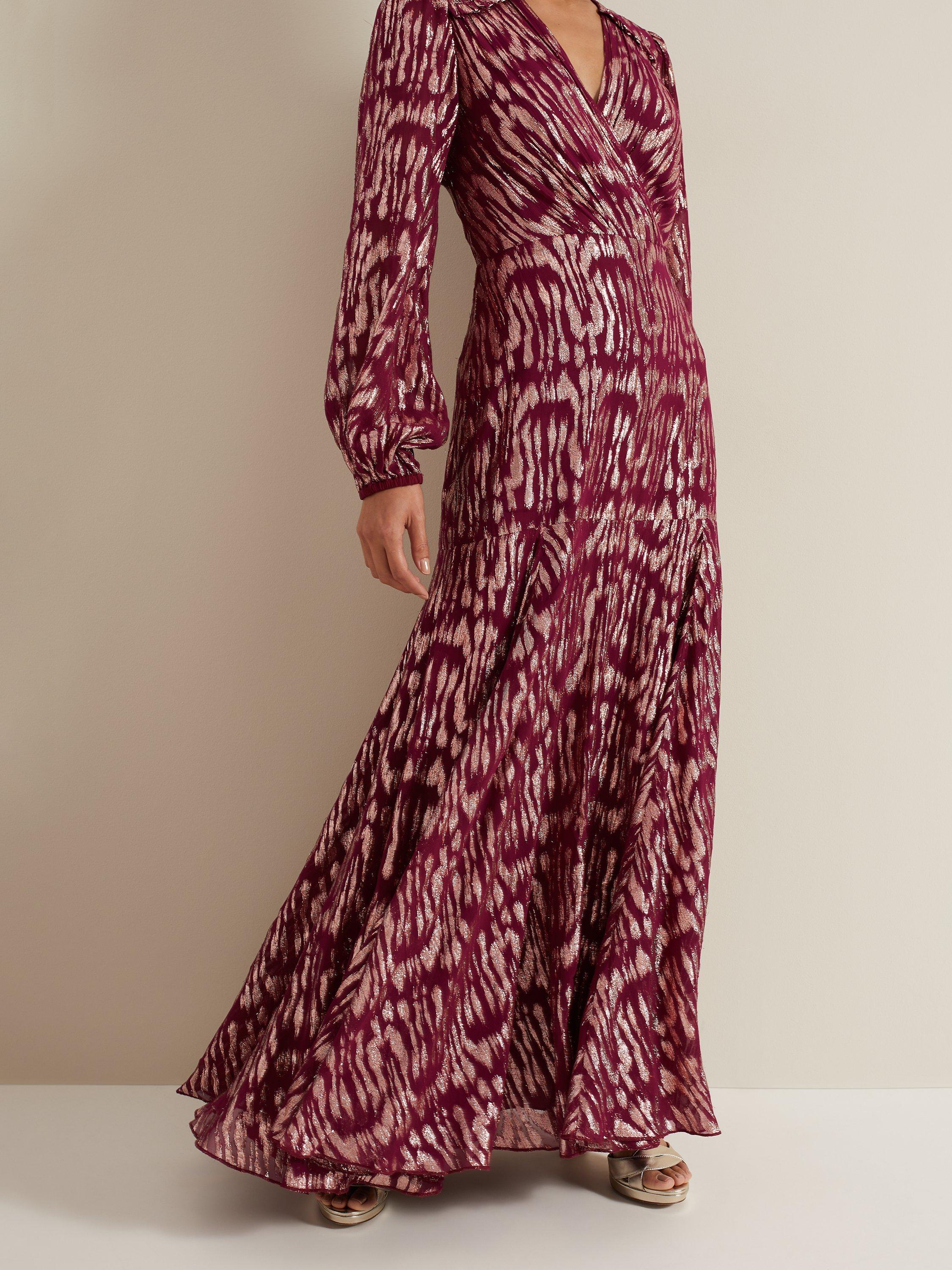 Effortlessly flattering thanks to the fit and flare cut, this maxi dress from Phase Eight is made from a whisper-weight viscose blend. With a flattering wrap neckline and full-length sleeves, this style is dipped in a striking metallic geometric pattern.