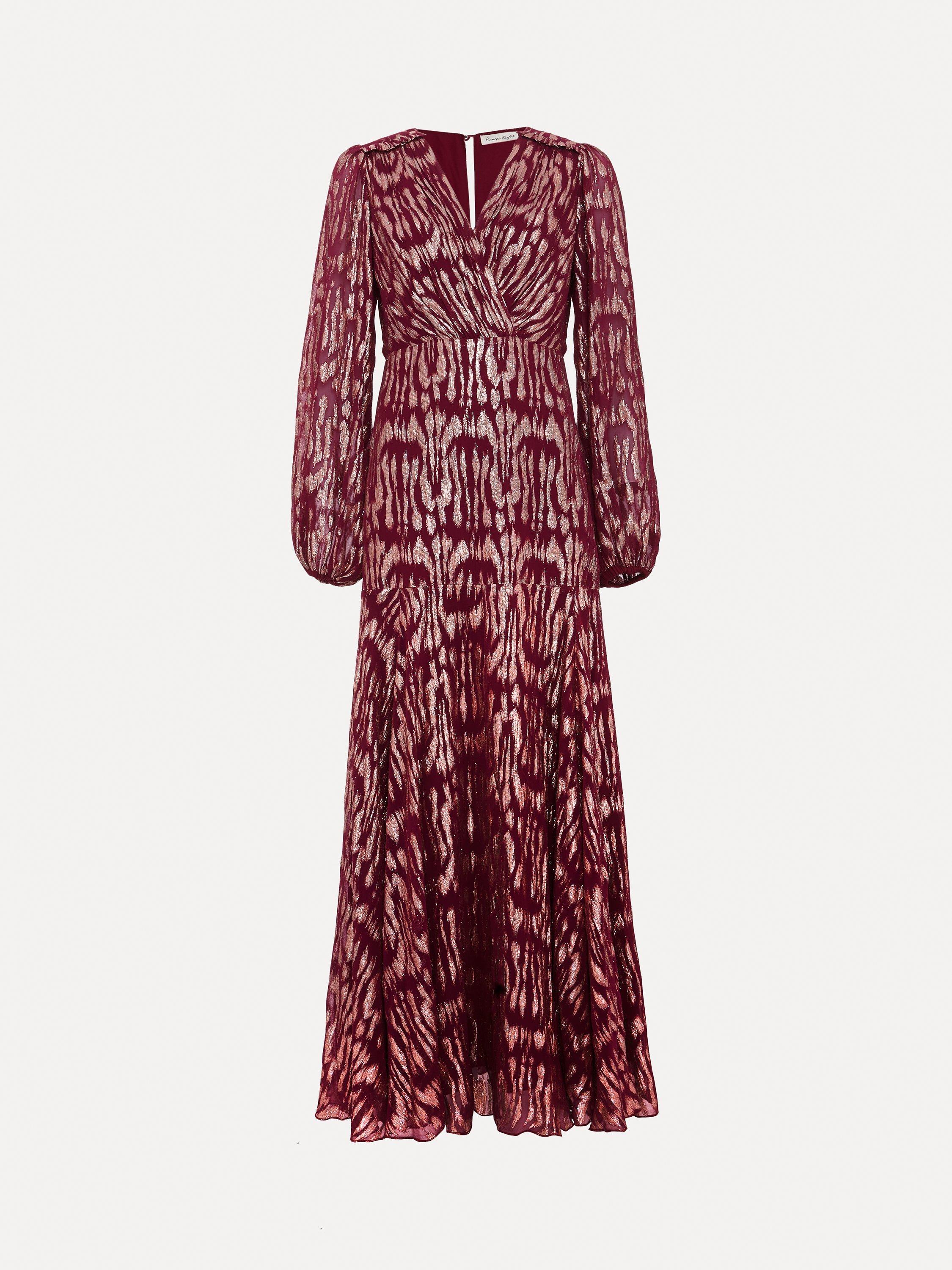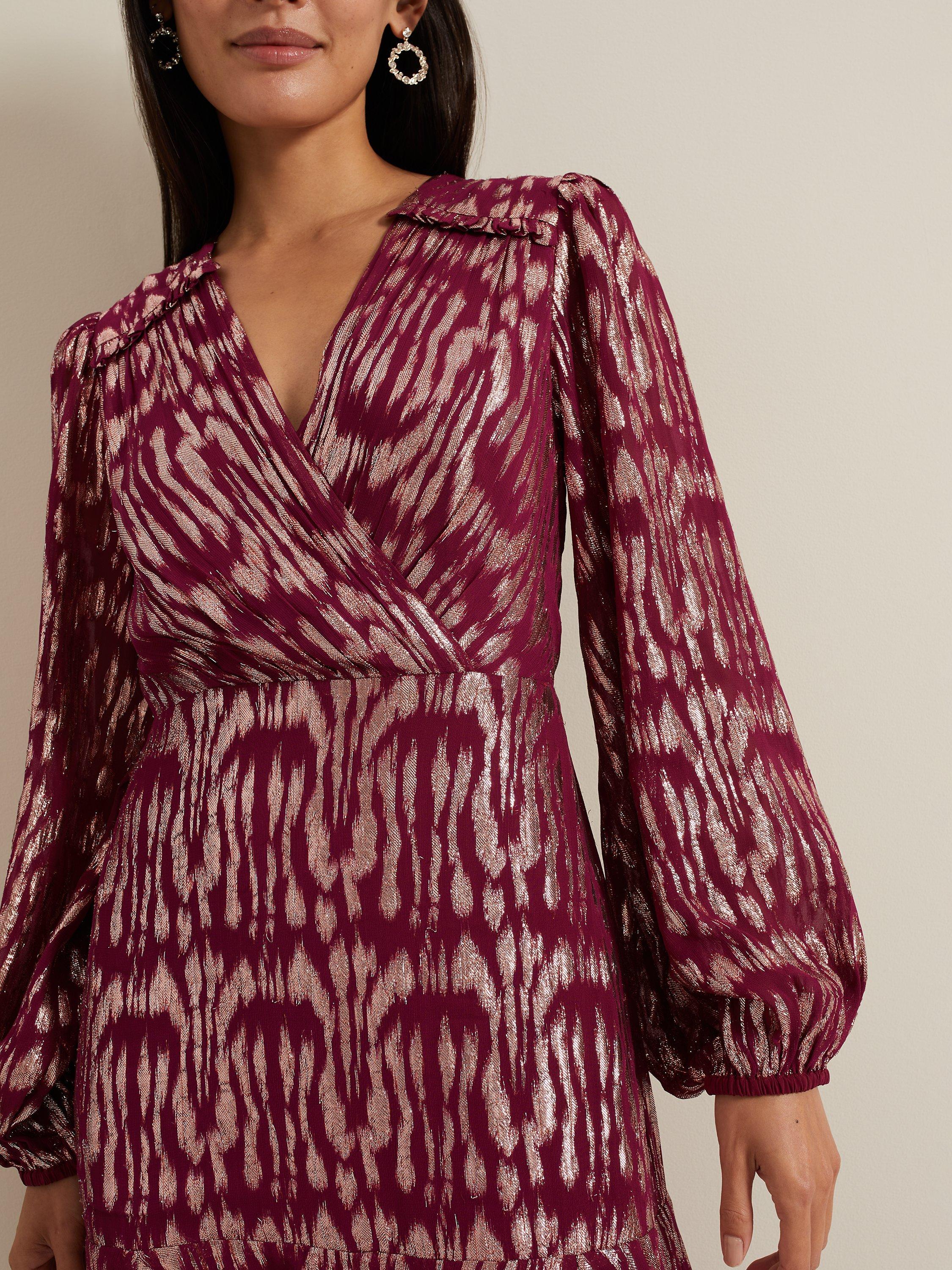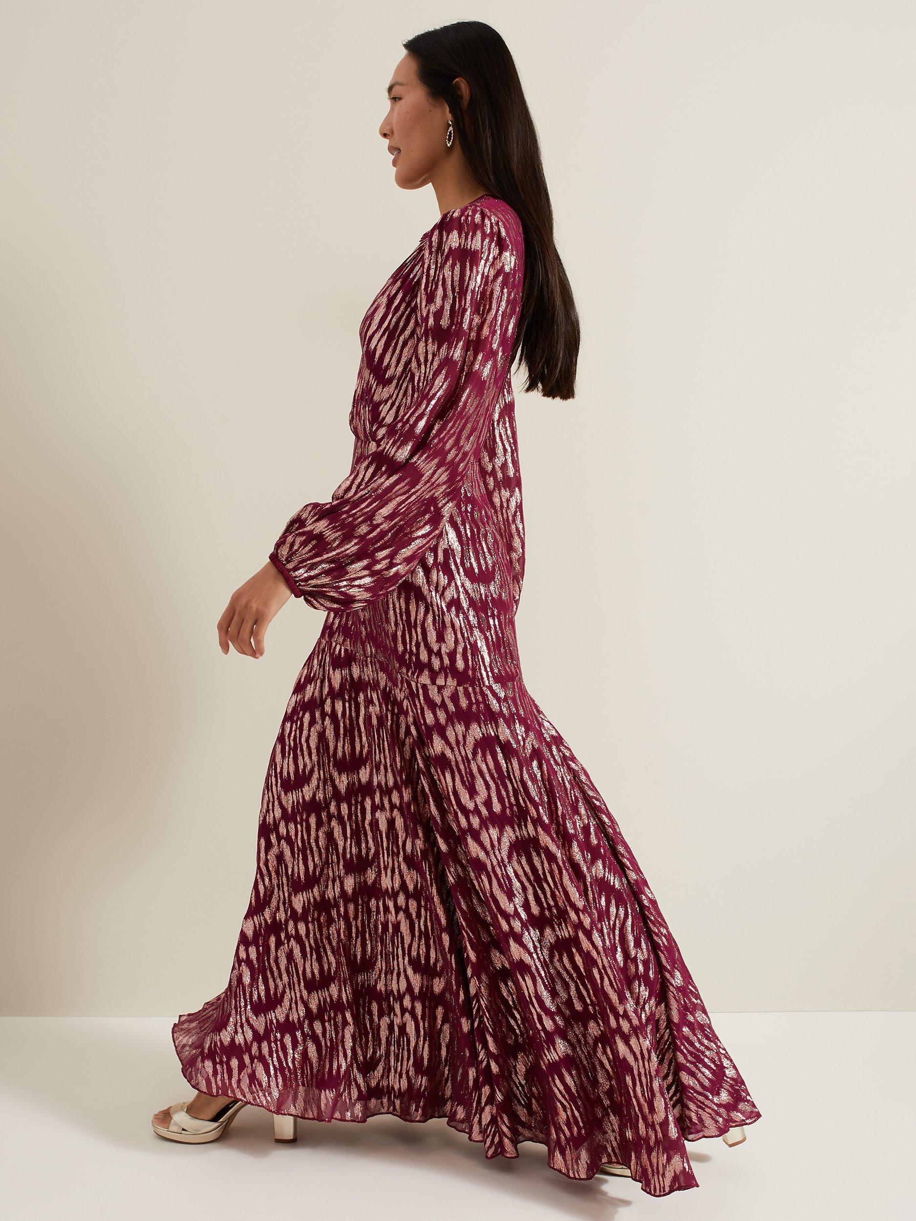 Effortlessly flattering thanks to the fit and flare cut, this maxi dress from Phase Eight is made from a whisper-weight viscose blend. With a flattering wrap neckline and full-length sleeves, this style is dipped in a striking metallic geometric pattern.