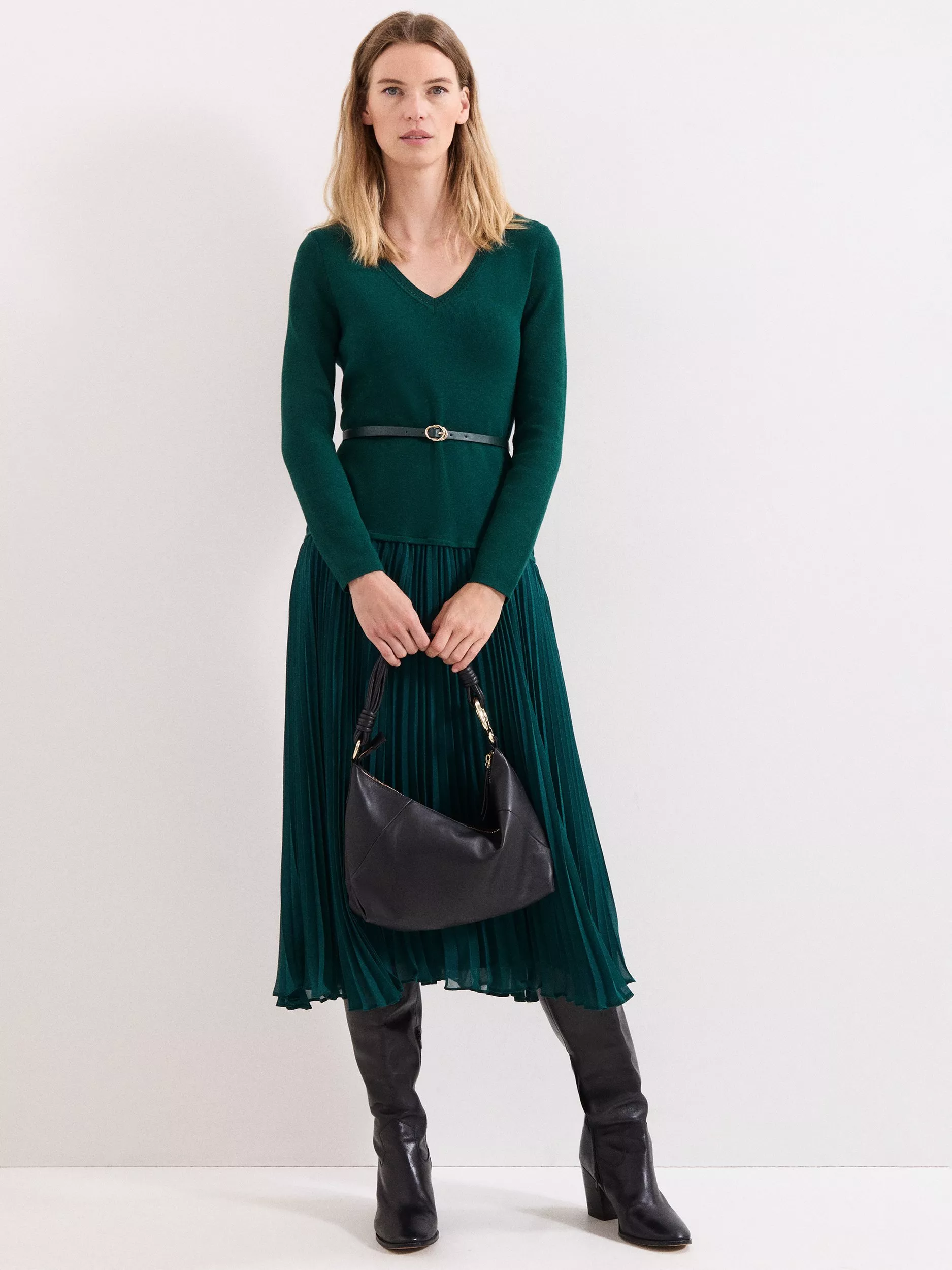A knitted midi dress with wear-all-day appeal. In a shade that’s perfect for transitioning into autumn, it features a knitted top, flowing to a fully pleated skirt that creates beautiful movement. The dropped waist creates an elegant silhouette, finished with a slim belt for subtle refinement. Paired with boots or heels, it’s a sophisticated work-to-weekend choice.