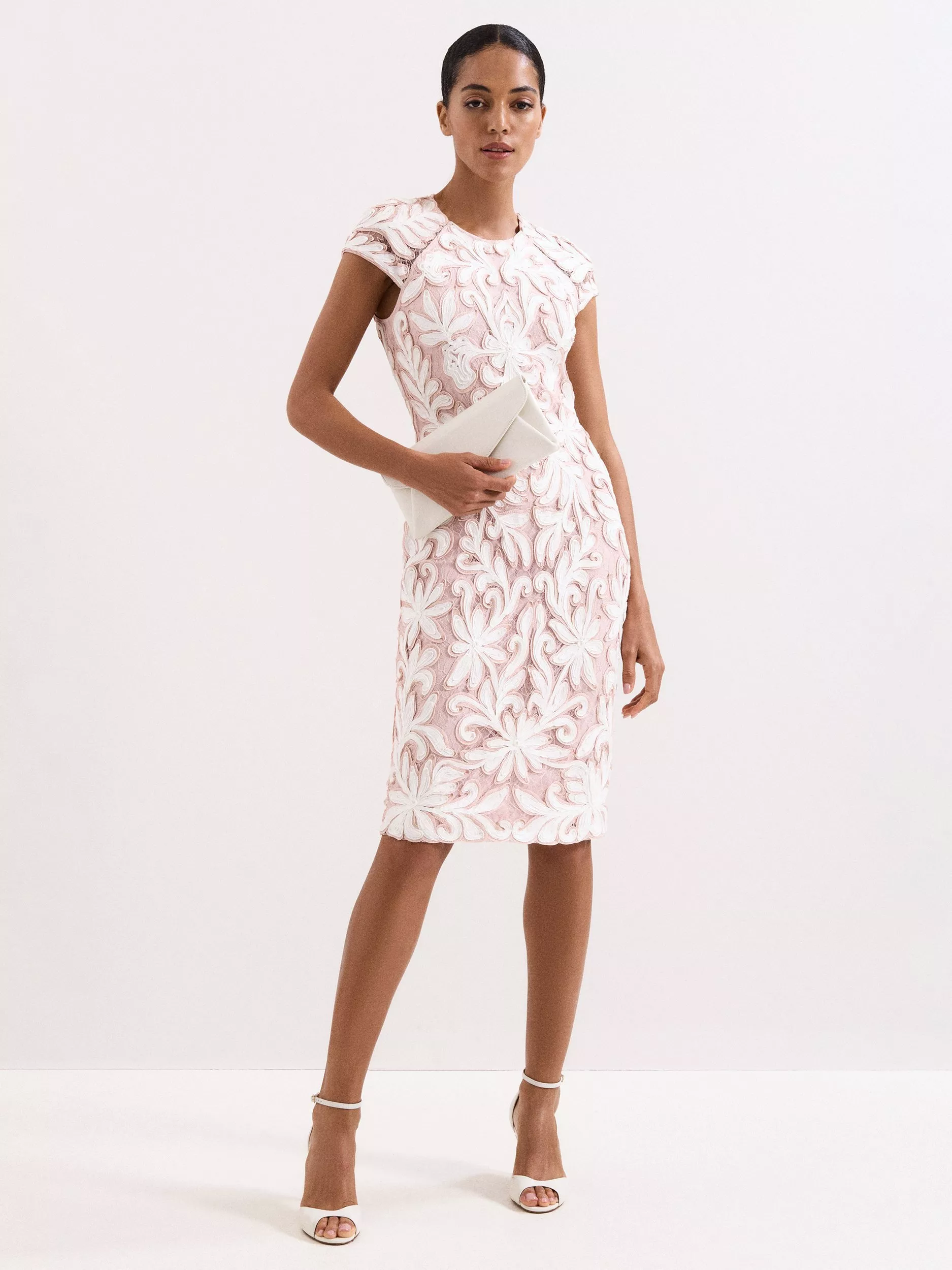 Designed with delicate tapework lace and a sleeveless silhouette, the Karima dress from Phase Eight features a round neck and an open back detailing for an event-ready look.