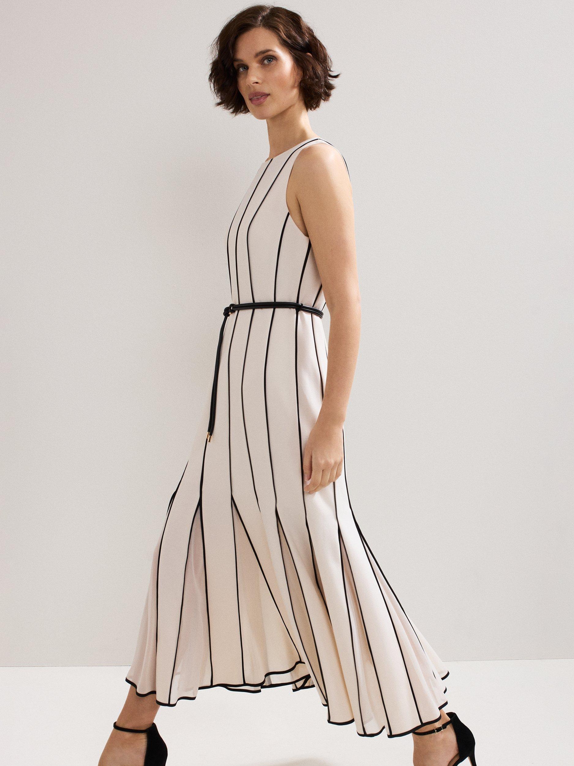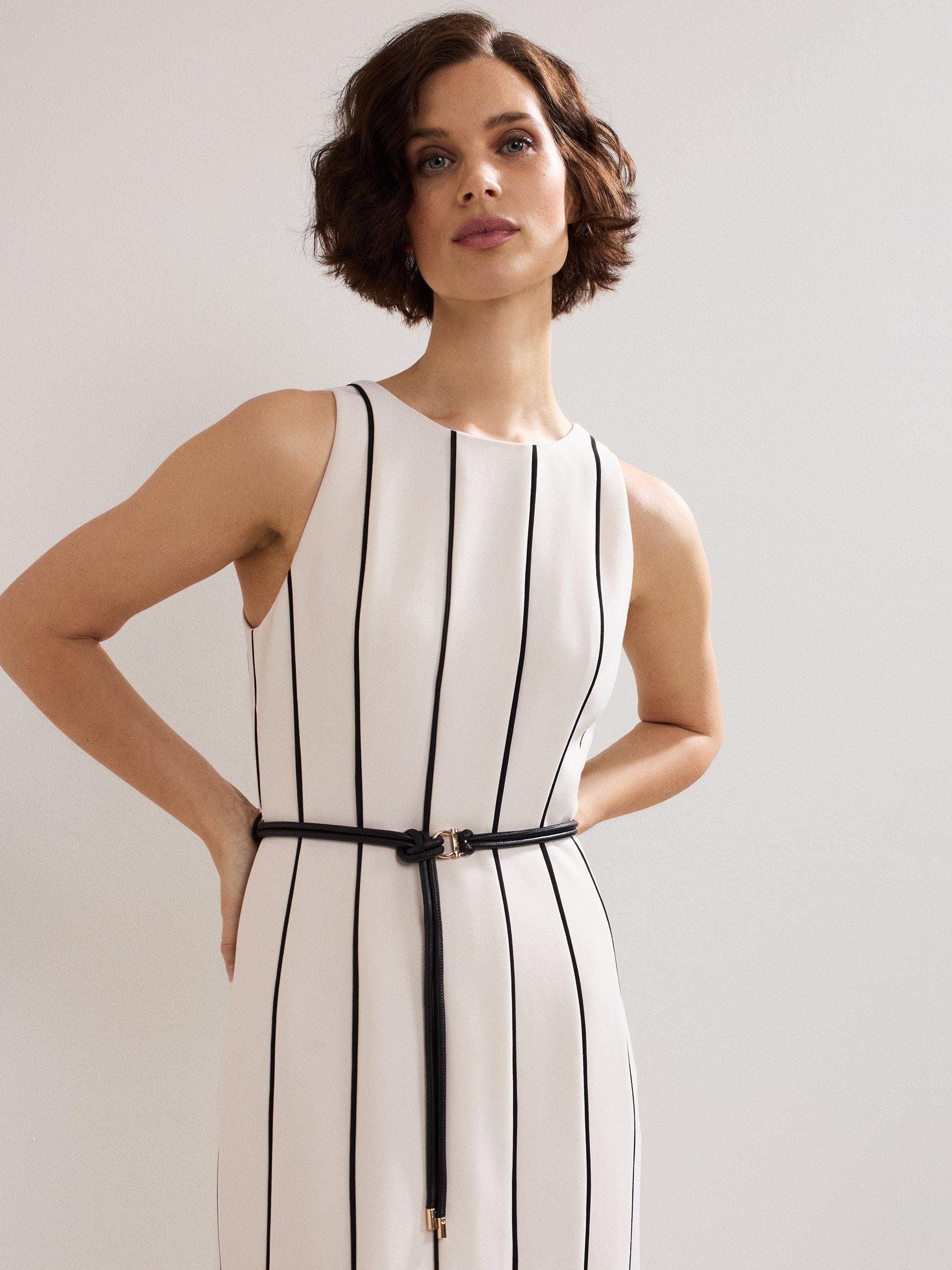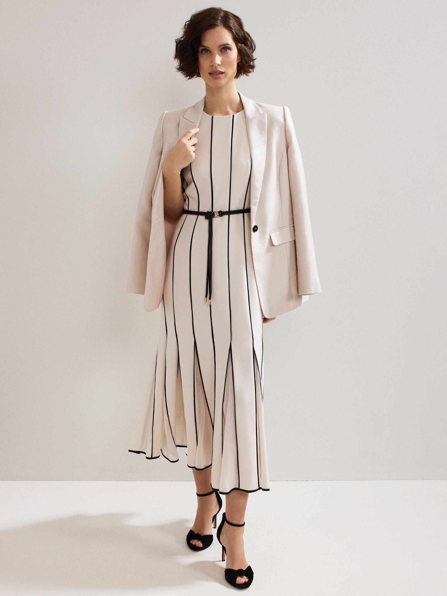 Simplified elegance at its finest, meet the Kimberley dress. The piped detail contrasts dramatically and adds structure to the midi silhouette for a flattering fit, finished with a contemporary belt detail with metal accents. Subtle pleating at the hem creates beautiful fluid movement that elevates the style. No matter the event, this dress will see you through this season and beyond.