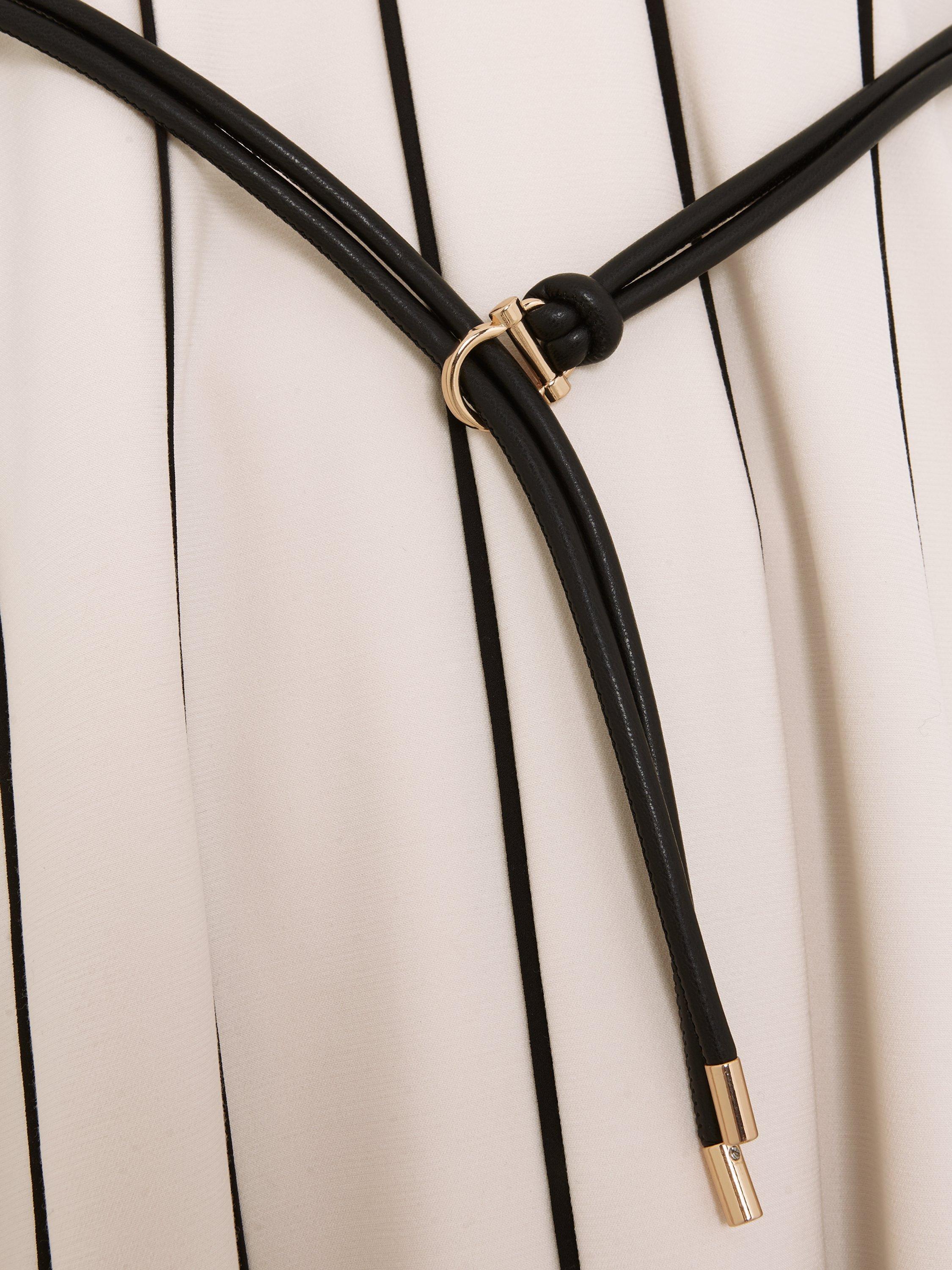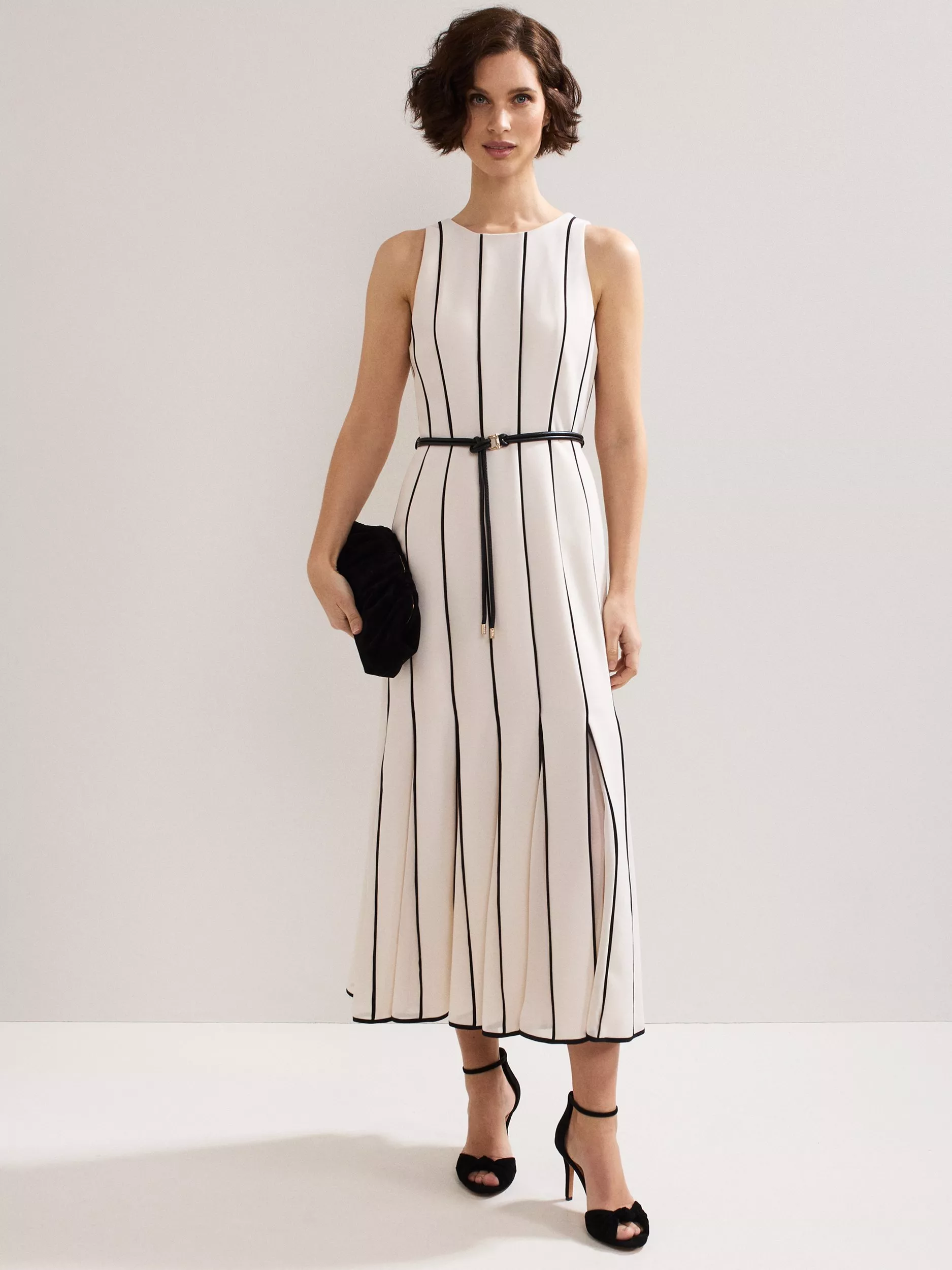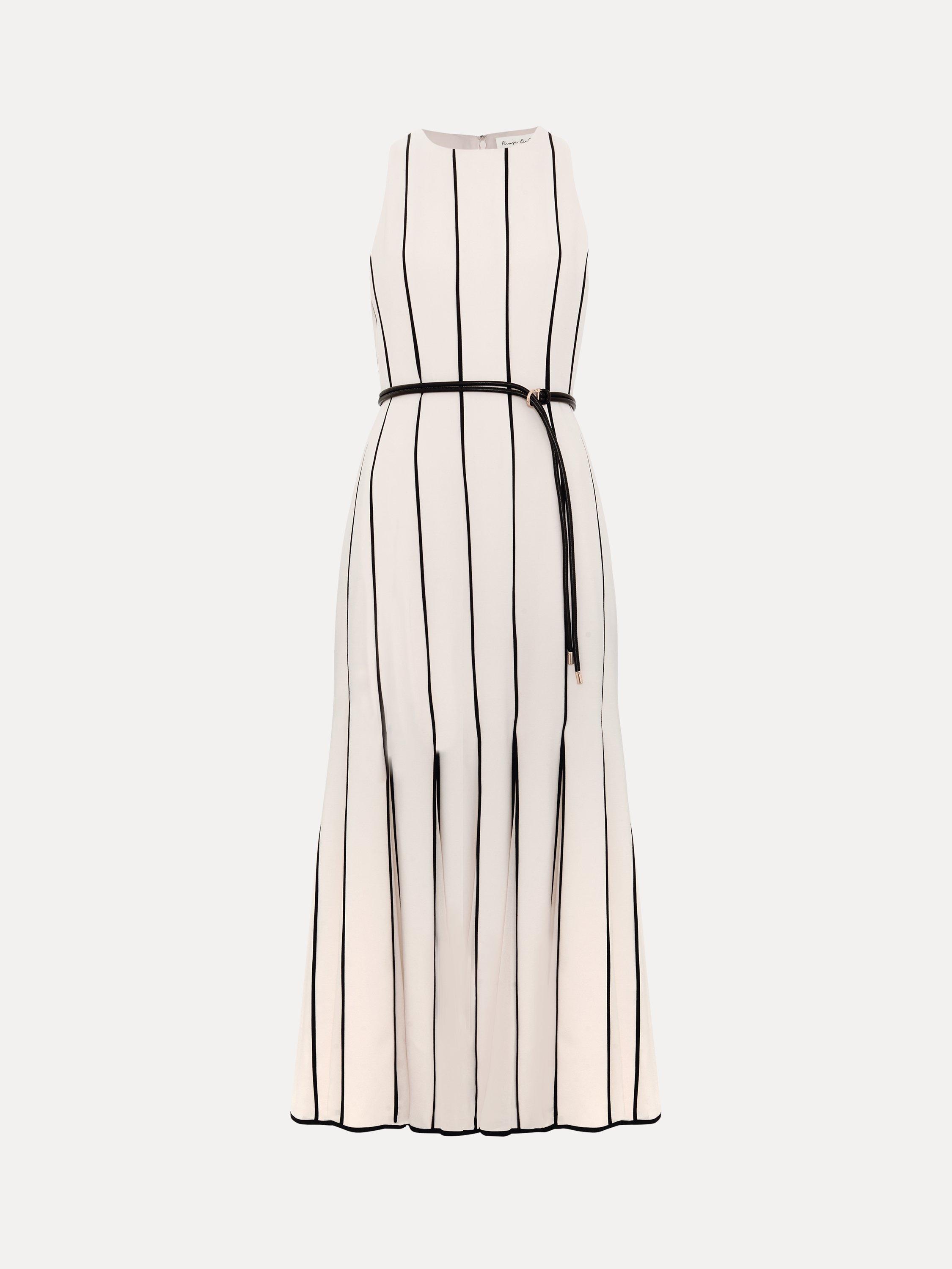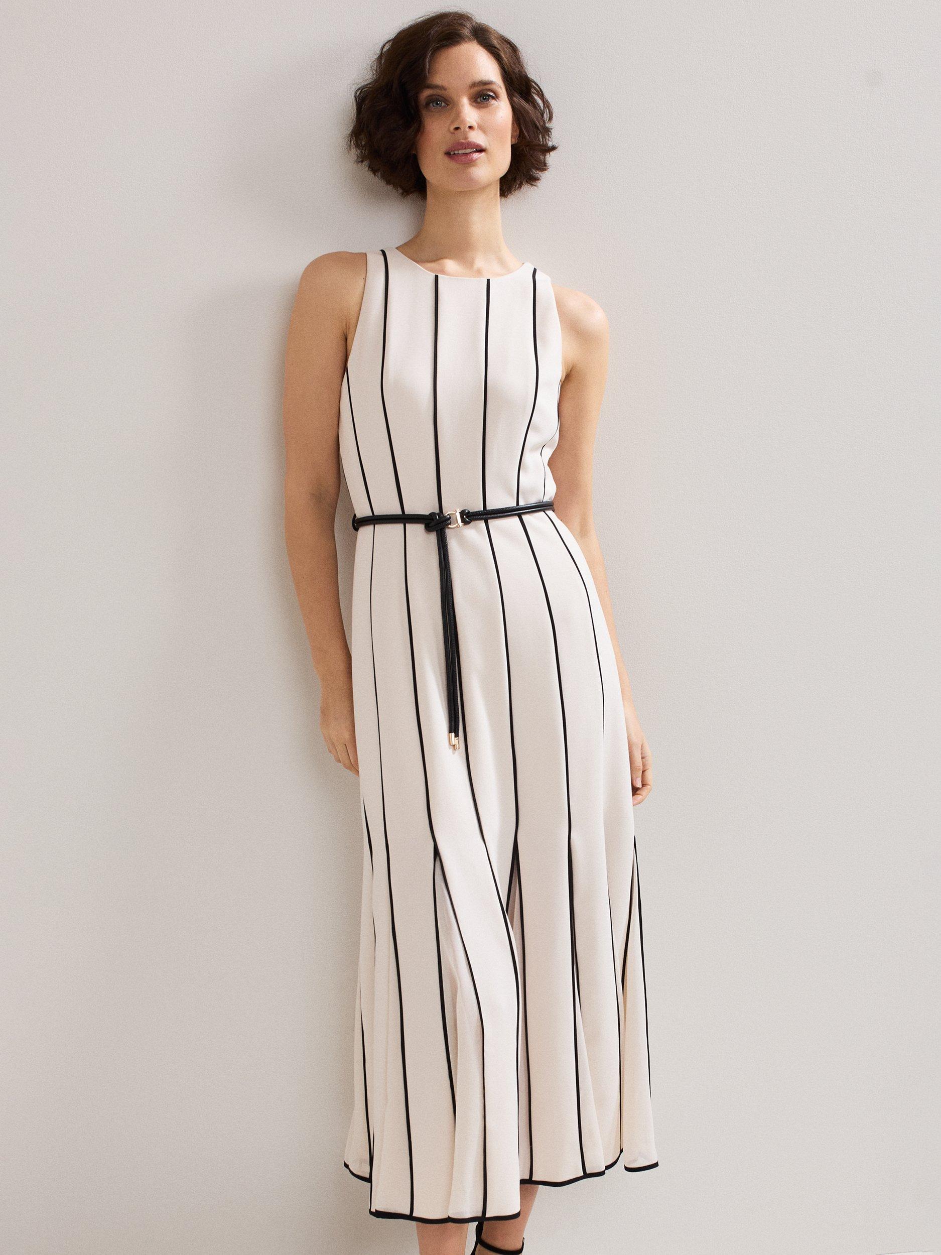 Simplified elegance at its finest, meet the Kimberley dress. The piped detail contrasts dramatically and adds structure to the midi silhouette for a flattering fit, finished with a contemporary belt detail with metal accents. Subtle pleating at the hem creates beautiful fluid movement that elevates the style. No matter the event, this dress will see you through this season and beyond.