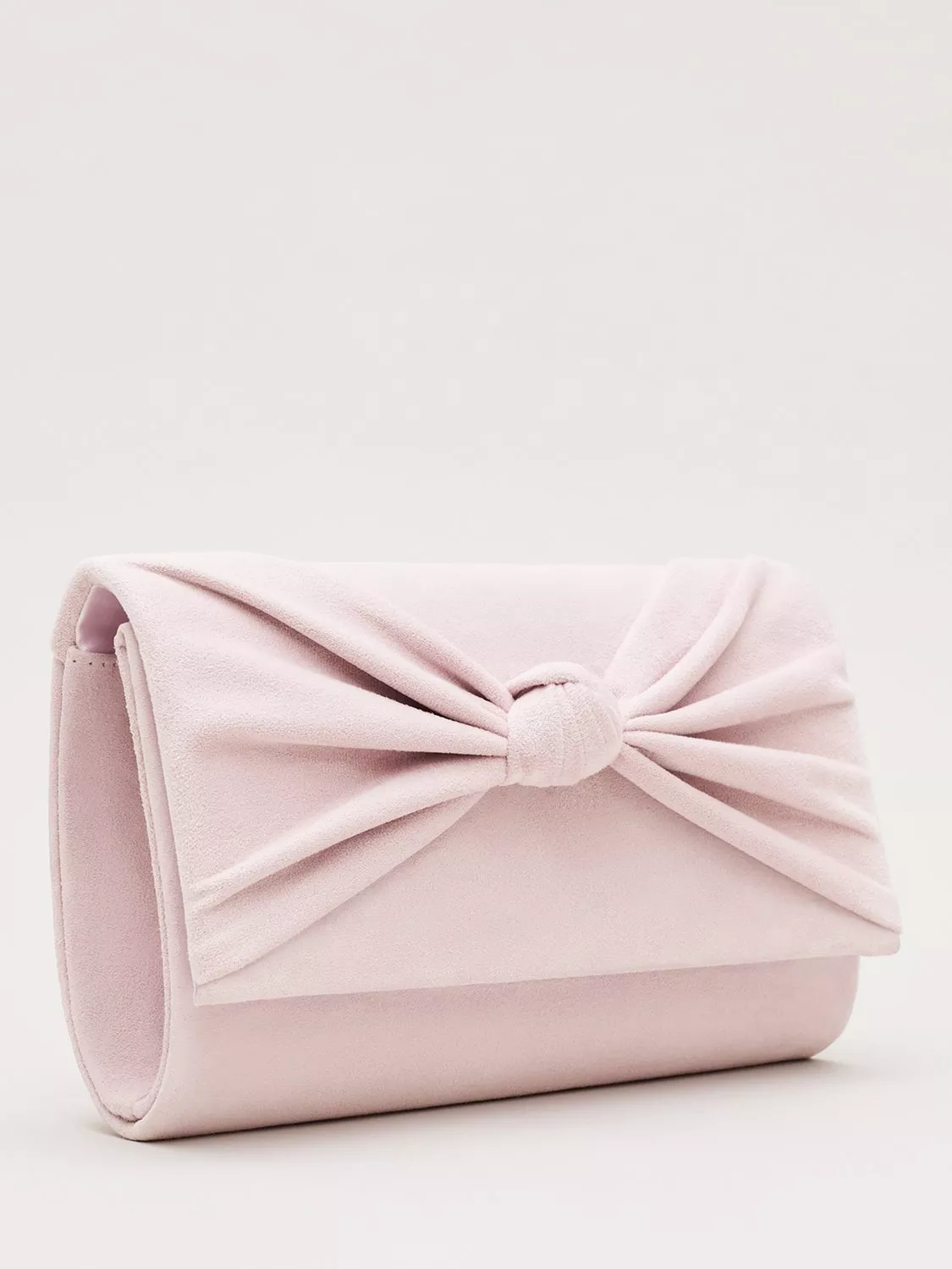 An elegant finishing touch for all your occasion styles. This pastel clutch is crafted from a soft suede material for a luxe feel and is finished with a feminine knot bow detail. The delicate chain allows for versatile styling and pairs perfectly with matching heels for a coordinated look.
