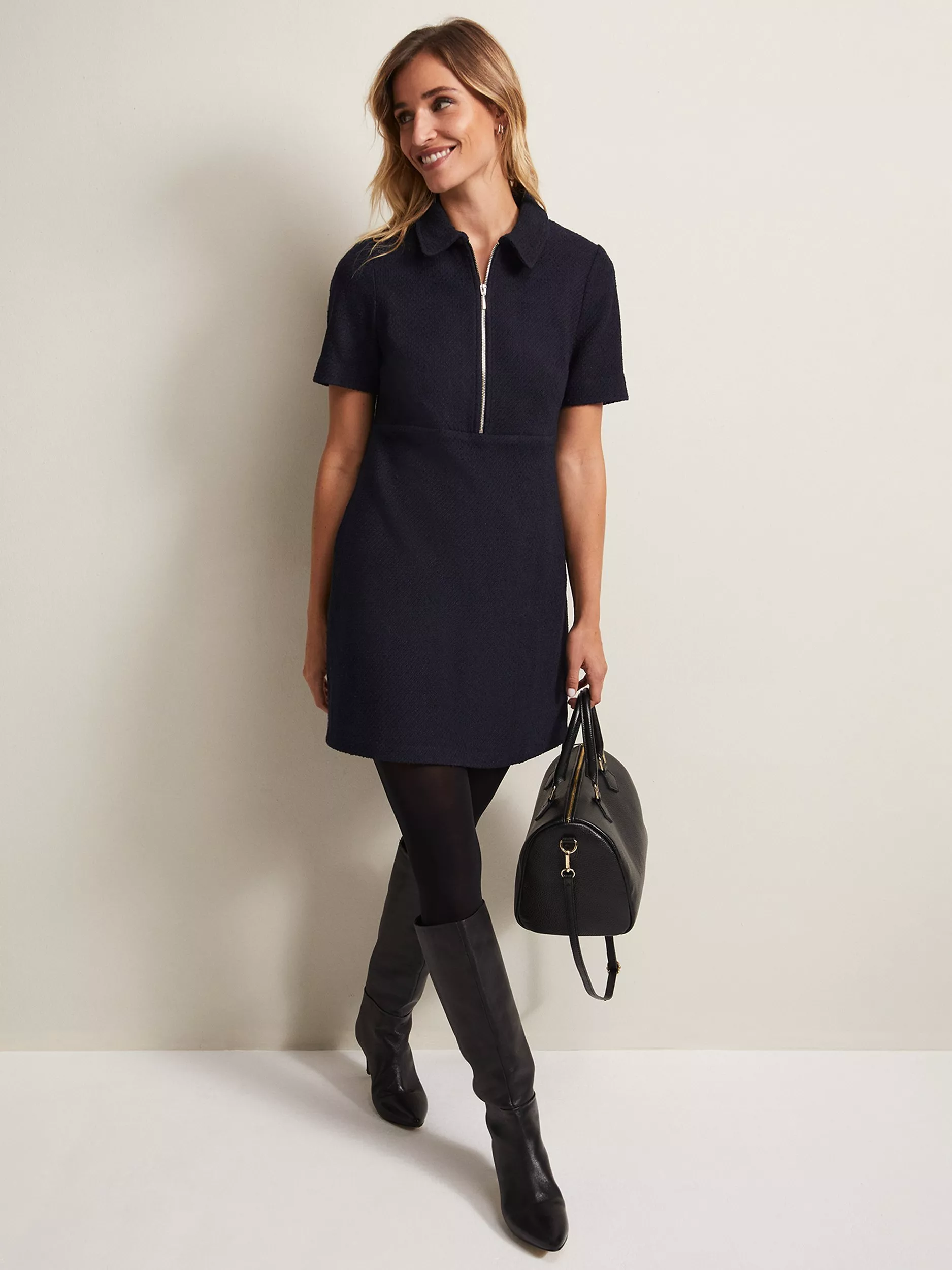 This is the must-have mini to transition into the autumn season. Designed with a classic collar zip down detail and short sleeves this tweed mini dress is perfectly styled with black tights and boots. Throw over a wool coat or blazer to add an extra layer of warmth to this autumnal look.