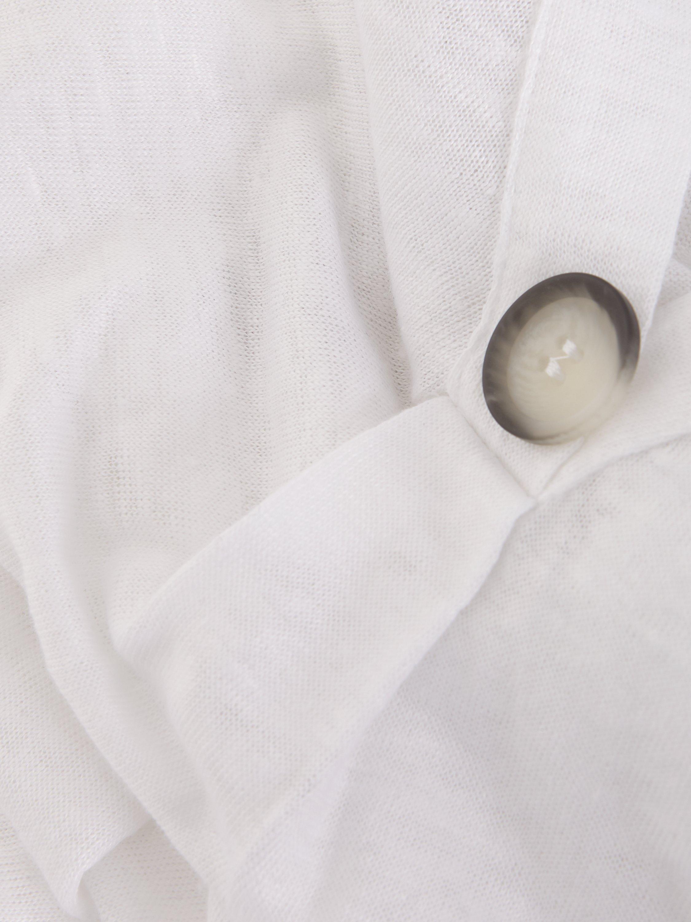 Classic in cut with a v-neckline and three-quarter length sleeves, it is lightweight and breathable in pure linen and is ideal when partnered with floaty midi skirts for summer days spent strolling around the city.